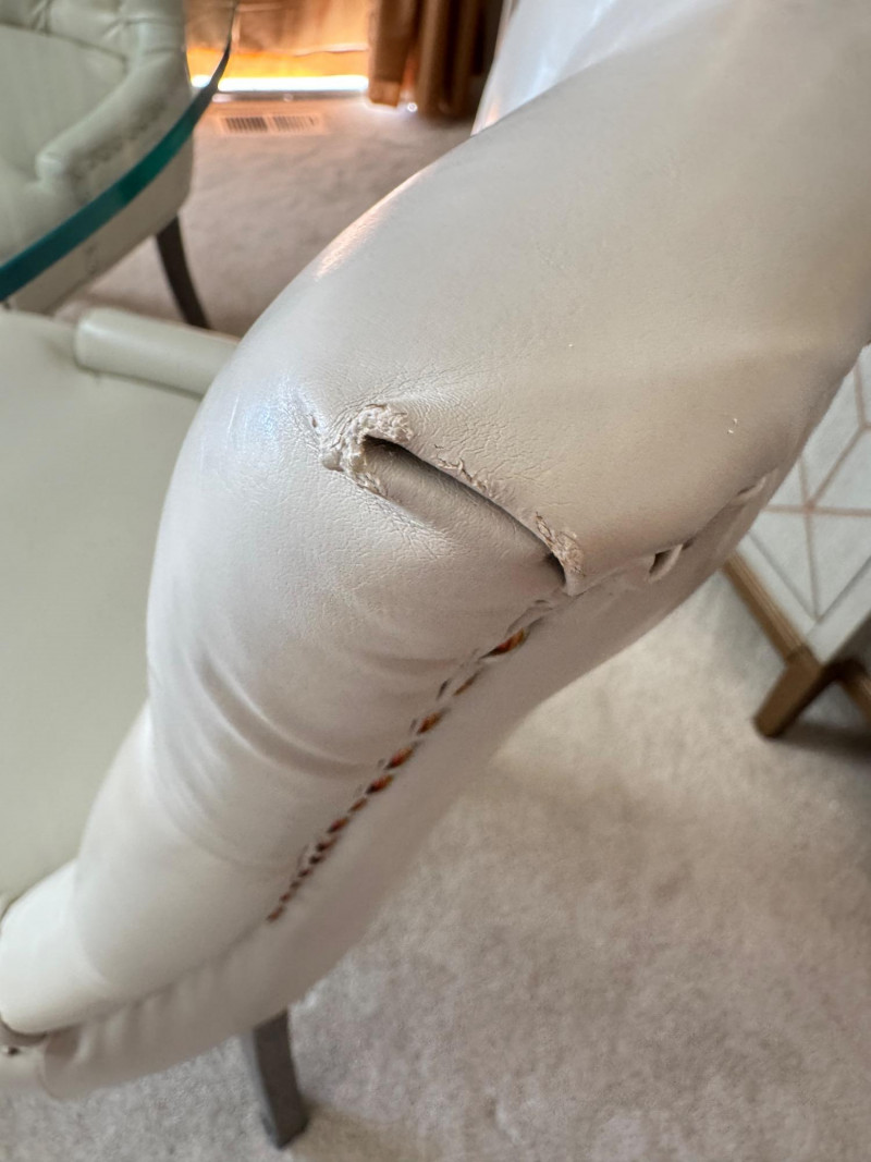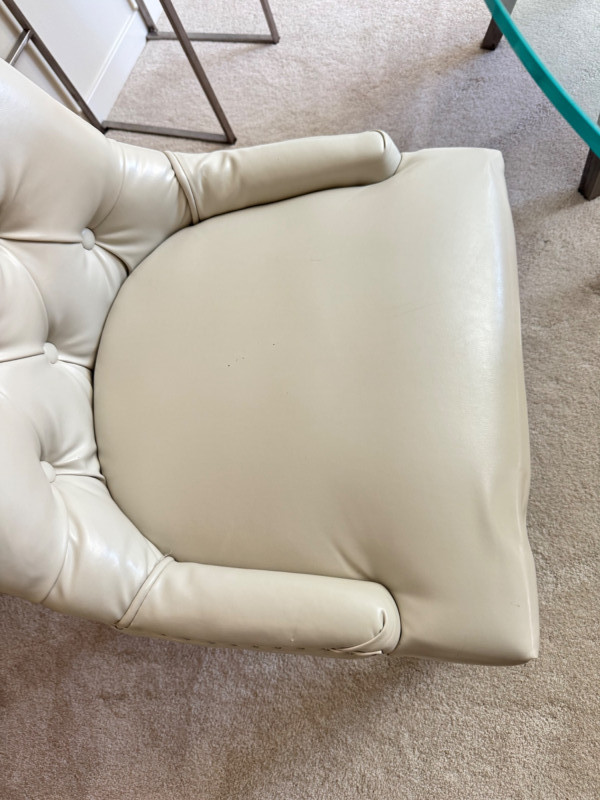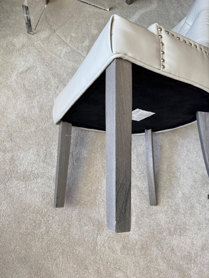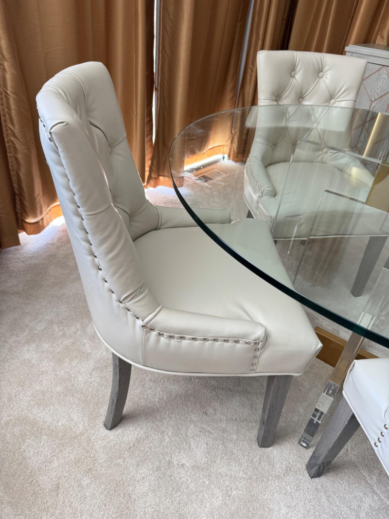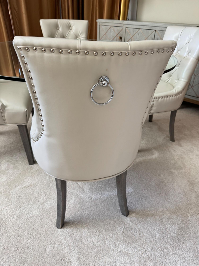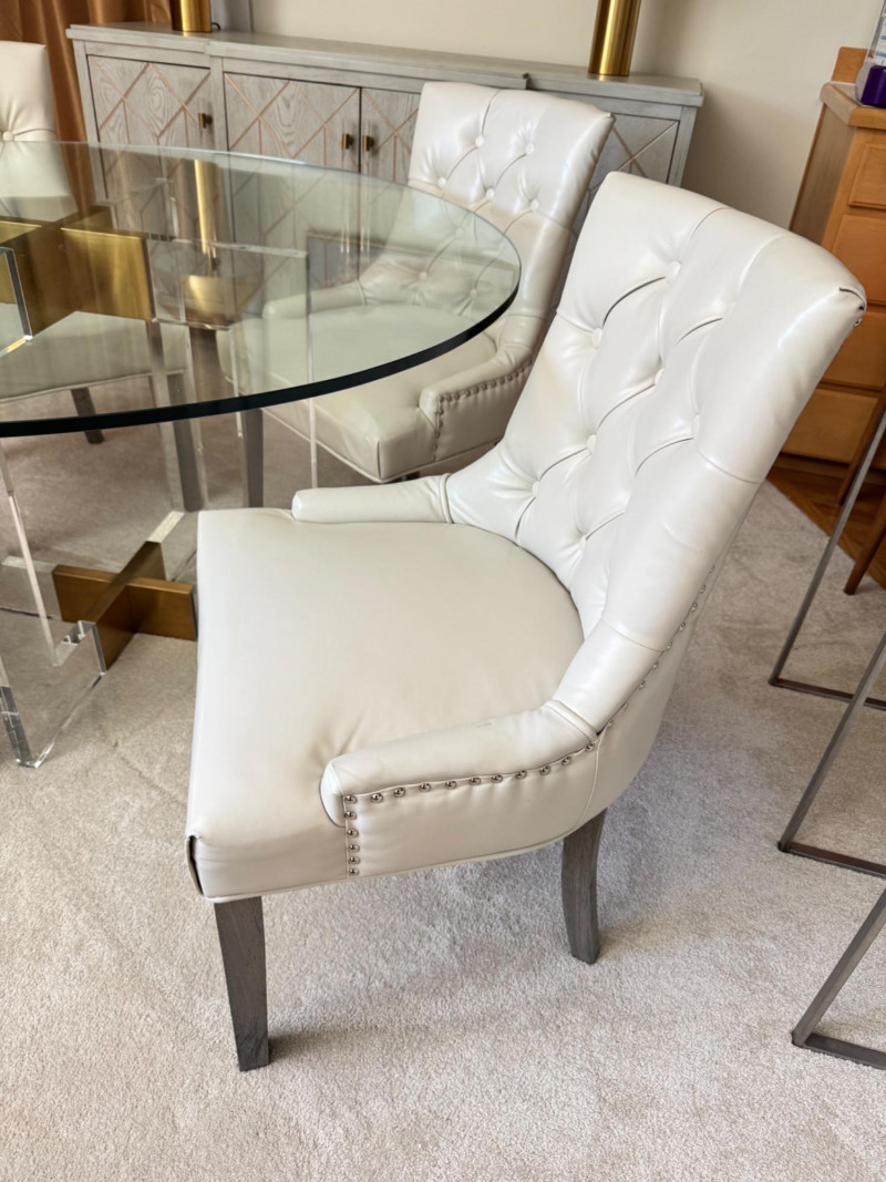 Glass Round Dining Table w/ 4 White Tufted Vinyl Chairs. Table Dimensions: Diameter: 53" Height: 30" Chair Dimensions (each): Width: 22" Depth: 20" Seat Height: 18" Back Height: 36" Disclaimer: Bidding on this lot is an agreement that: (1.) You will have at least 2 capable, able bodied persons to lift and load at a minimum. (2.) You will bring a hand truck and/or any other tools needed to remove this item. If these steps are not followed your item will be forfeit and no refund given. 🚚 Auction Pickup Reminder: