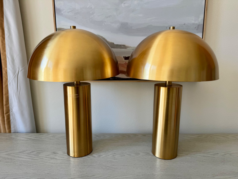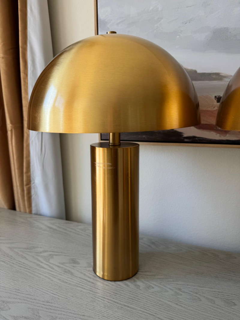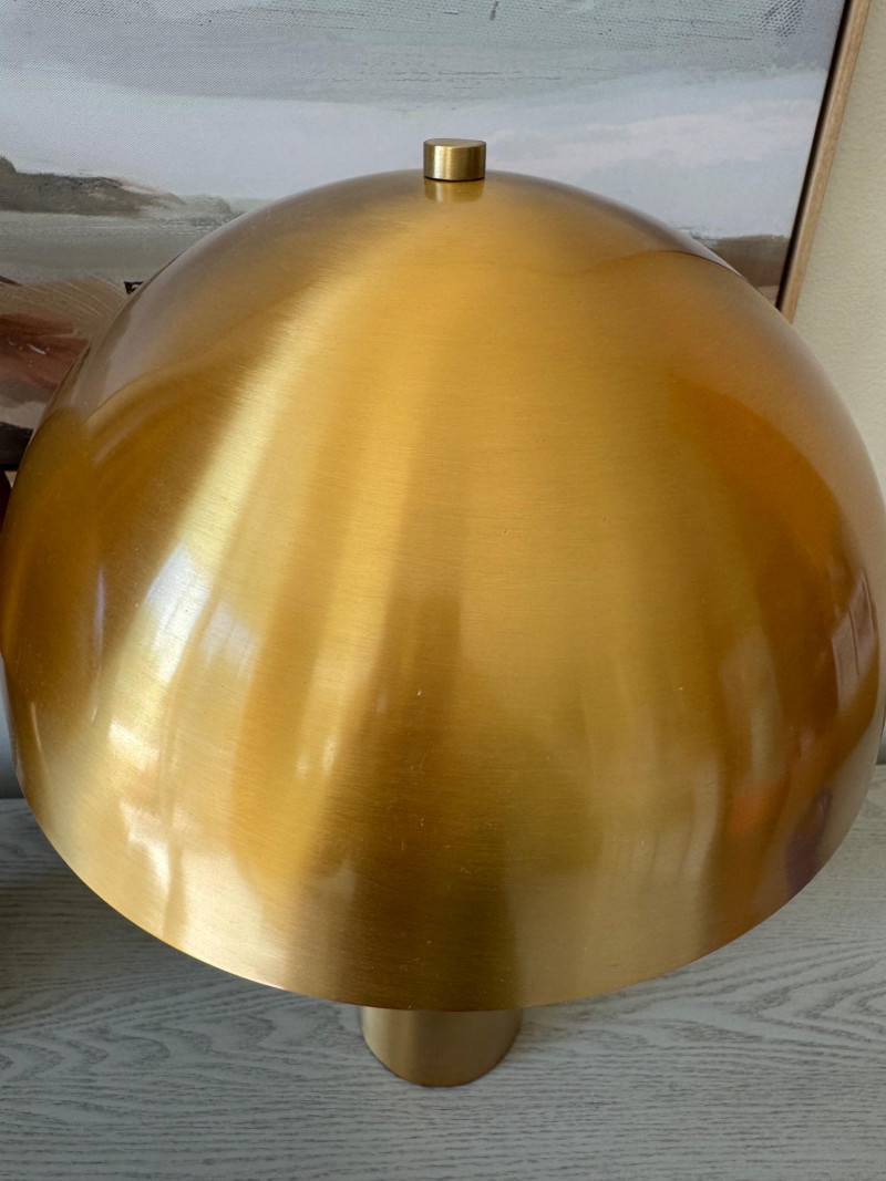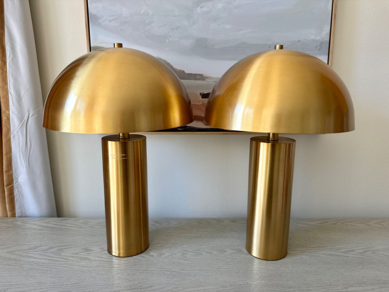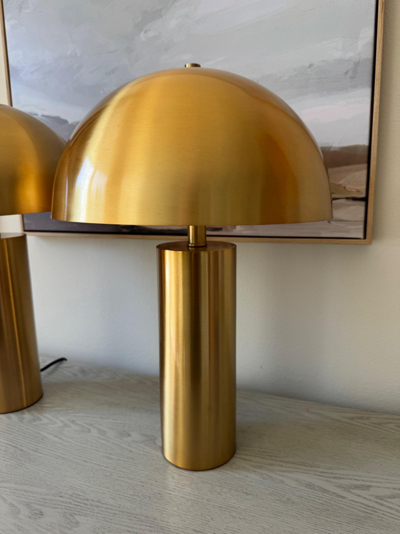 Pair of Gold-Tone Mushroom Table Lamps, Safavieh Iria Style. Dimensions (each): Height: 21" Diameter: 13" Disclaimer: 🚚 Auction Pickup Reminder: