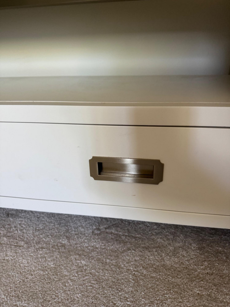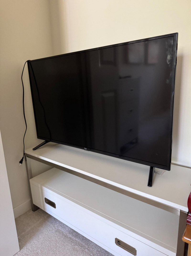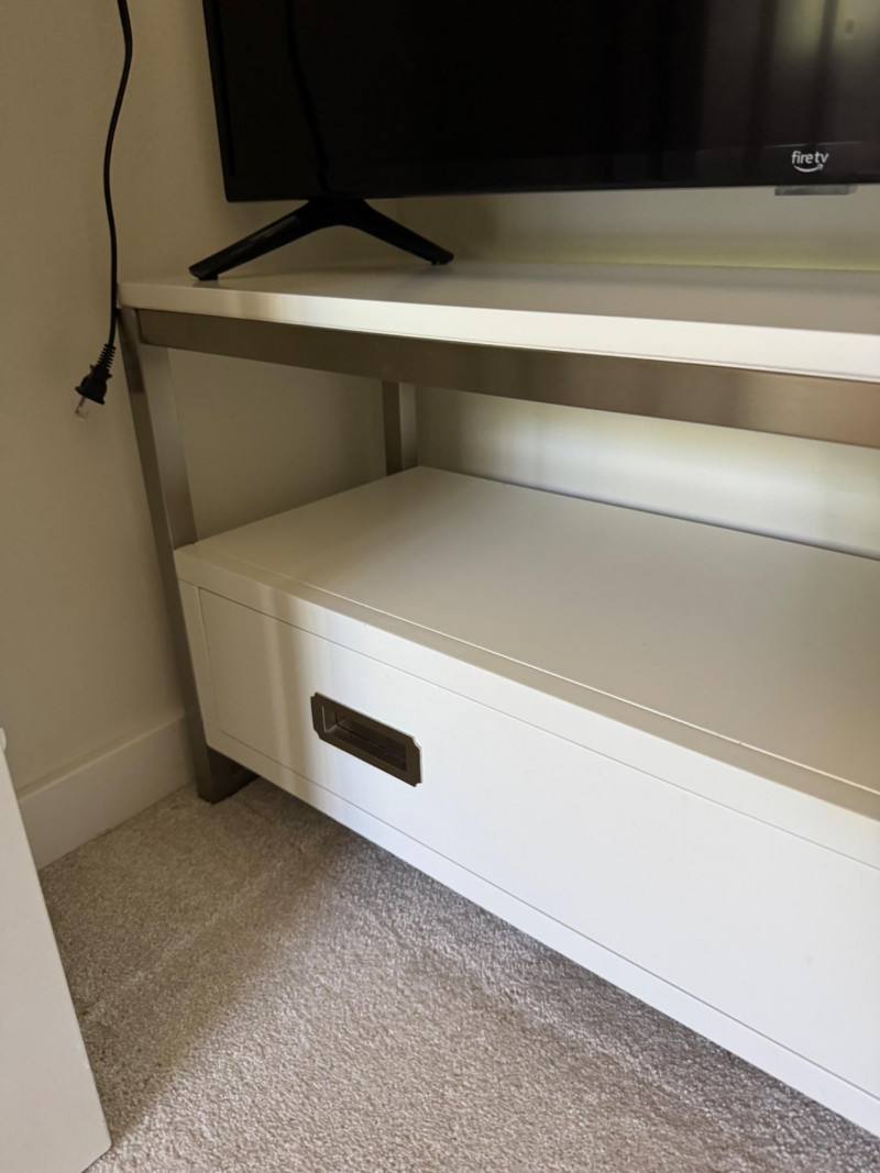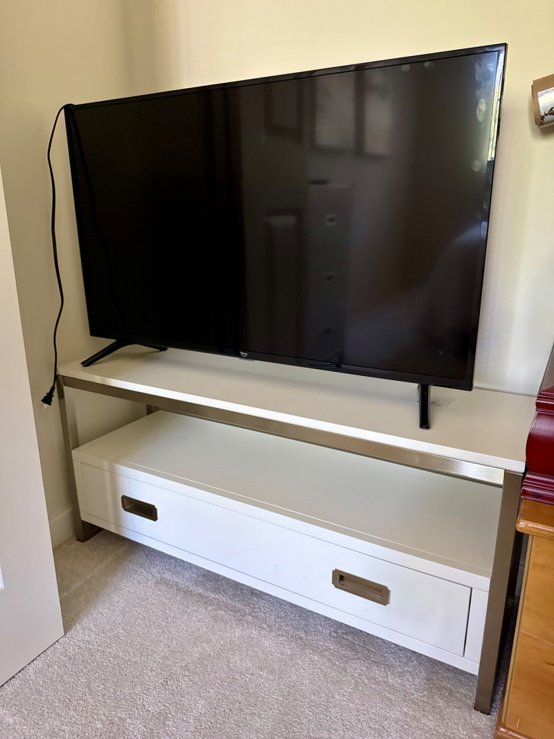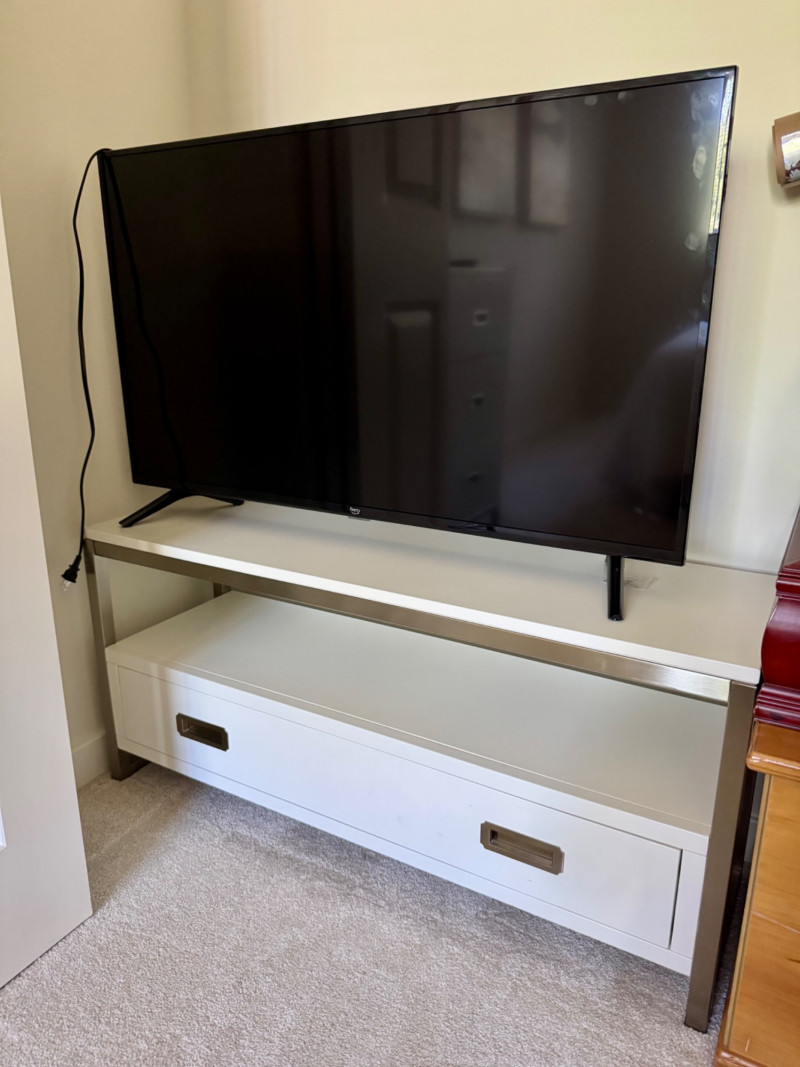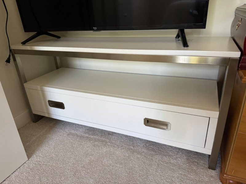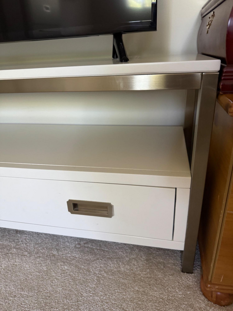 Amazon Fire TV (40”) & White TV Stand w/ Drawer & Metal Trim. White media stand: 39.5" W x 12" D x 18.5" H Bidding on this lot is an agreement that: (1.) You will have at least 2 capable, able bodied persons to lift and load at a minimum. (2.) You will bring a hand truck and/or any other tools needed to remove this item. If these steps are not followed your item will be forfeit and no refund given. 🚚 Auction Pickup Reminder: