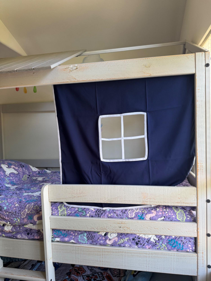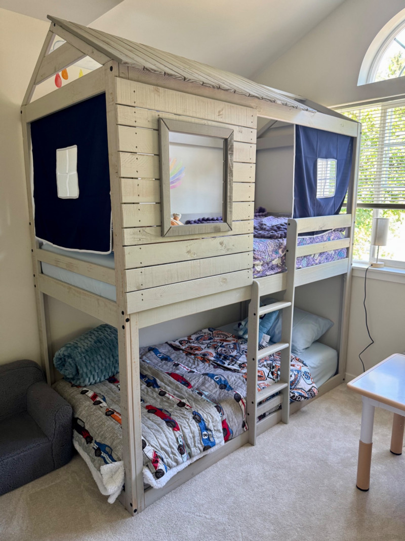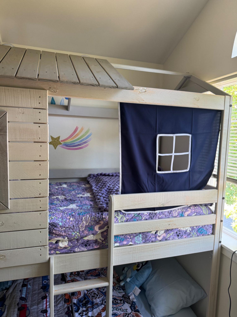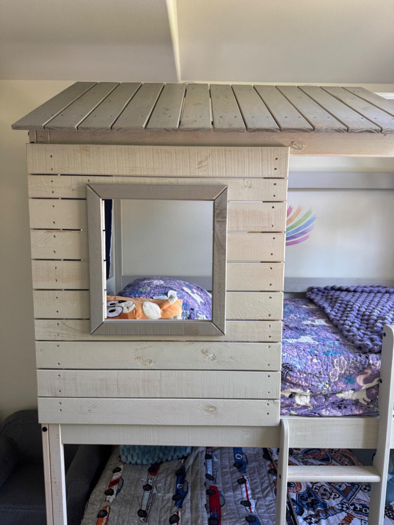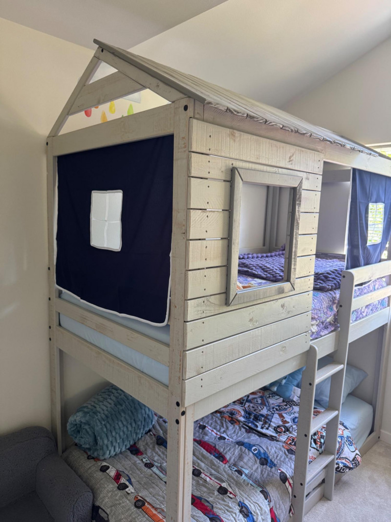 Rustic Kids Playhouse Bunk Bed w/ 2 Mattresses & Ladder Access. Details: Includes playhouse-style bunk frame with ladder and faux windows 2 twin-size mattresses included (bedding not included) 🚚 Auction Pickup Reminder: