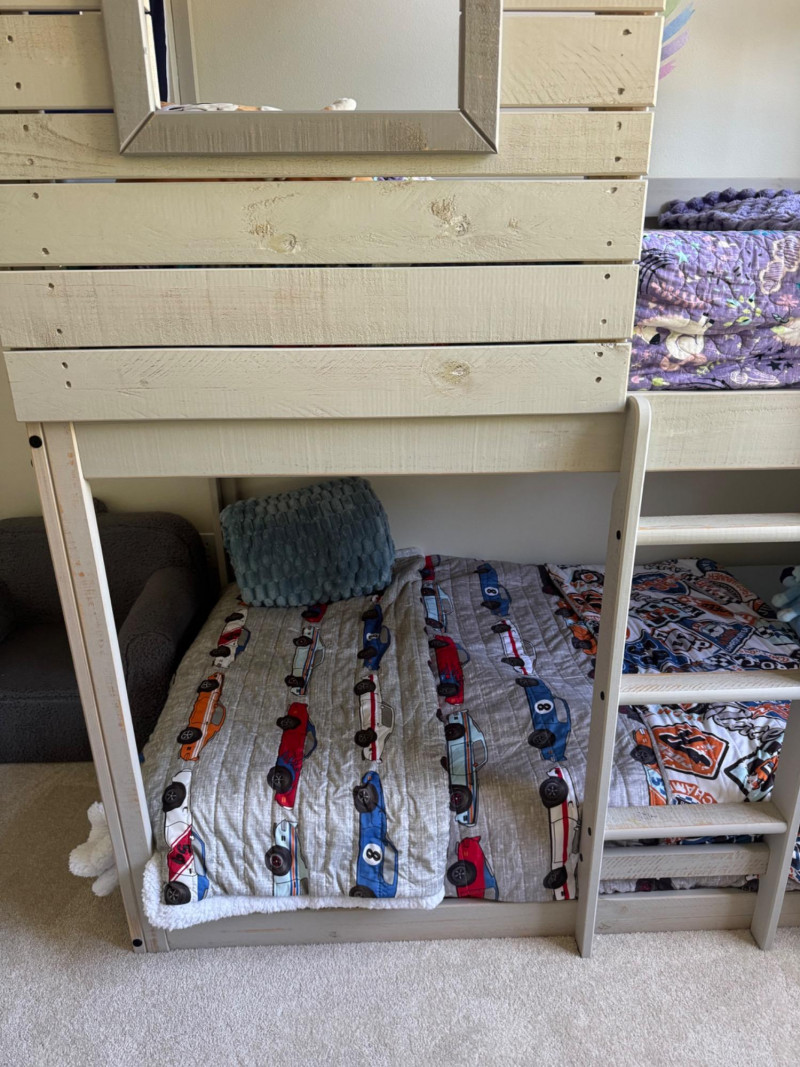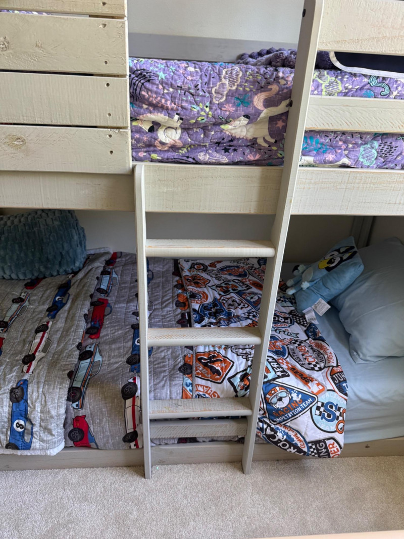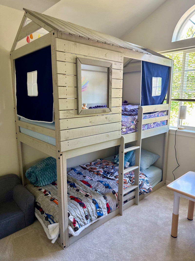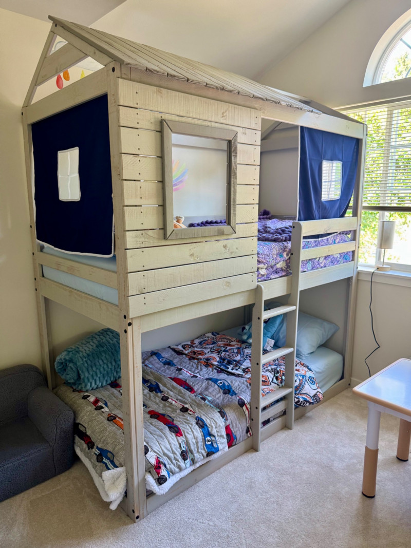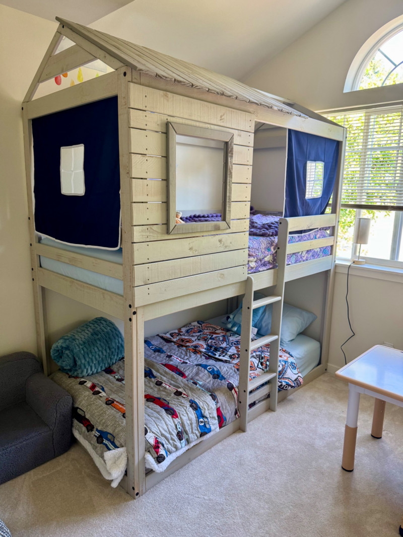 Rustic Kids Playhouse Bunk Bed w/ 2 Mattresses & Ladder Access. Details: Includes playhouse-style bunk frame with ladder and faux windows 2 twin-size mattresses included (bedding not included) 🚚 Auction Pickup Reminder: