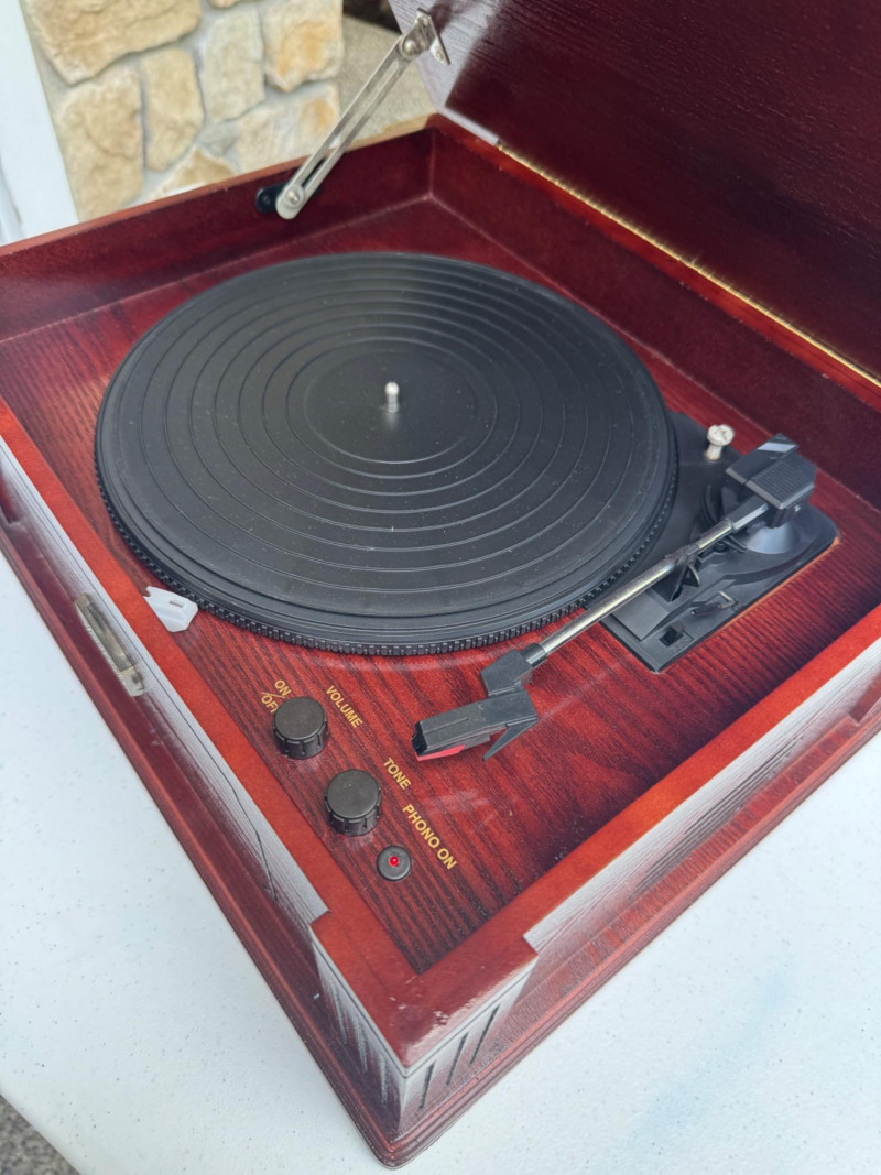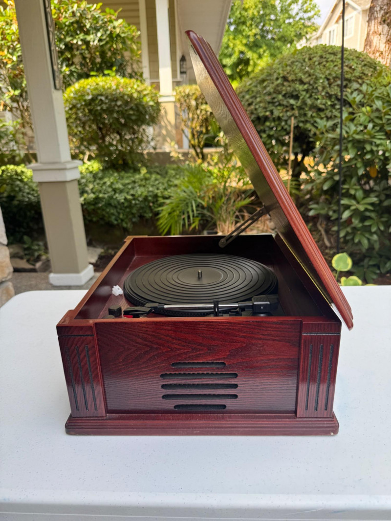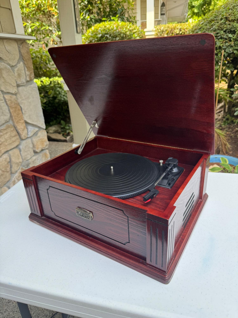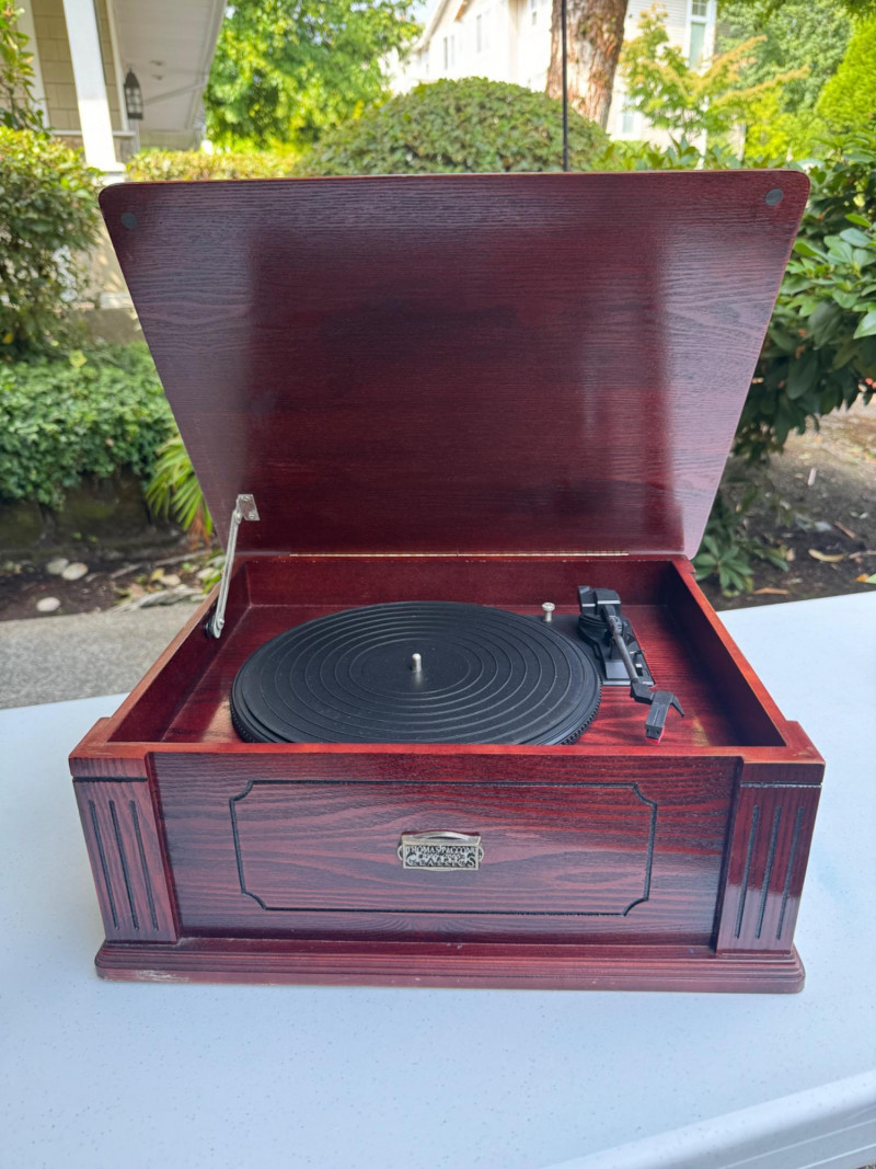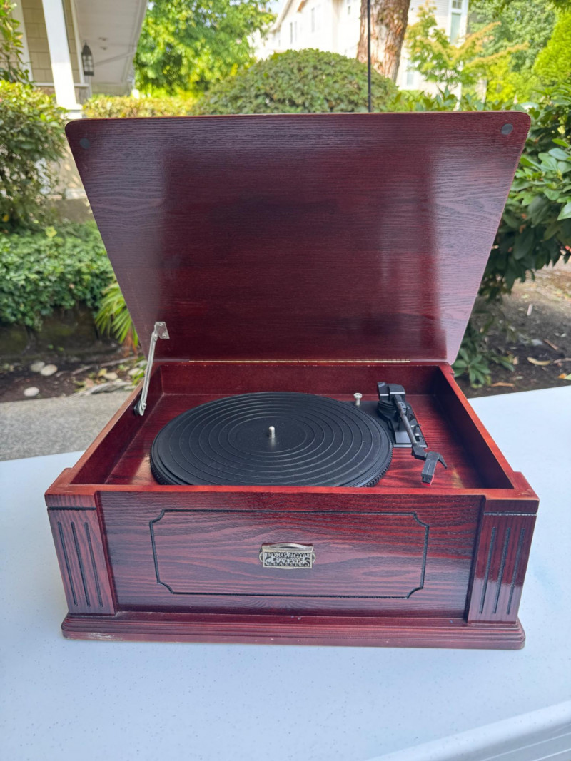 Vintage-Style Thomas Pacconi Classics Turntable in Wood Case. Dimensions: 17.5" W x 14" D x 7" H