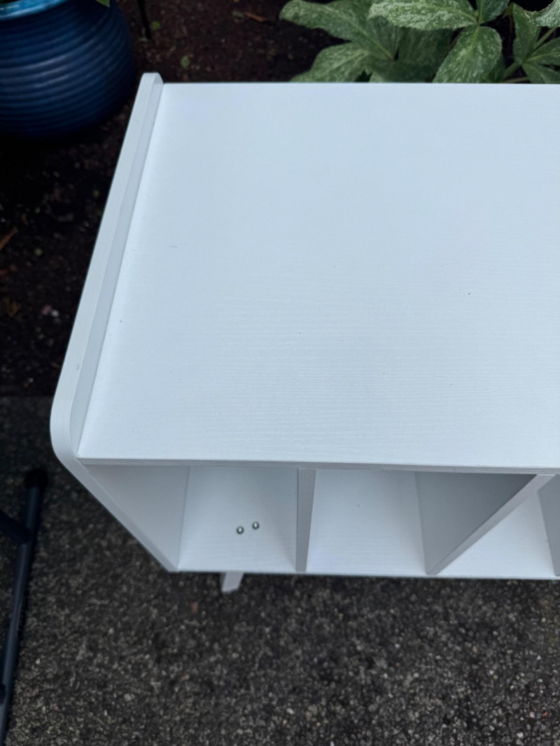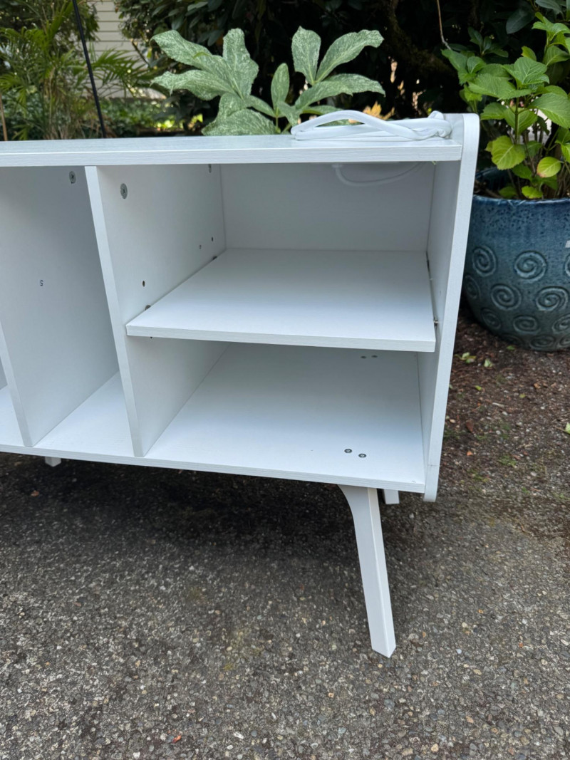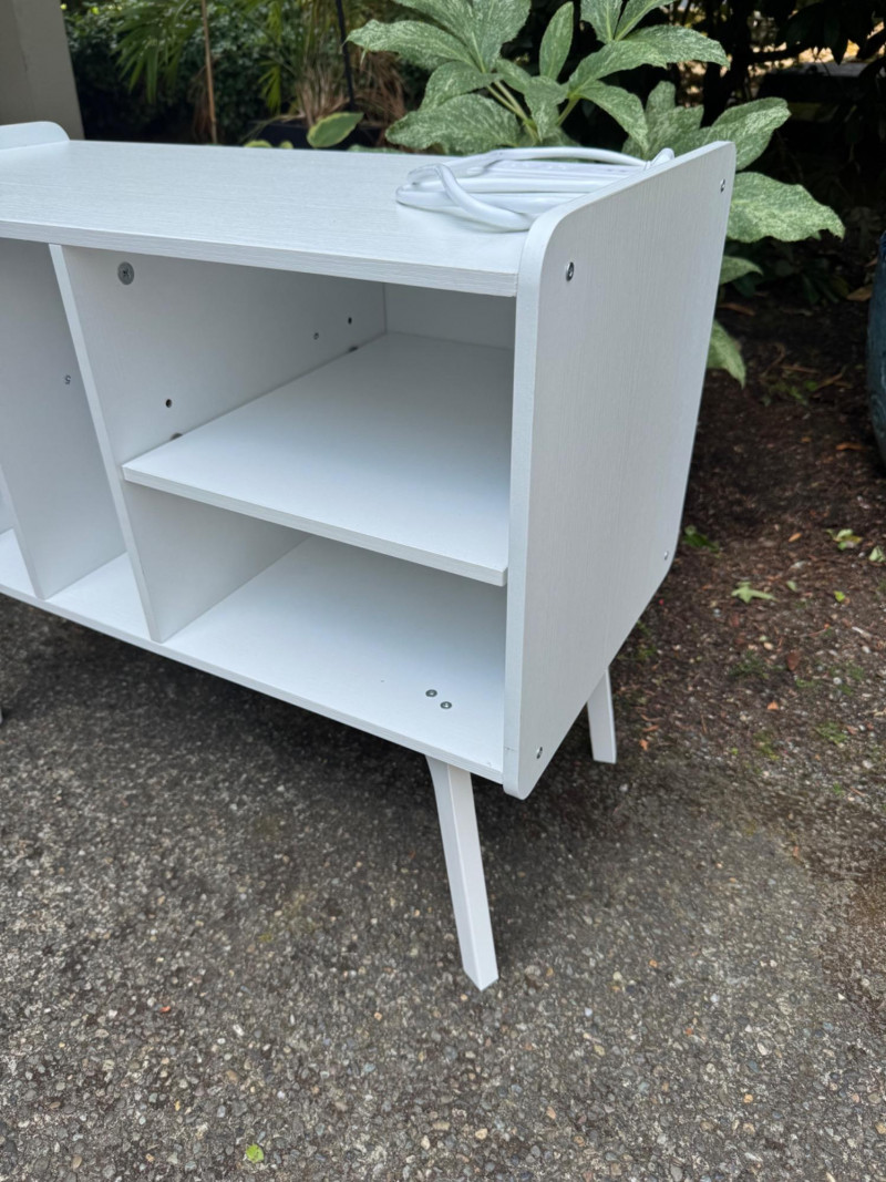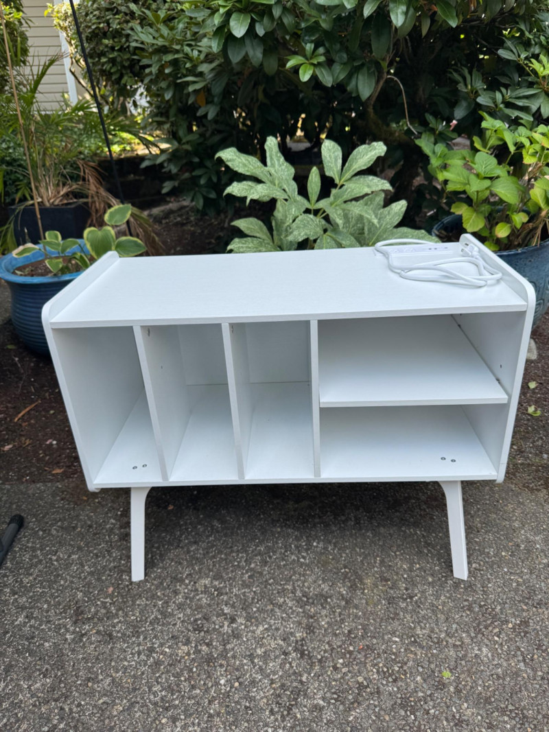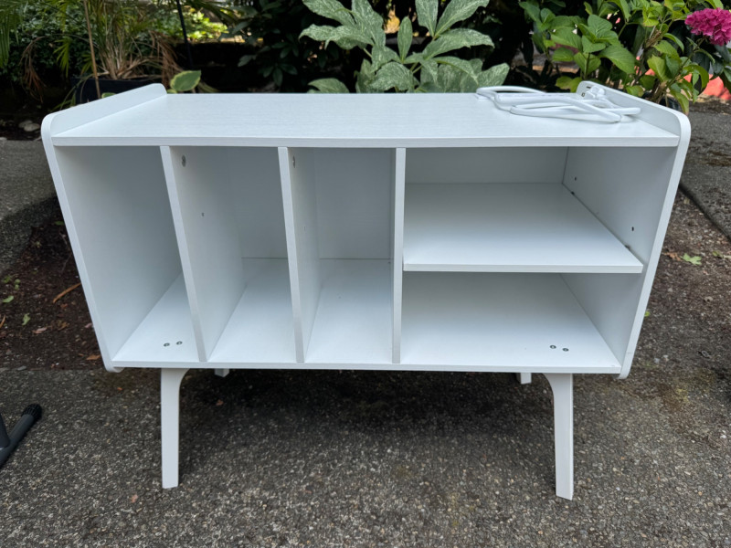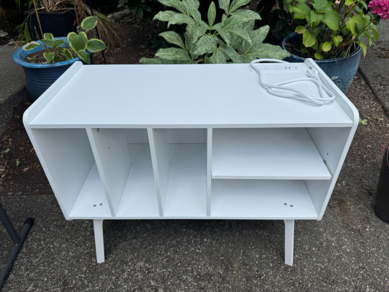 White Turntable Stand w/ Vinyl Record Storage & Power Outlets. Dimensions: 32" W x 15.5" D x 25.5" H
