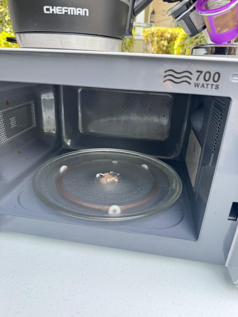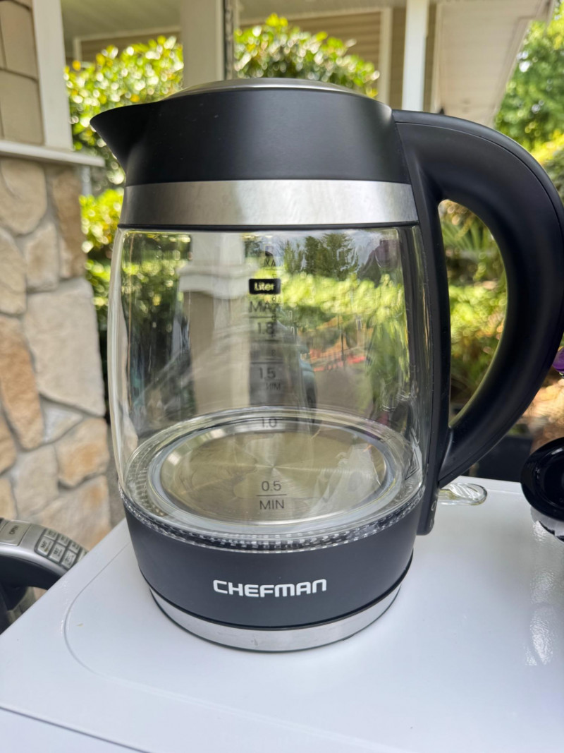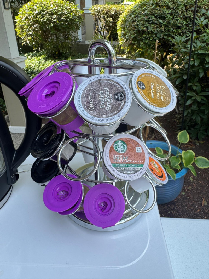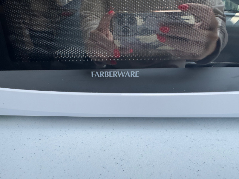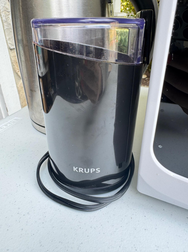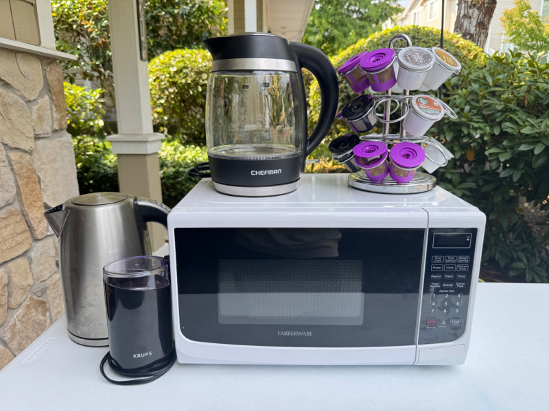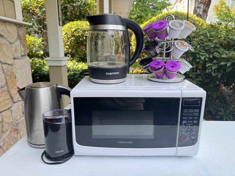 Farberware Microwave + Kettles, Grinder & Coffee Pod Rack Lot. Farberware microwave (approx. 17” W x 10” H x 11” D) Chefman glass electric kettle (1.7L) Cuisinart electric kettle w/ temperature presets (1.7L) Krups coffee/spice grinder Chrome K-Cup pod carousel w/ assorted pods 🚚 Auction Pickup Reminder: