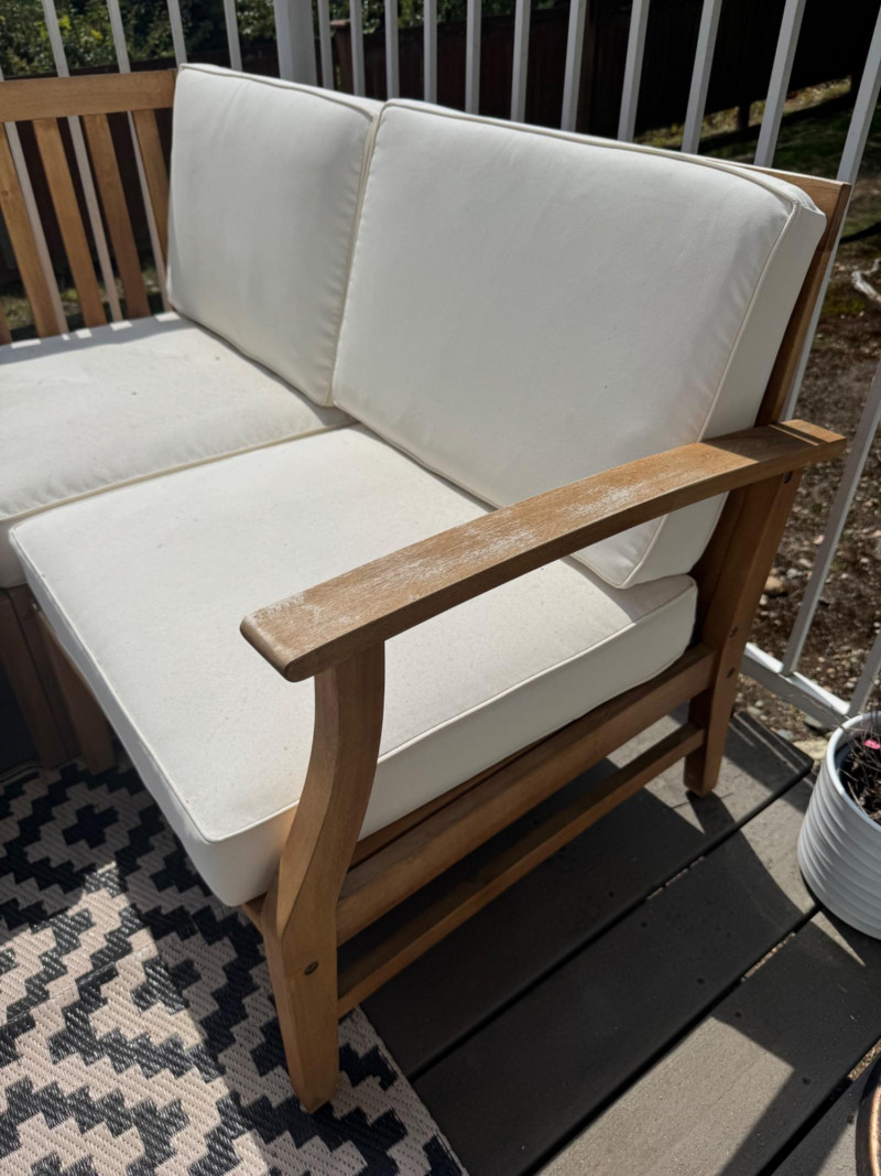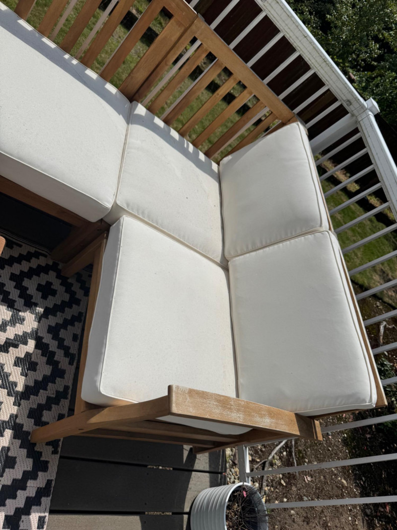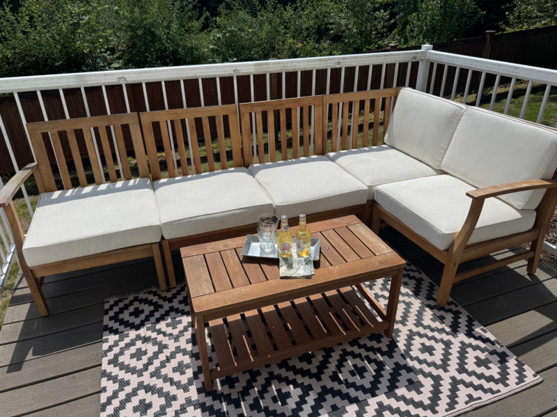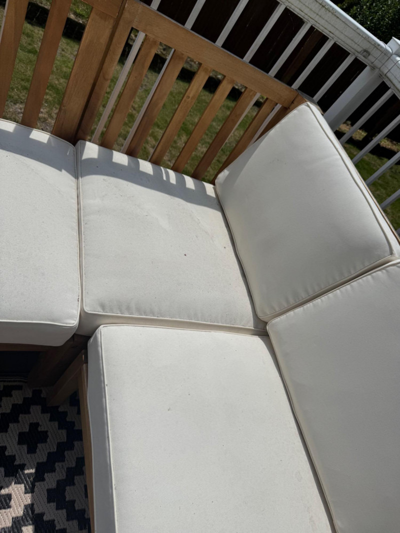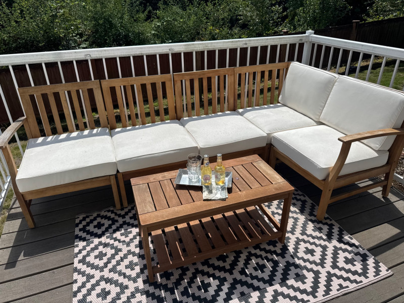 Outdoor L-Sectional Sofa & Table Set w/ White Cushions. Sectional: 104" long side, 54.5" short side 🚚 Auction Pickup Reminder: