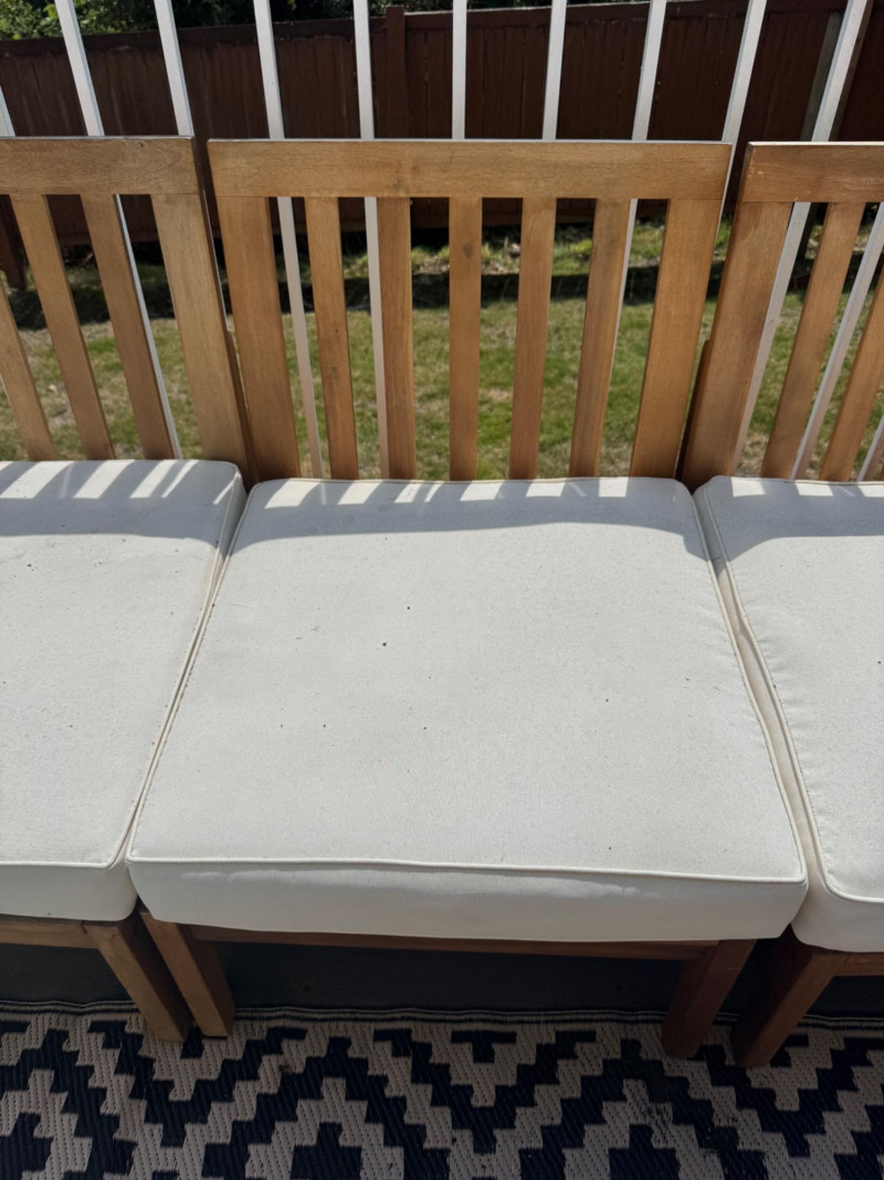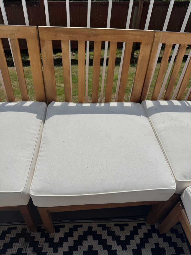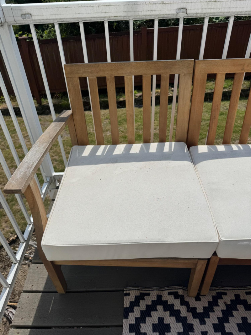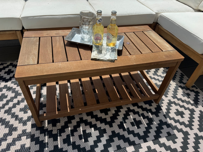 Outdoor L-Sectional Sofa & Table Set w/ White Cushions. Sectional: 104" long side, 54.5" short side 🚚 Auction Pickup Reminder: