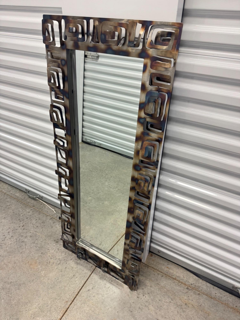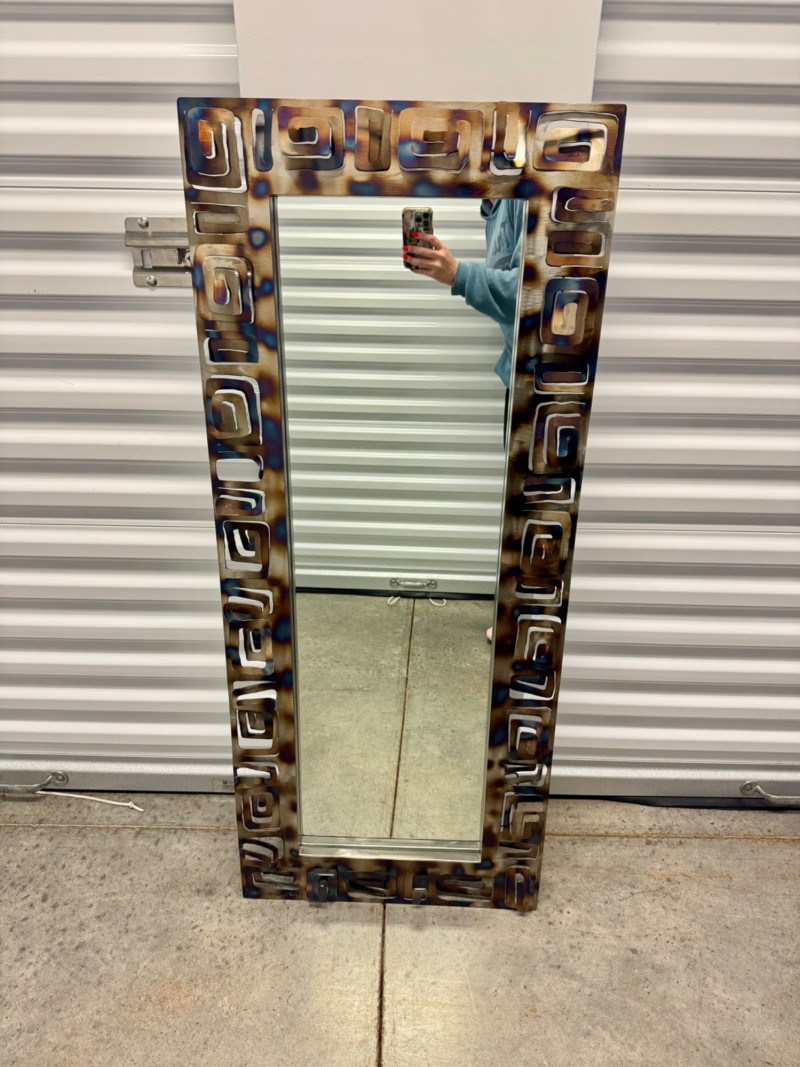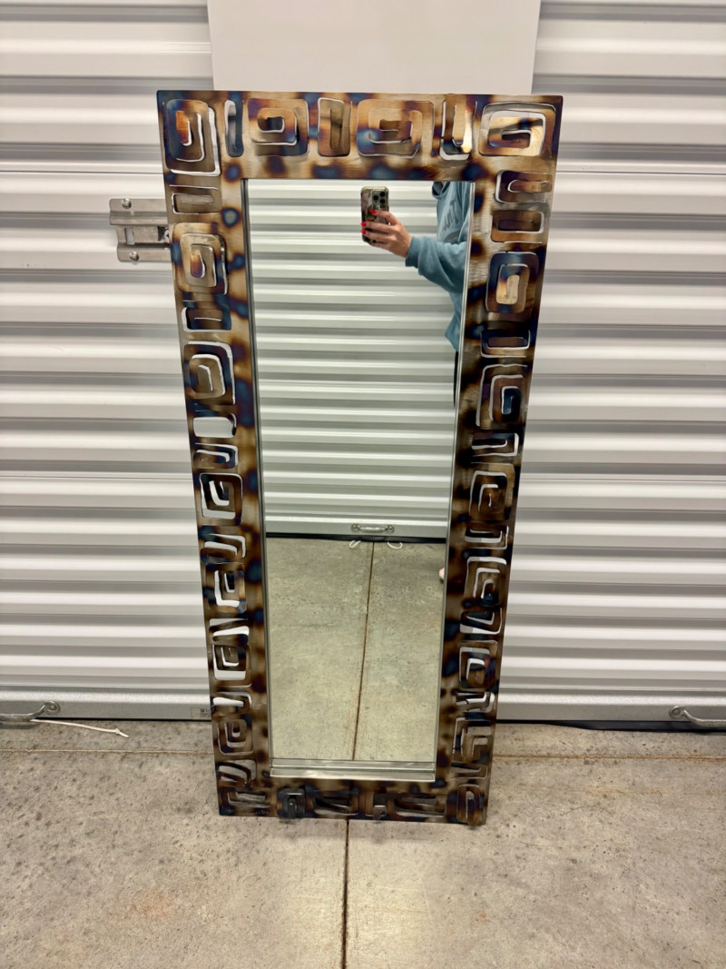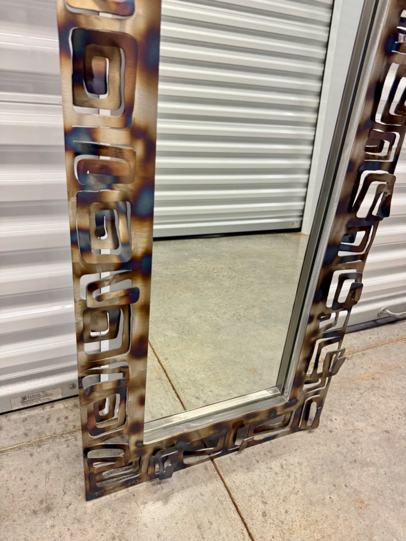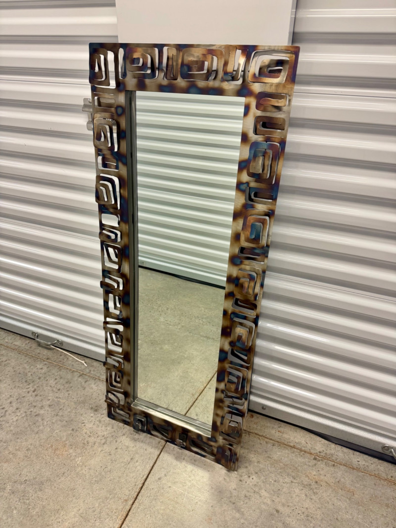 M. Brandon Signed Steel Cut Mirror w/ Heat-Treated Finish. Dimensions: 20” wide x 48” tall