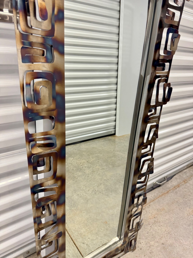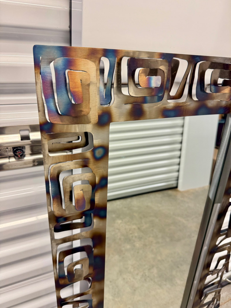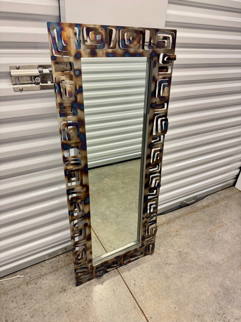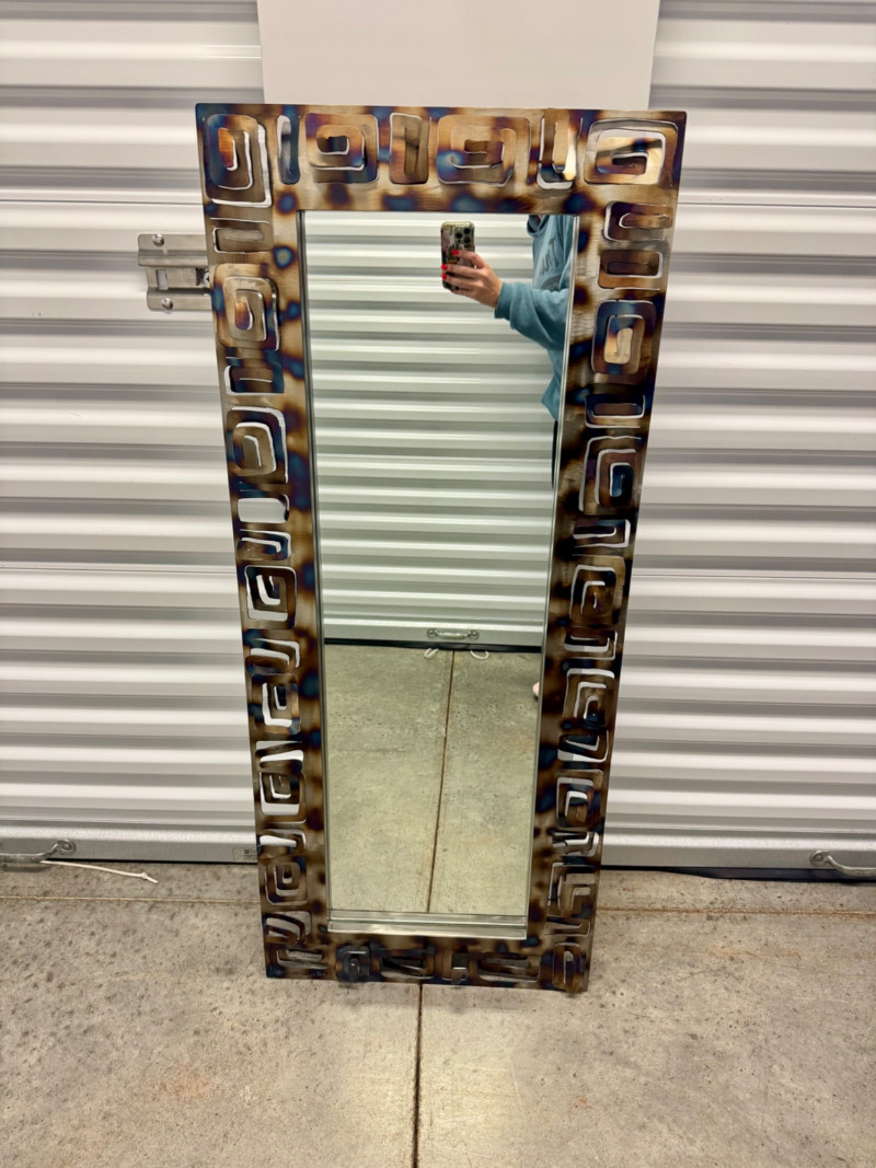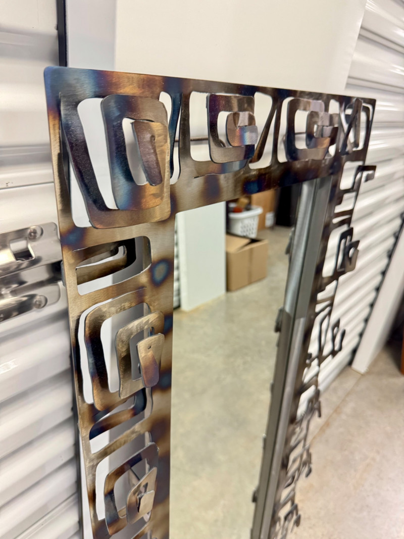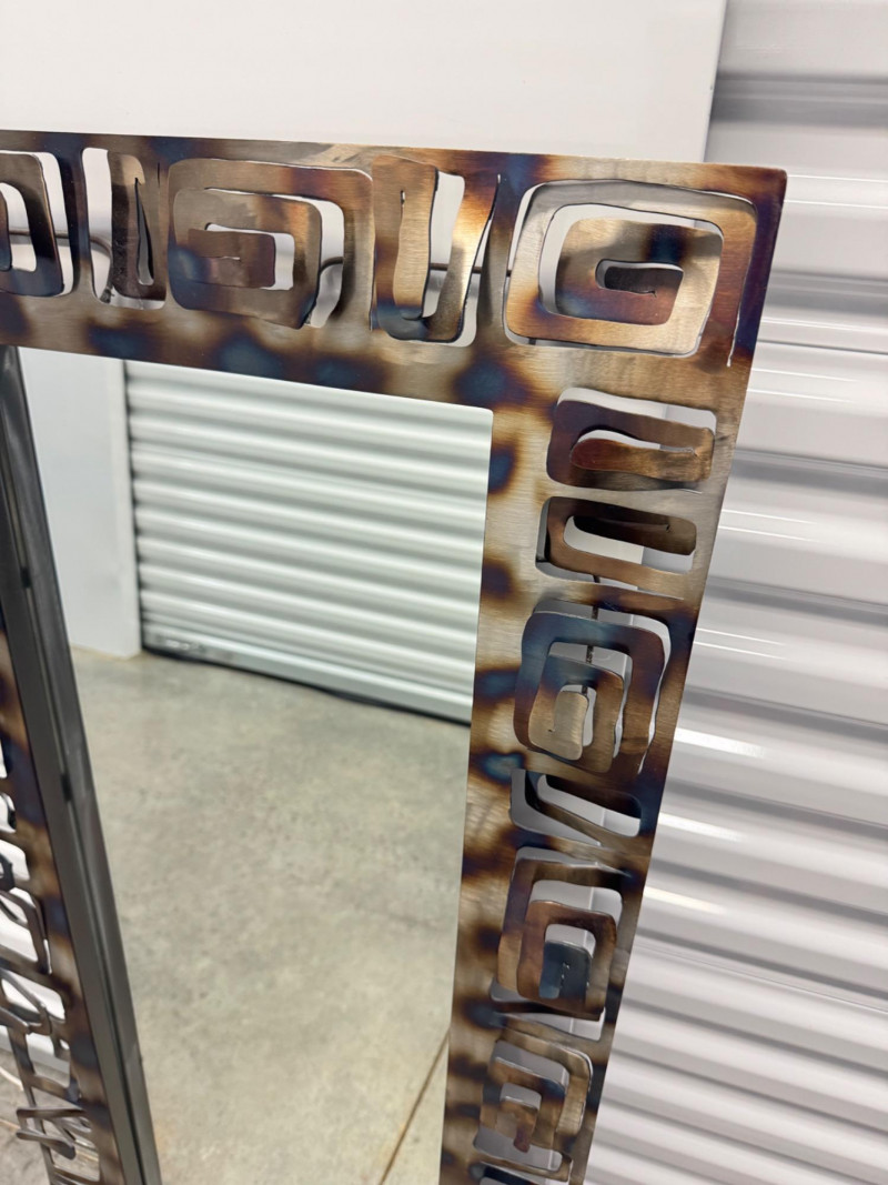M. Brandon Signed Steel Cut Mirror w/ Heat-Treated Finish. Dimensions: 20” wide x 48” tall