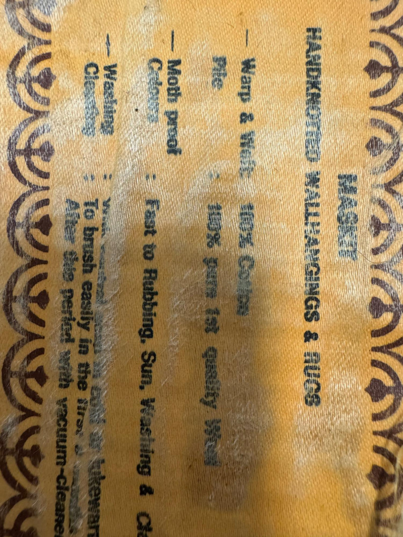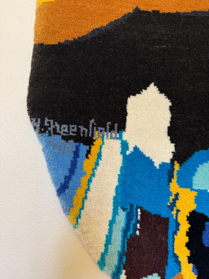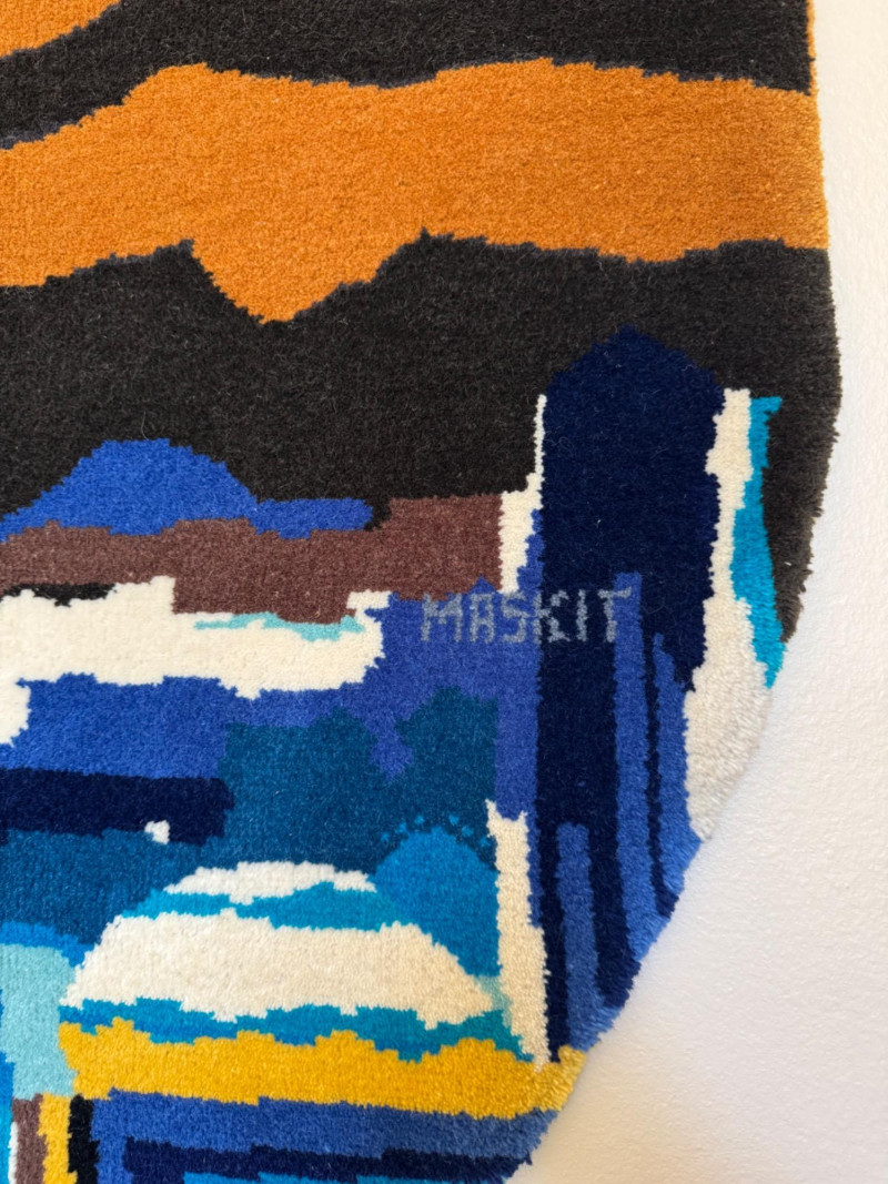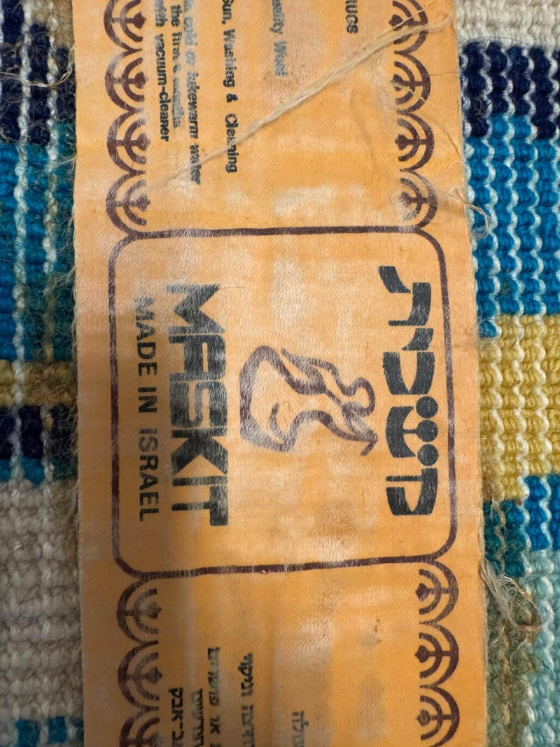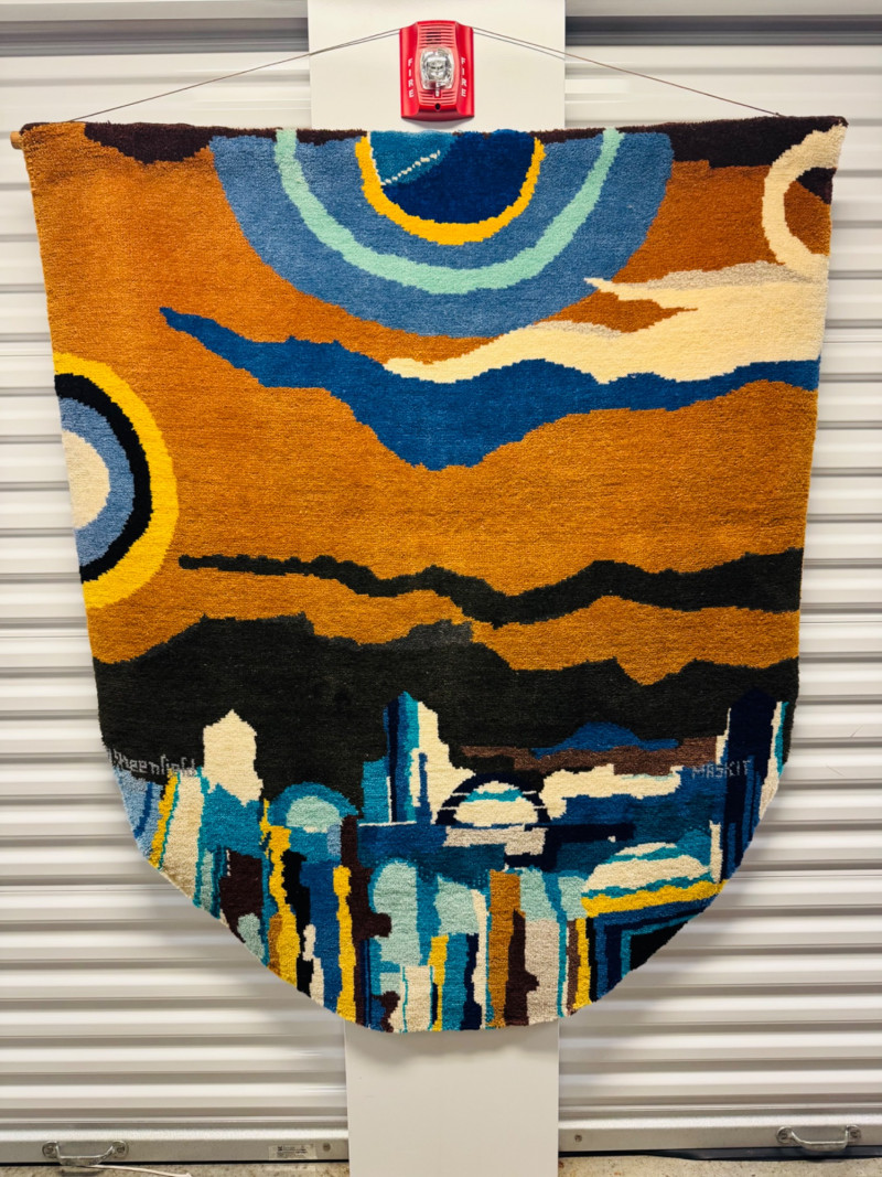 XL Maskit Israel Wool Wall Hanging Tapestry – Abstract Skyline, Signed Greenfield. Size: 51" W x 62" H (not including top hanger). Marked and signed on front; original maker’s tag on reverse.