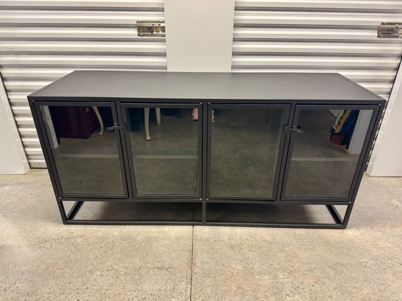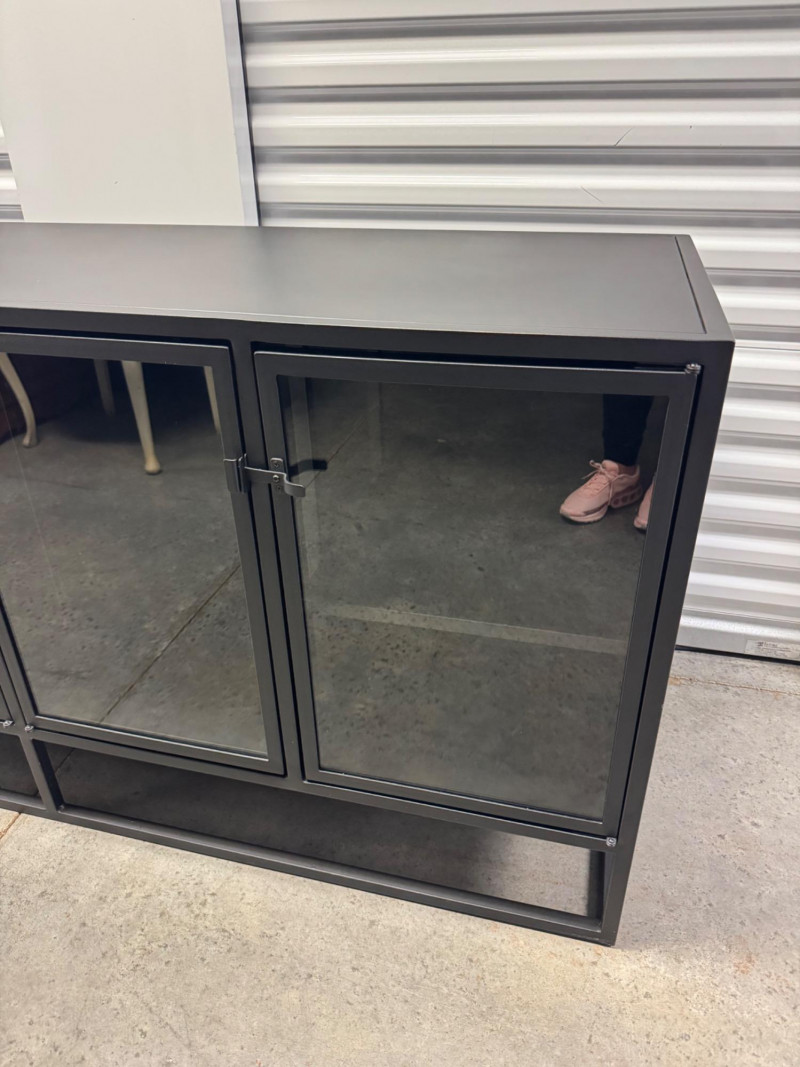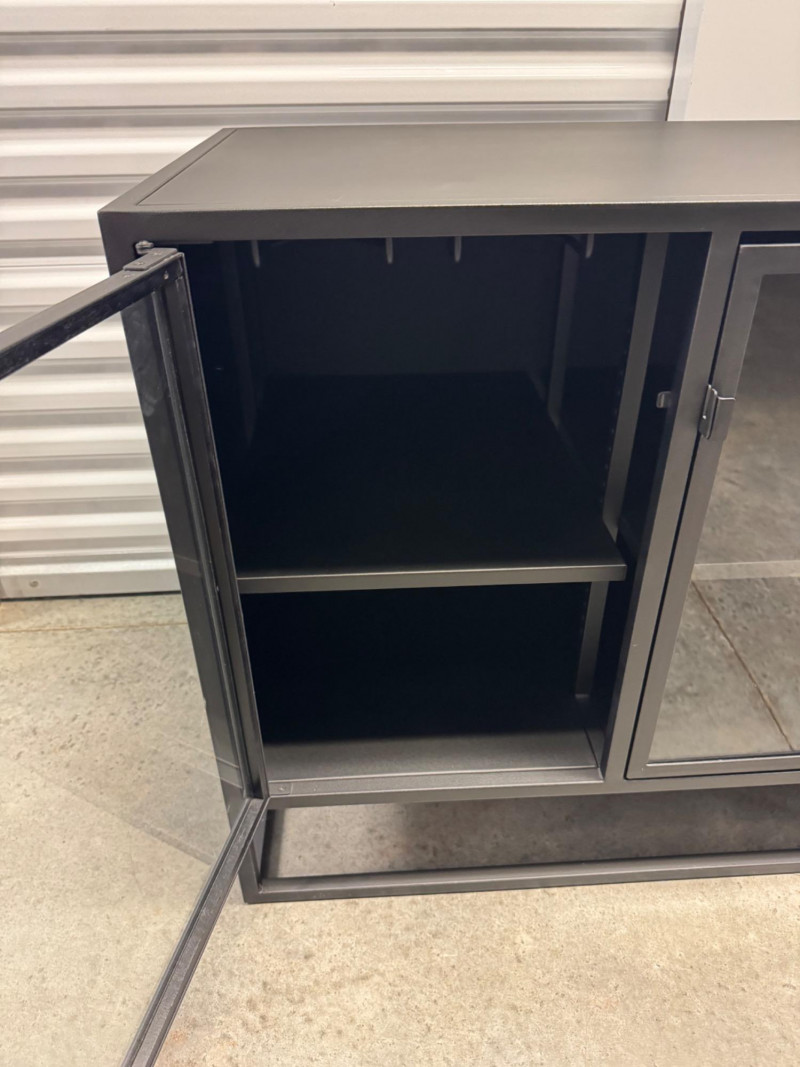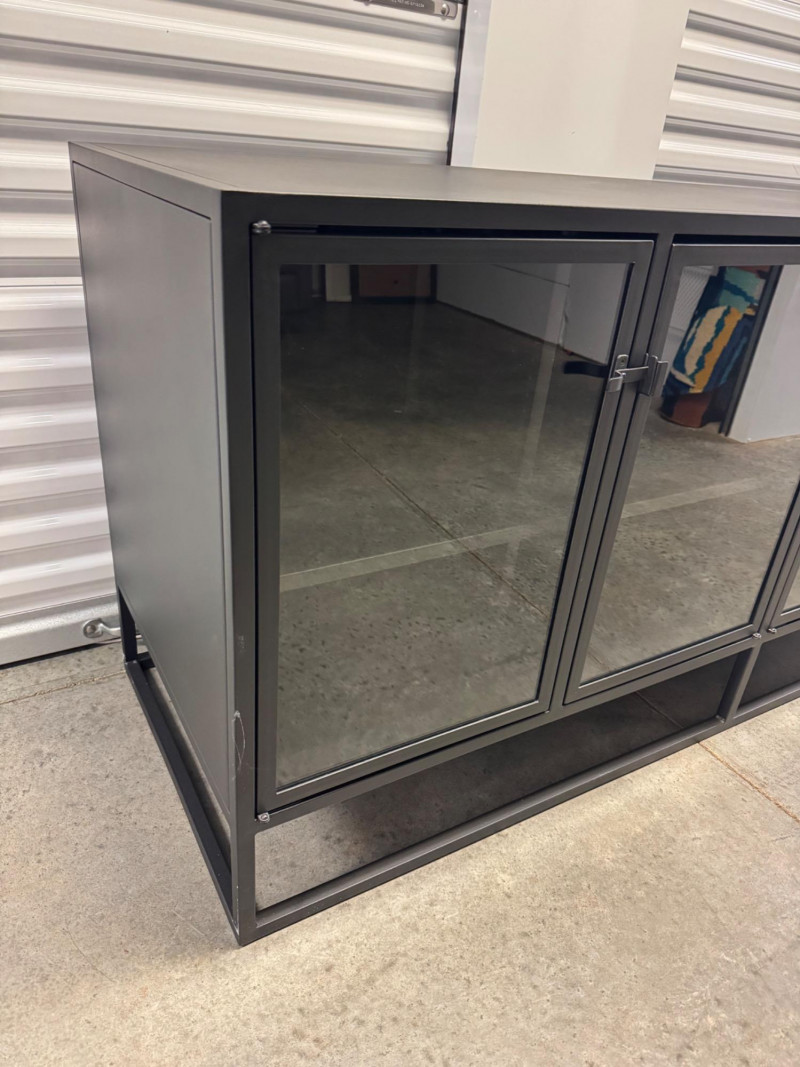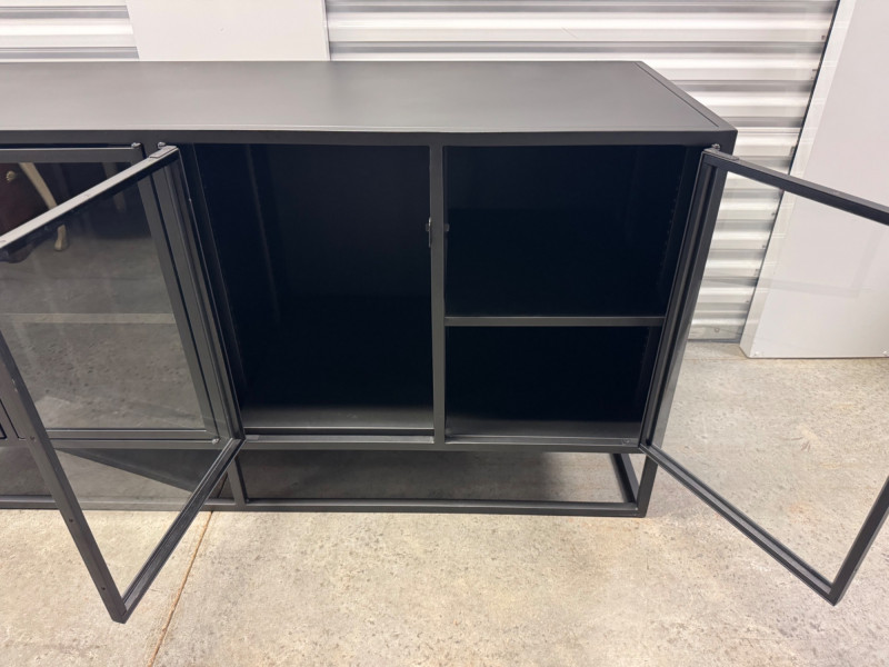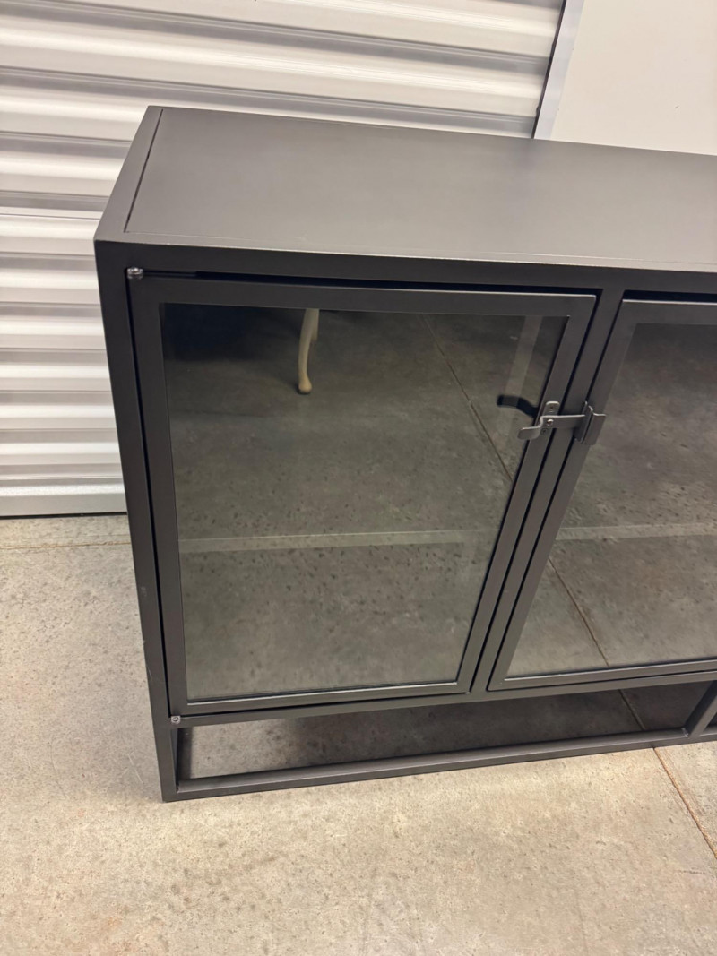Black Metal Buffet w/ Glass Doors – Crate & Barrel Casement Style. Dimensions: 66" L x 22" D x 31" H