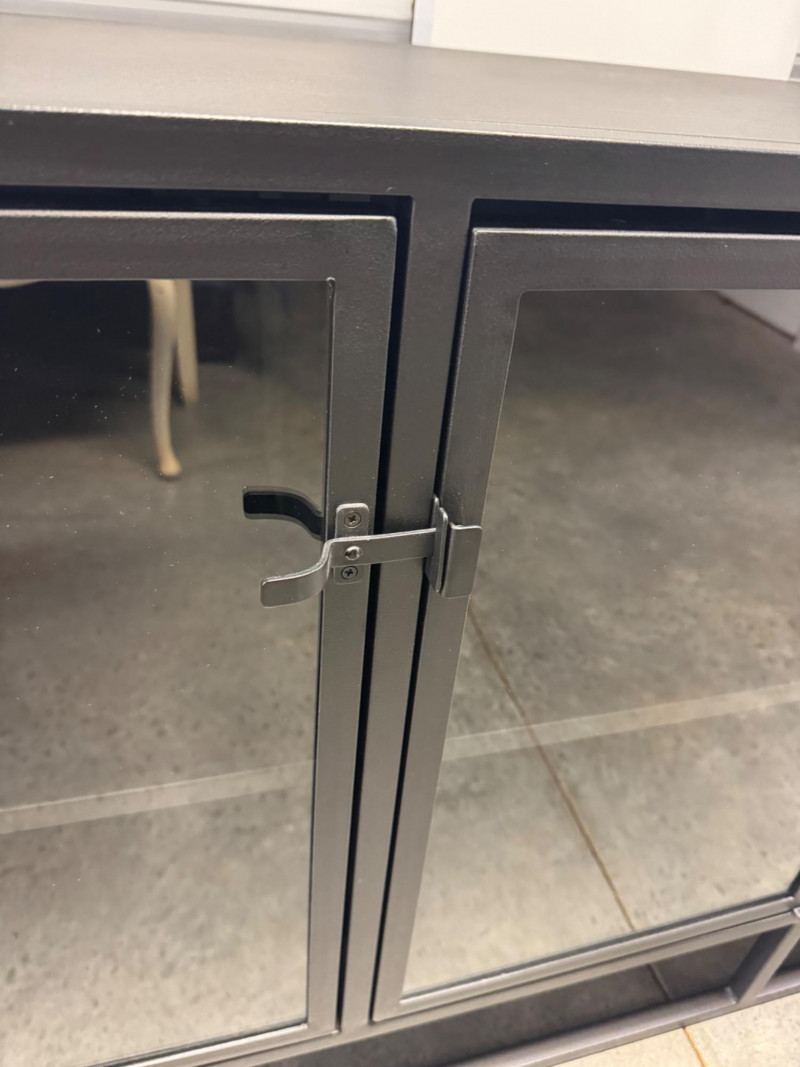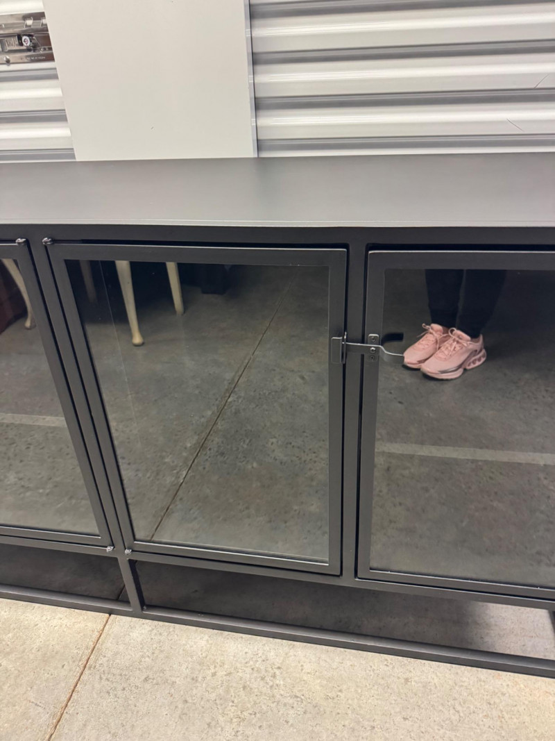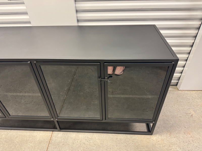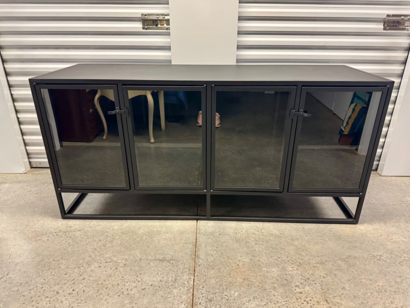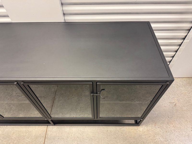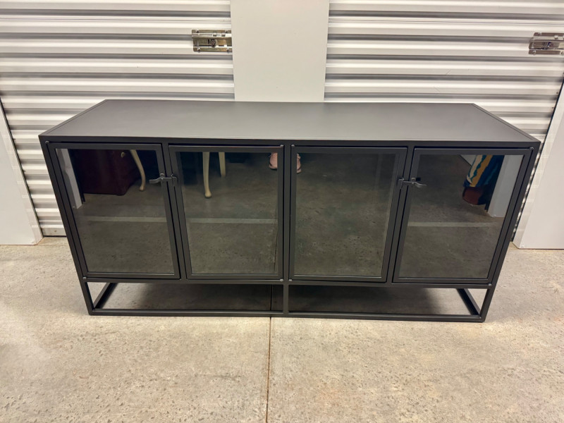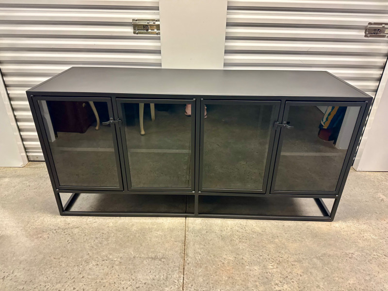 Black Metal Buffet w/ Glass Doors – Crate & Barrel Casement Style. Dimensions: 66" L x 22" D x 31" H