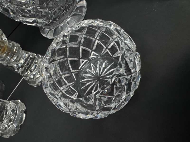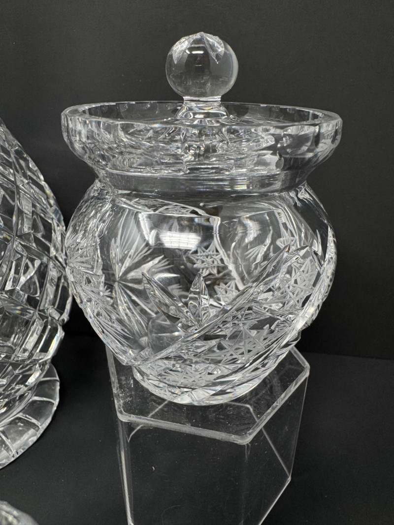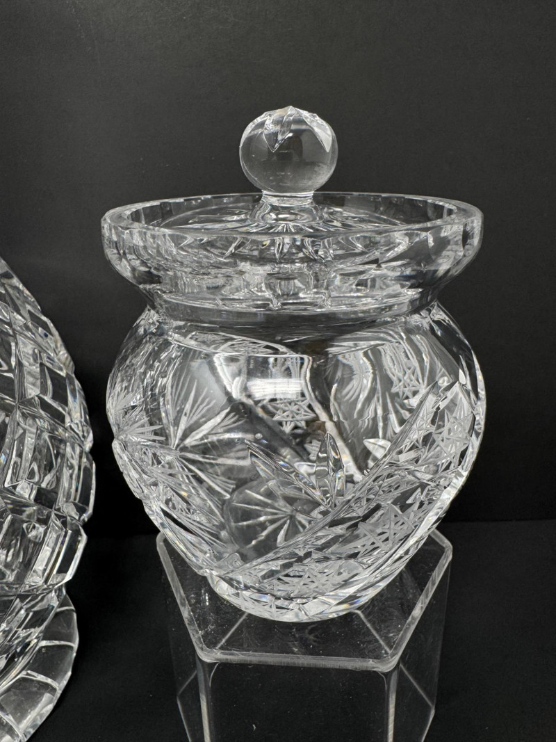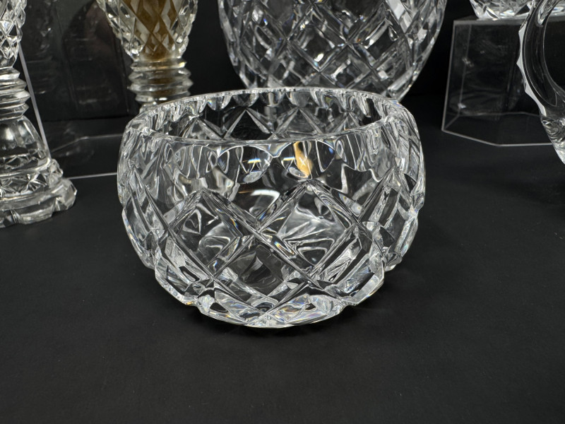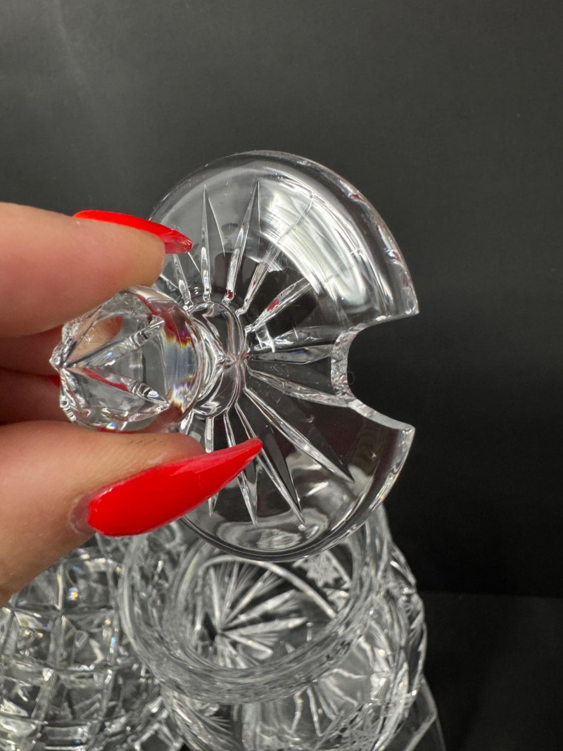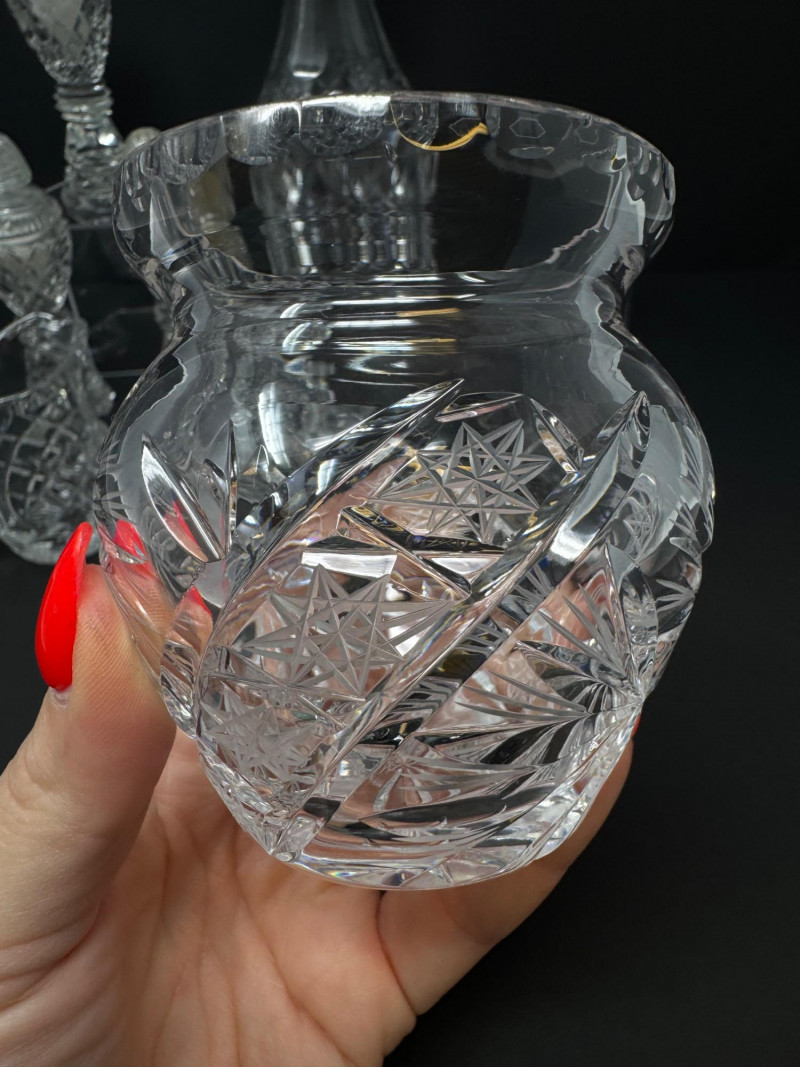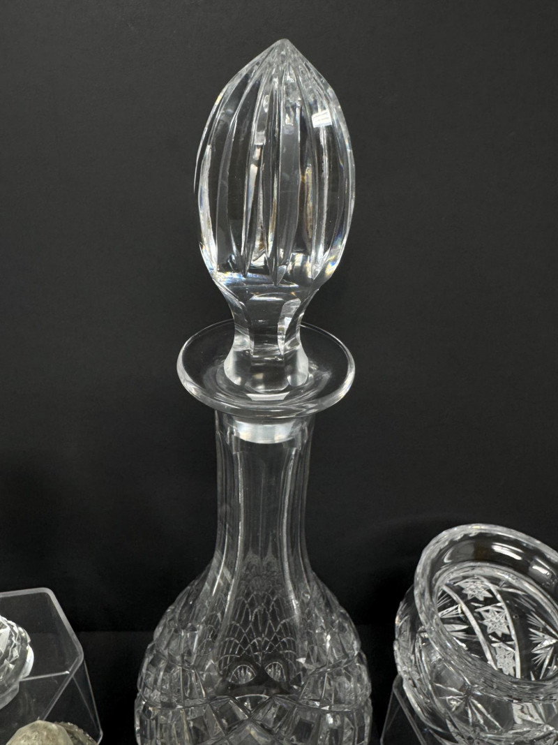 1967 Kusak Crystal Decanter, Crystal Shakers, Creamer, & More. 13" tall decanter with stopper (3) salt/pepper shakers Small creamer Small vase Round trinket/candy dish
