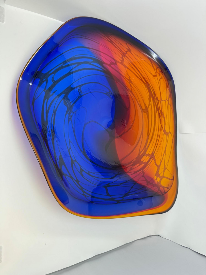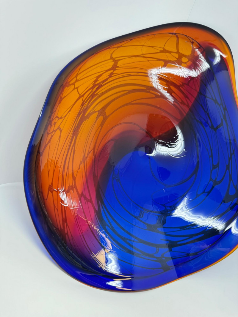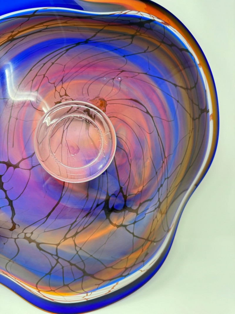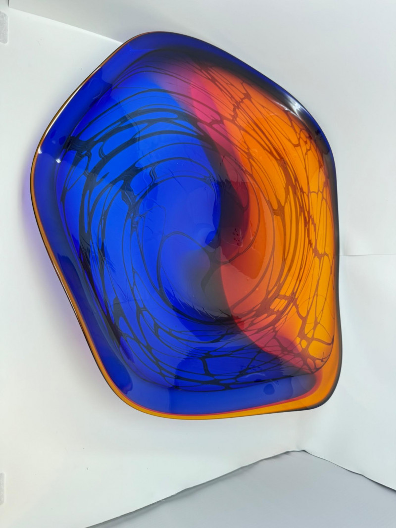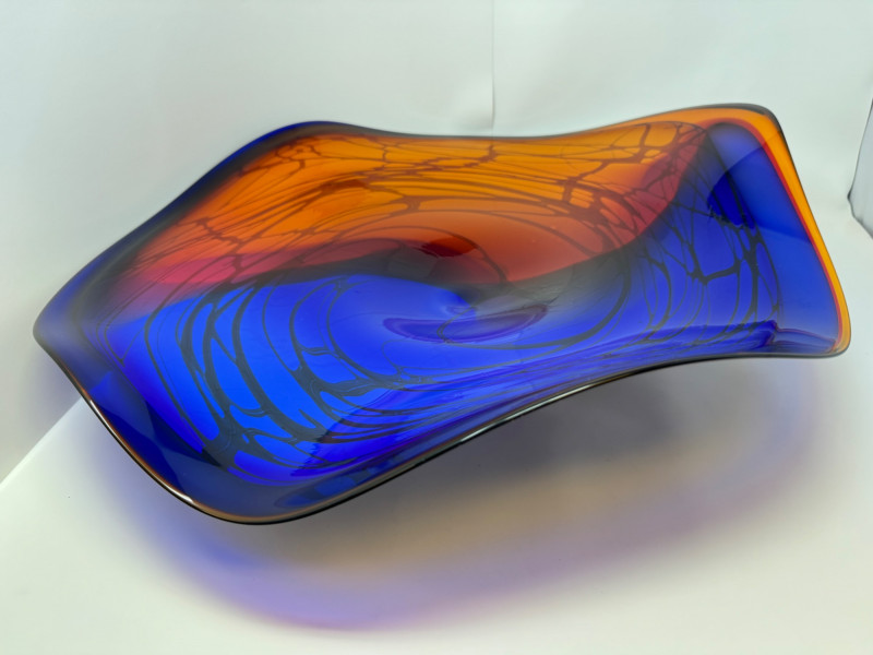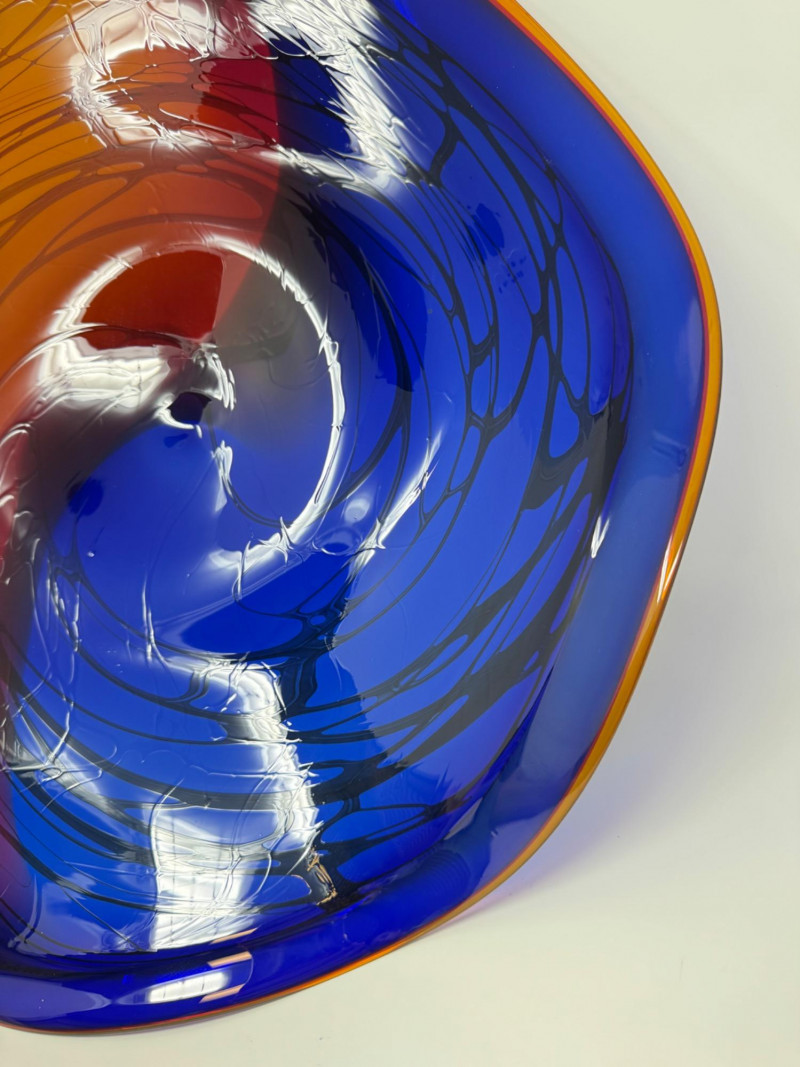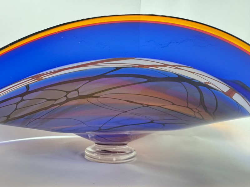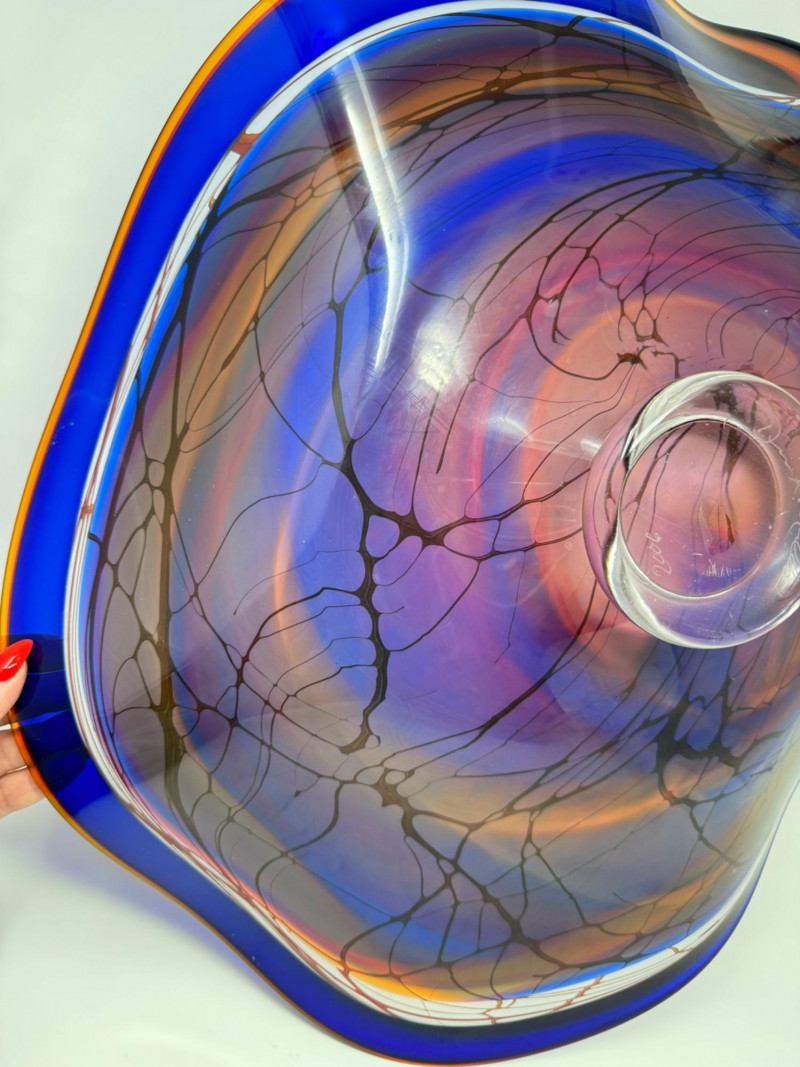 Blown Glass Bowl, Blue/Amber, Likely Dennis K. Mullen Signed. Size: approx. 22" diameter × 6" tall Signature on base appears to read “Dennis K. Mullen.”