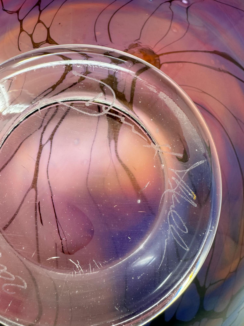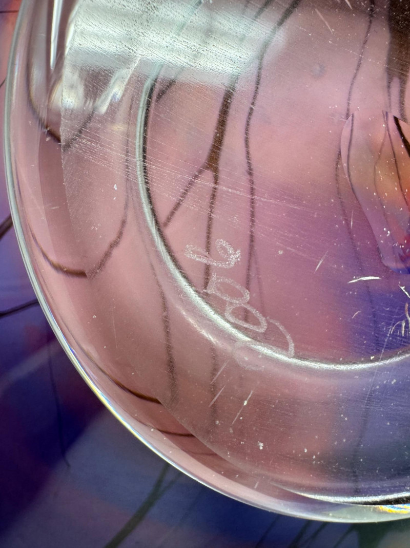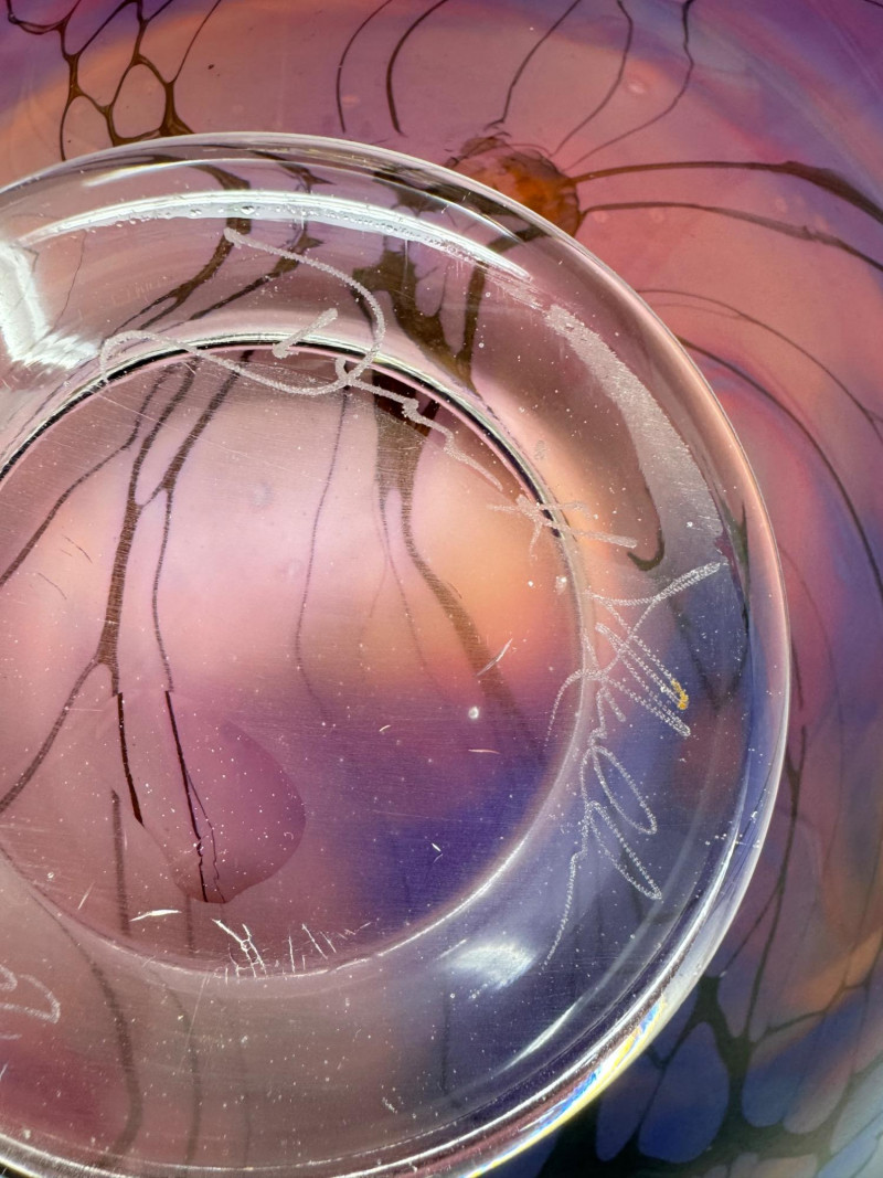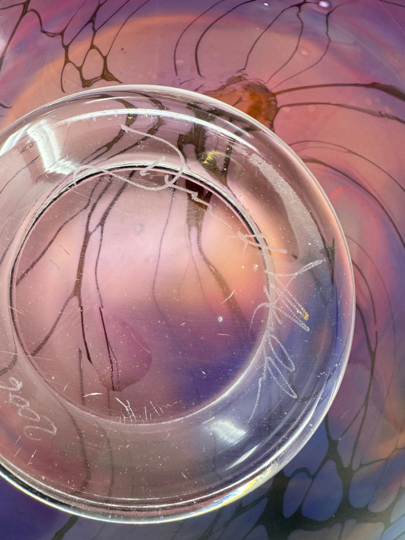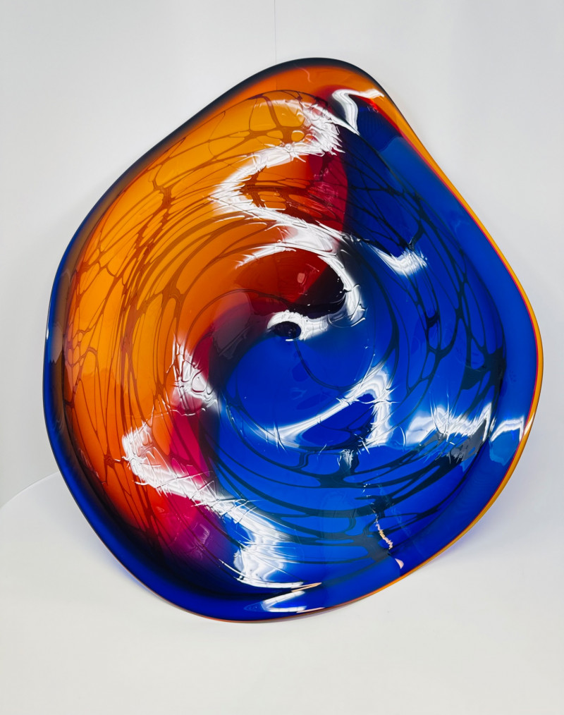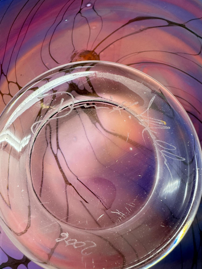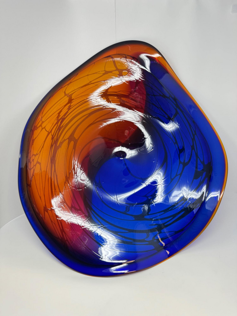 Blown Glass Bowl, Blue/Amber, Likely Dennis K. Mullen Signed. Size: approx. 22" diameter × 6" tall Signature on base appears to read “Dennis K. Mullen.”
