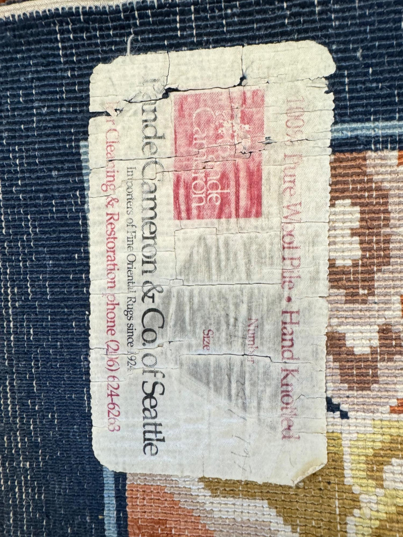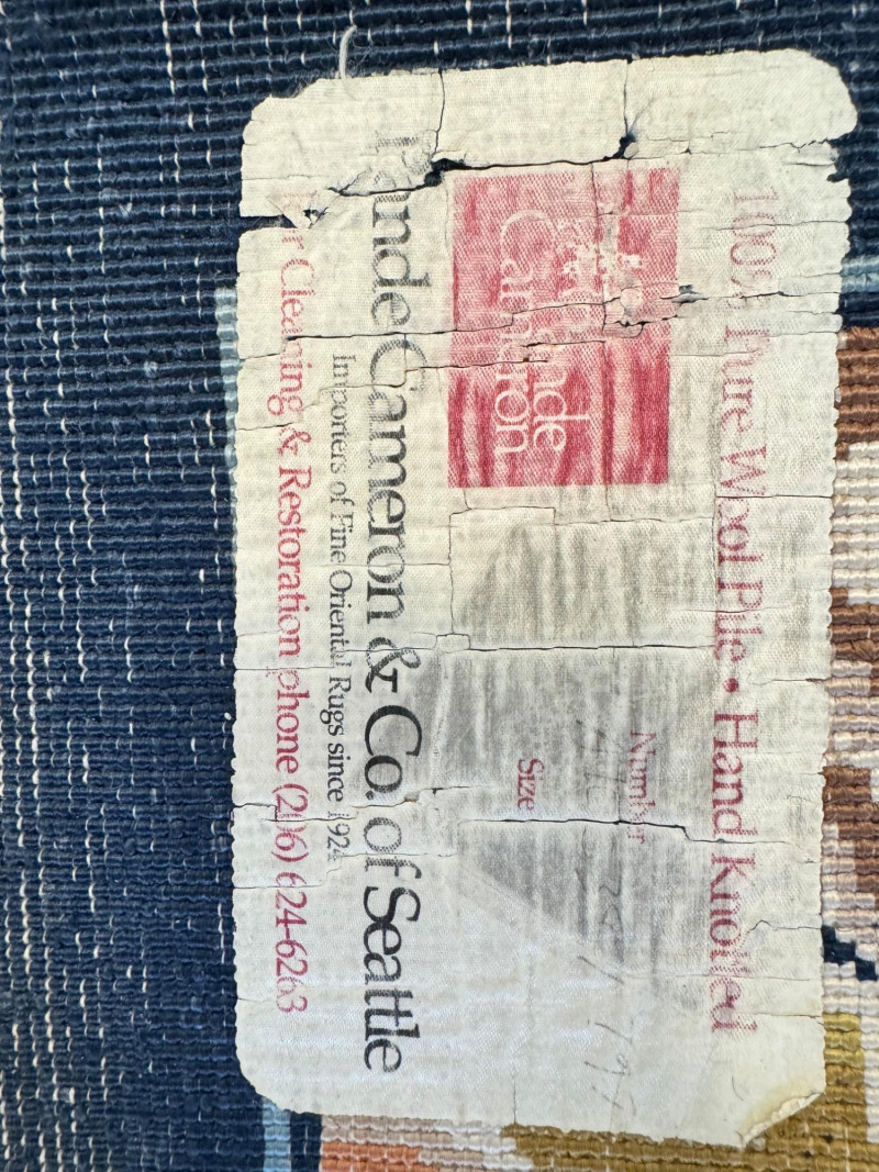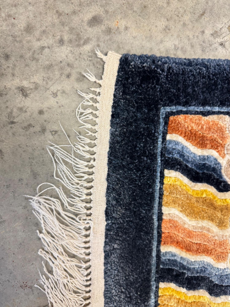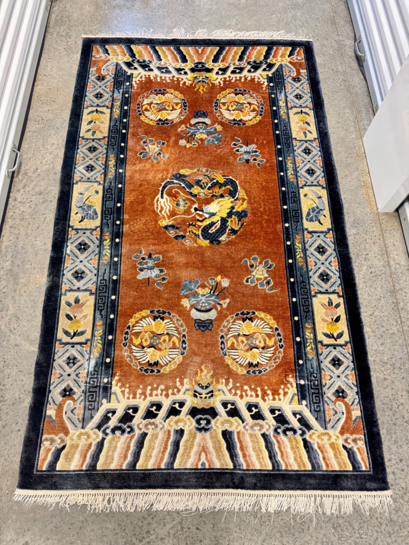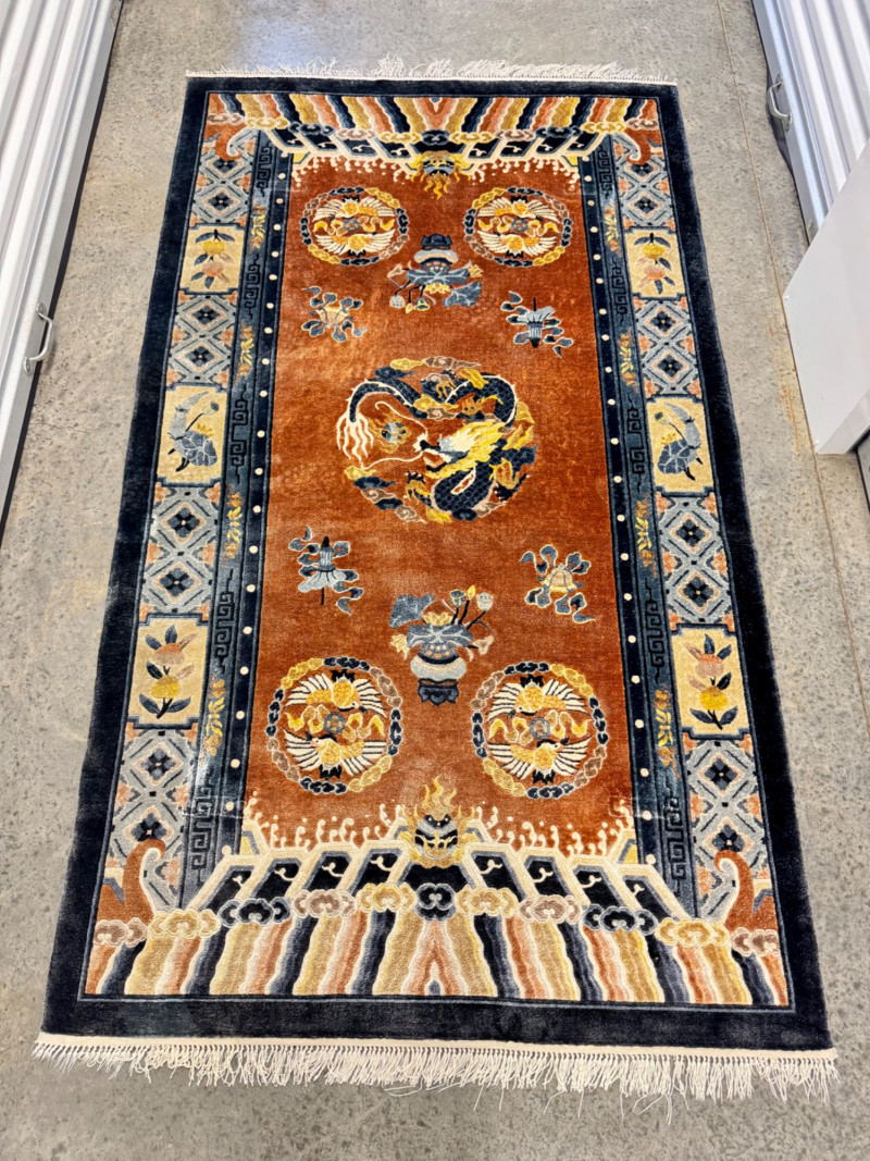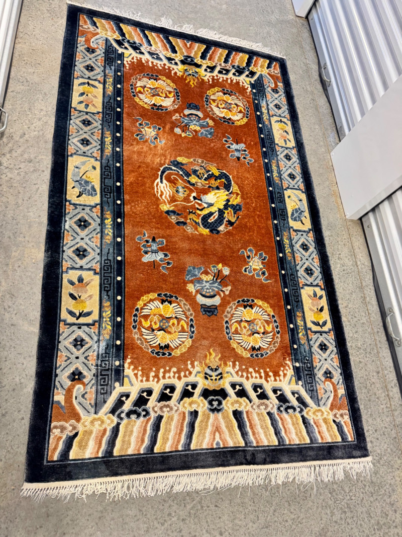 Vintage 100% Wool Hand-Knotted Dragon Rug, Rust/Blue - Great Condition. Size: approx. 47" x 87" Condition: wear/fray to fringe ends; otherwise good—see photos Note: wool has a silky sheen.
