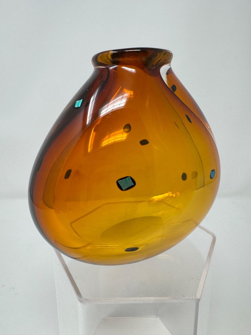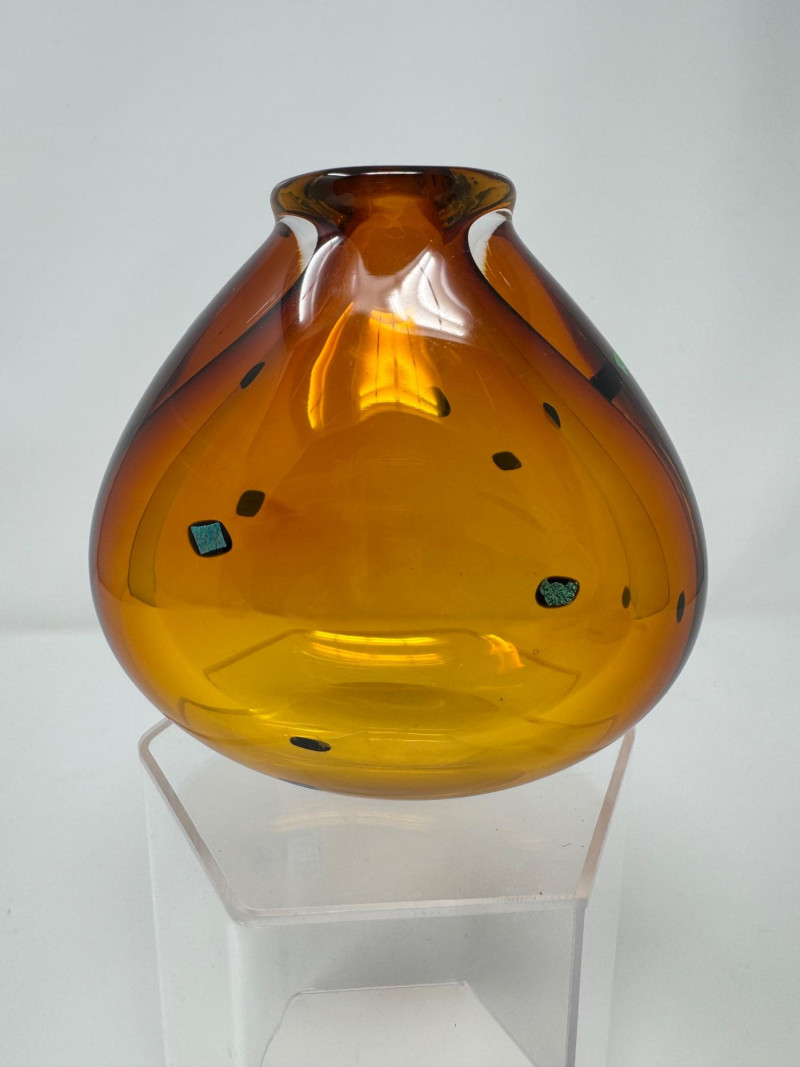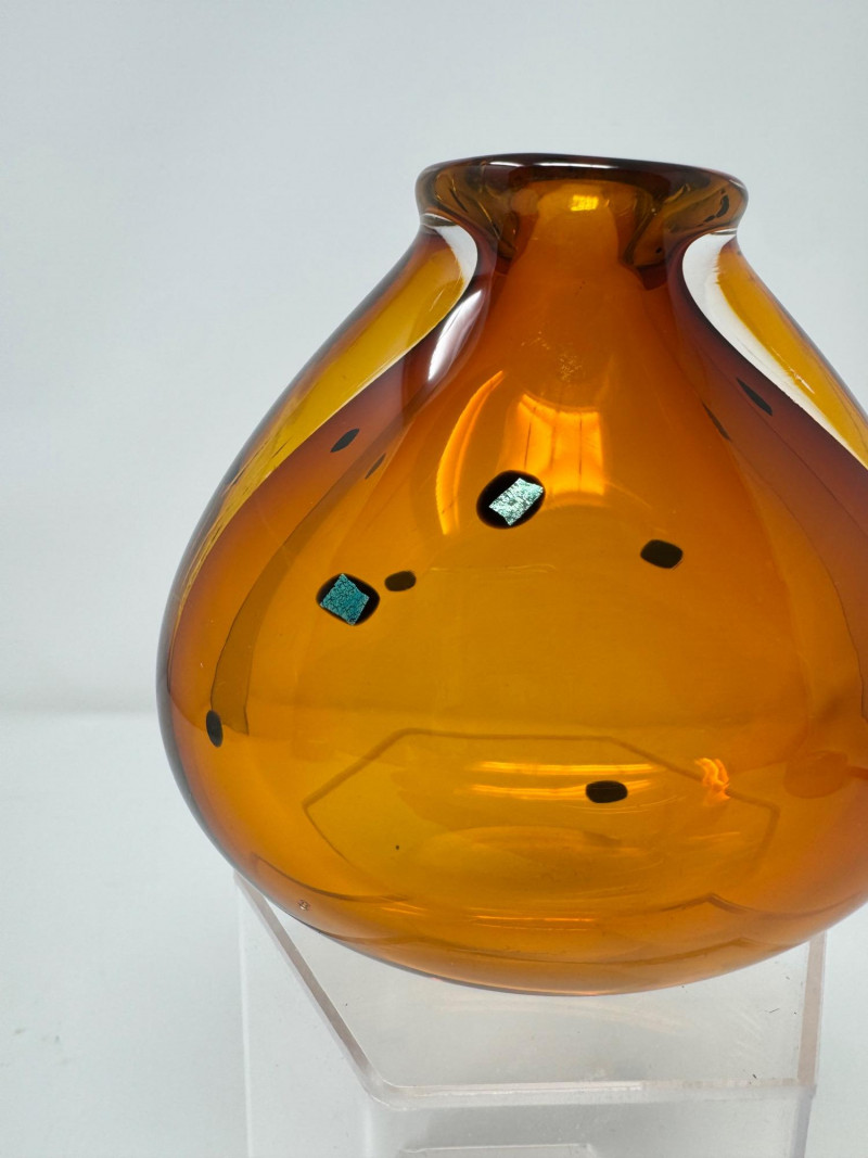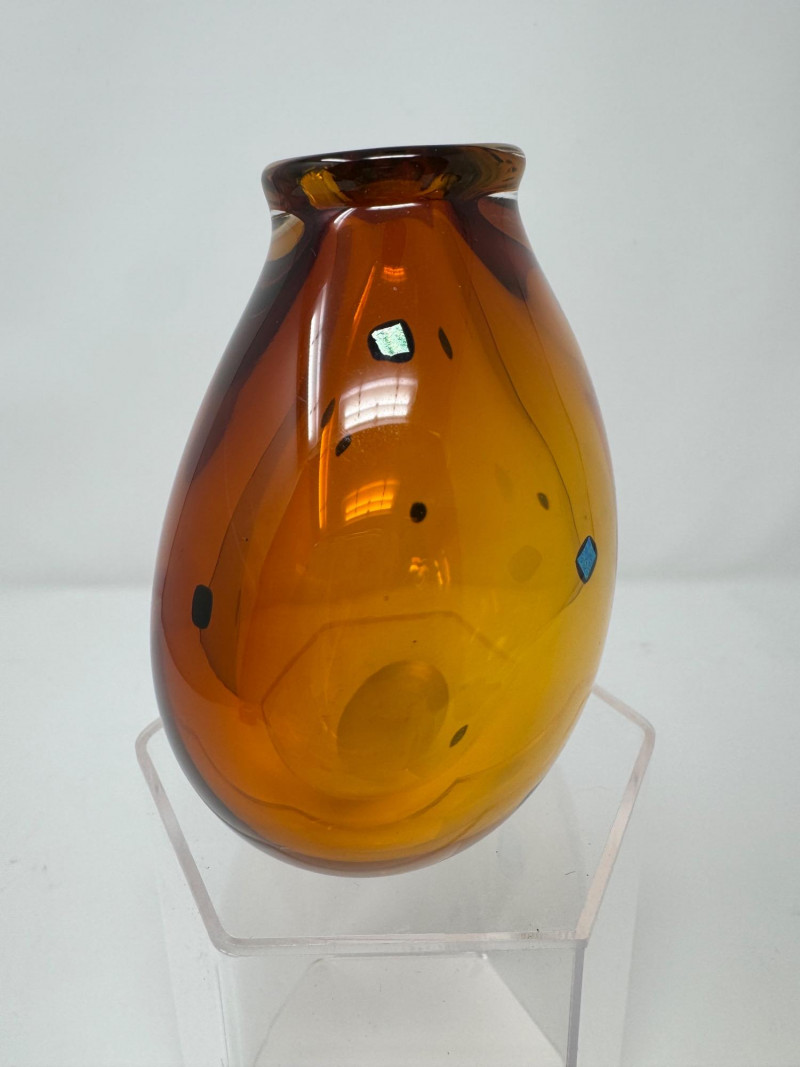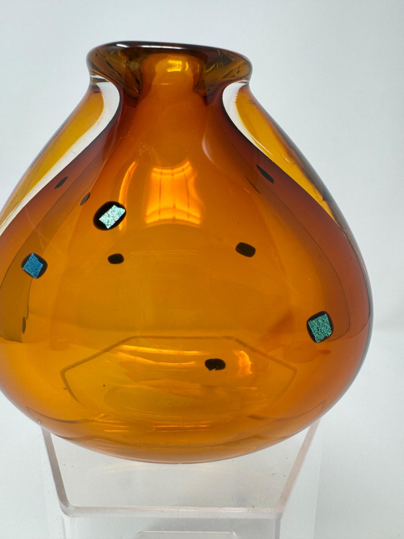 Sharon Fujimoto Amber Blown Glass Vase w/ Dichroic Accents - Signed, 2005. 4” Tall
