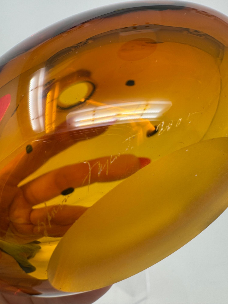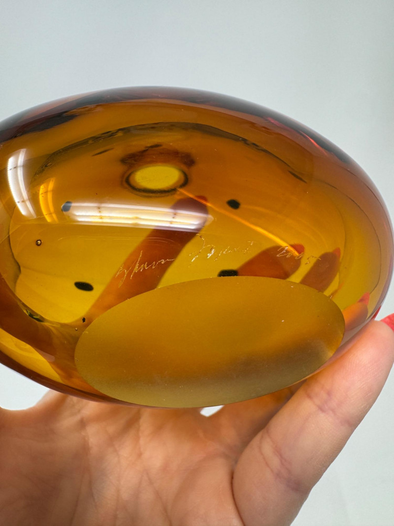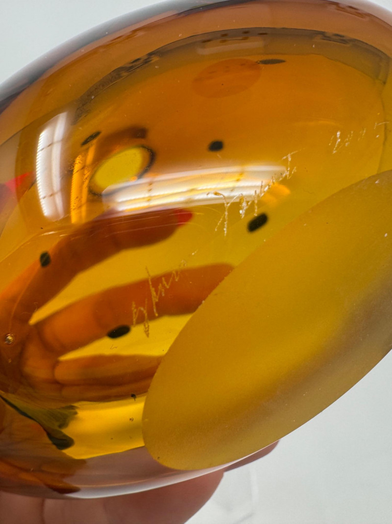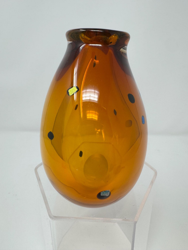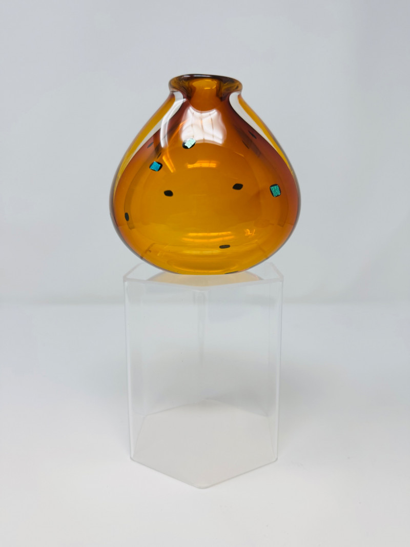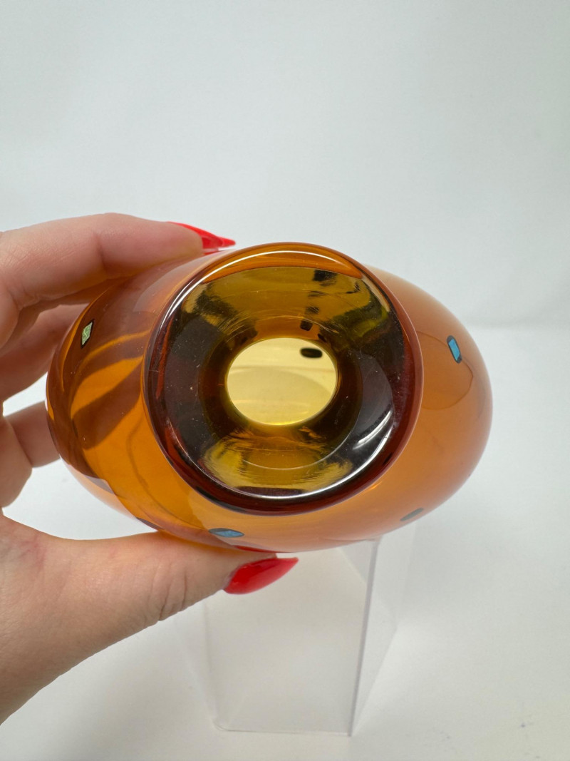 Sharon Fujimoto Amber Blown Glass Vase w/ Dichroic Accents - Signed, 2005. 4” Tall