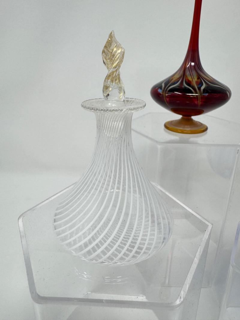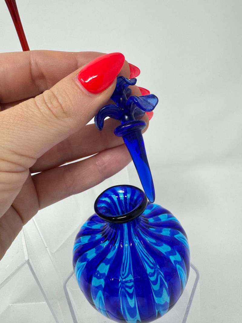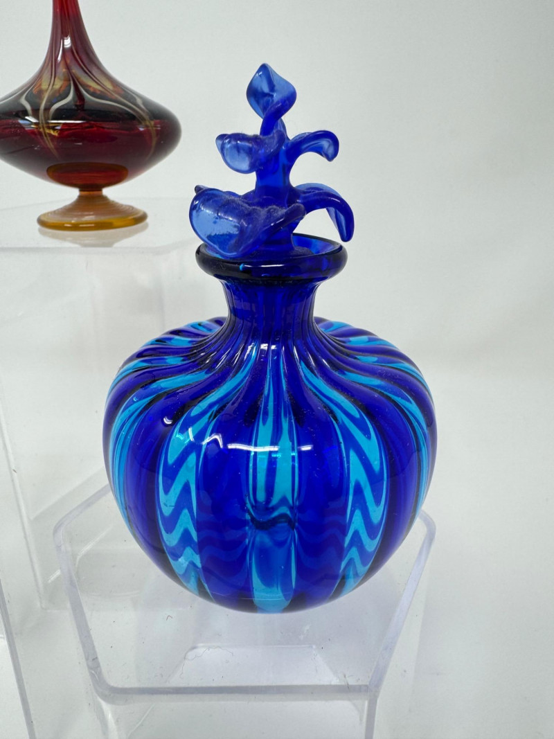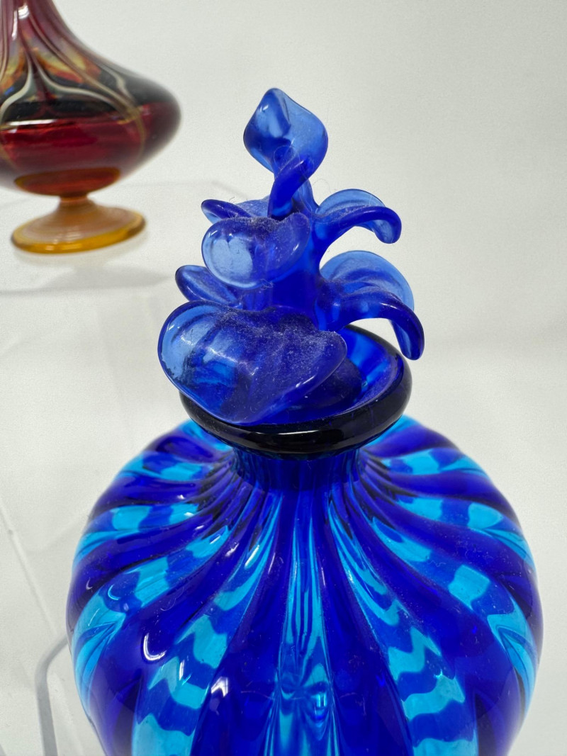 Lot # 25 - Murano-Style Blown Glass Perfume Bottles – Blue Swirl, Amber Flame +