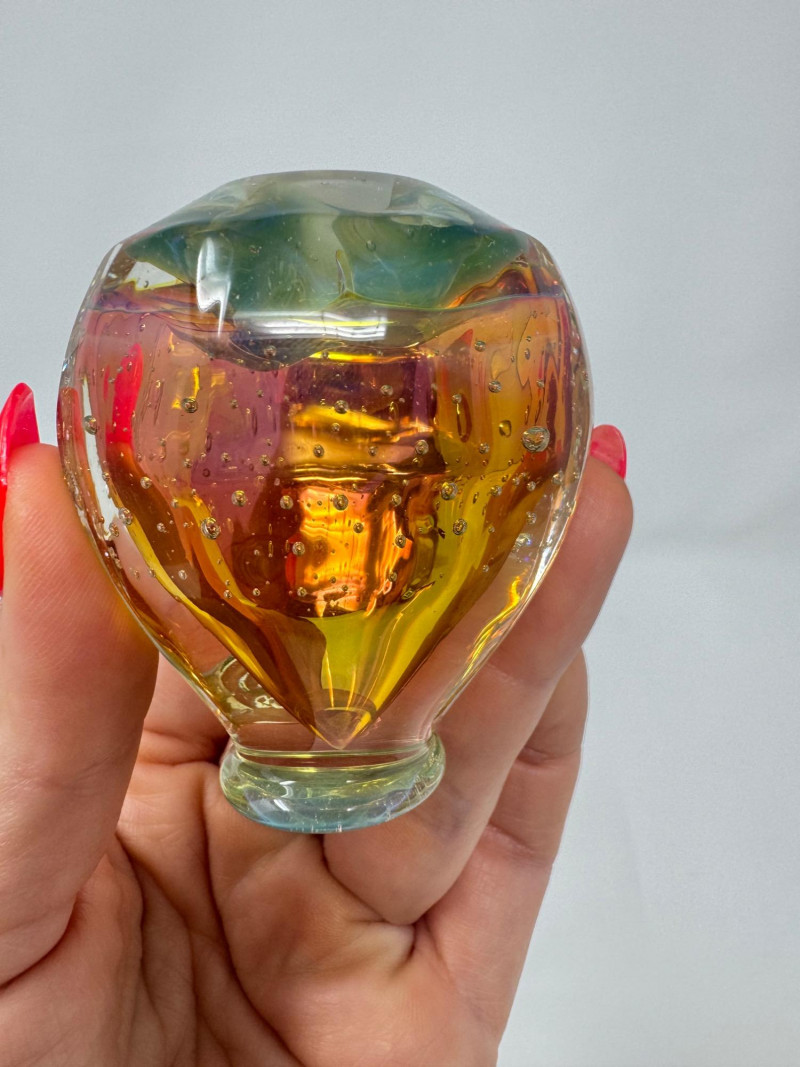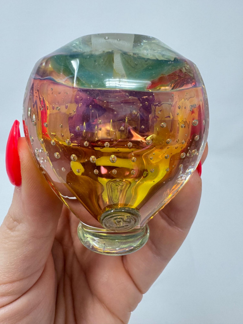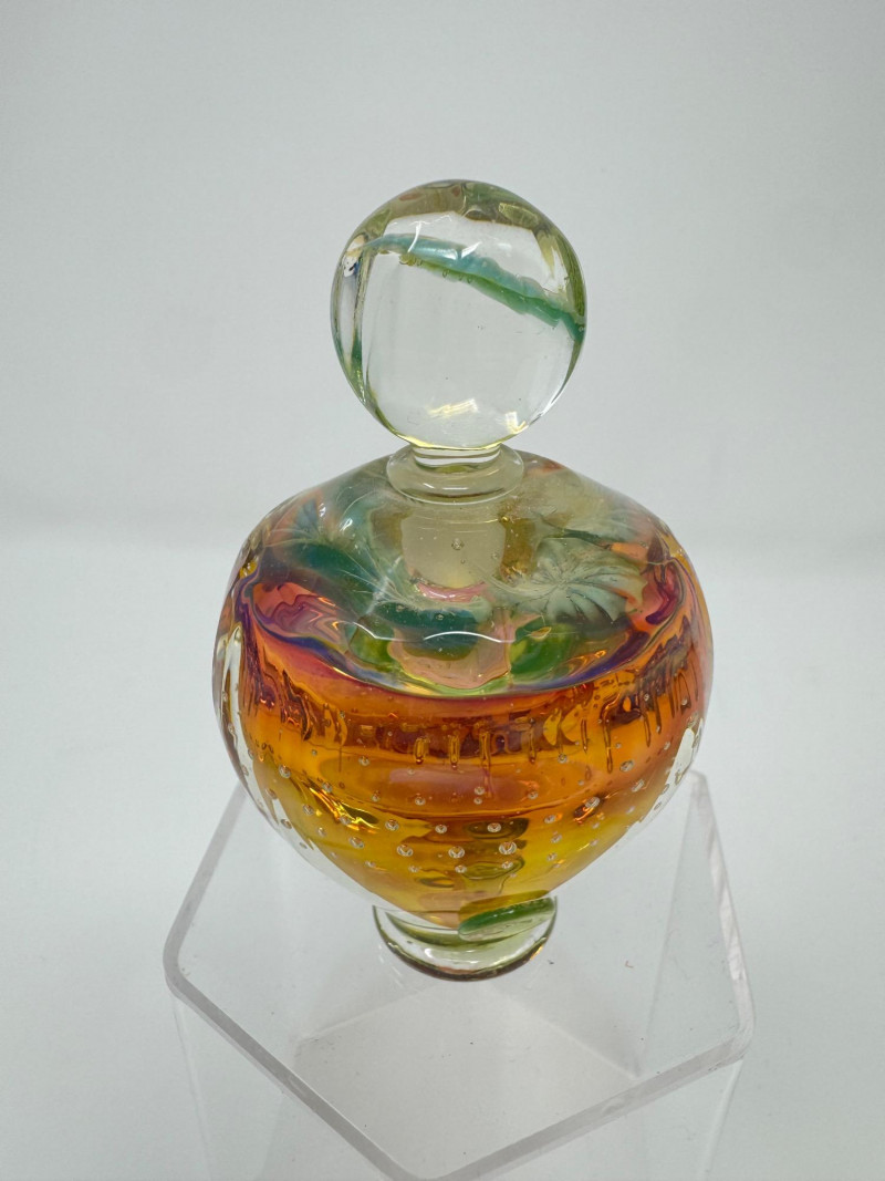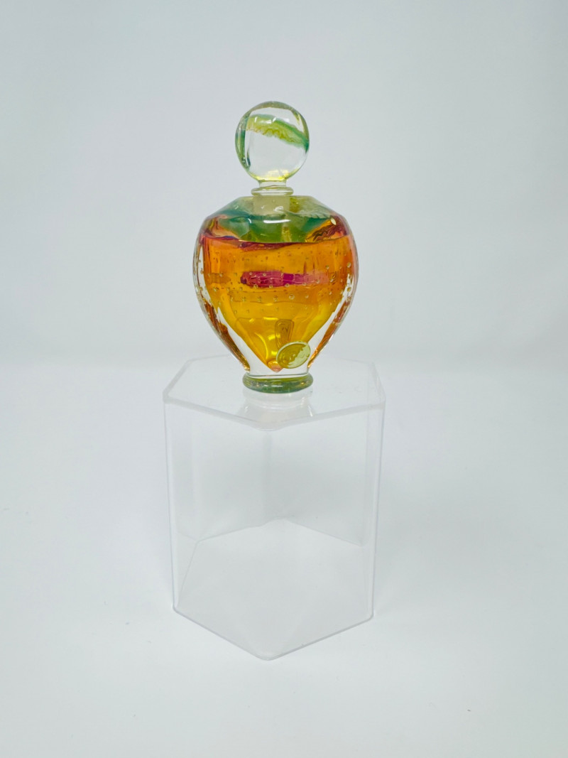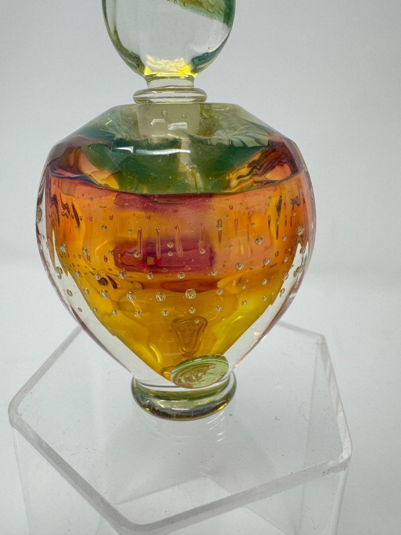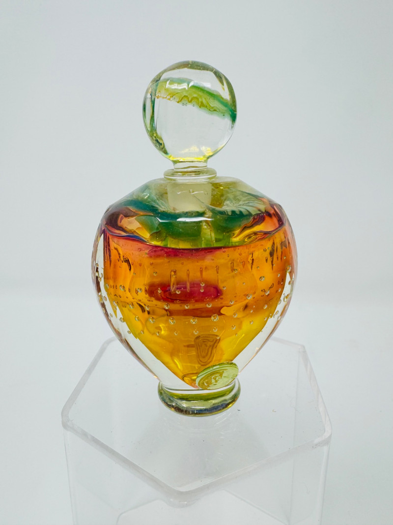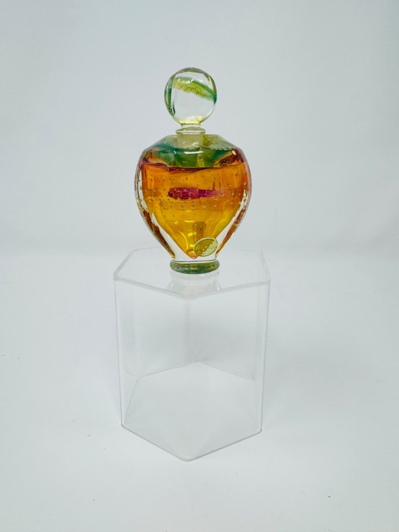 Hand-Blown Art Glass Perfume Bottle – Orange, Pink & Green Swirl. Measures approx. 3.5” Tall