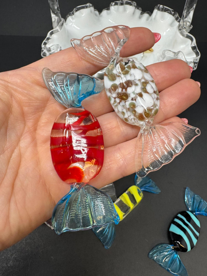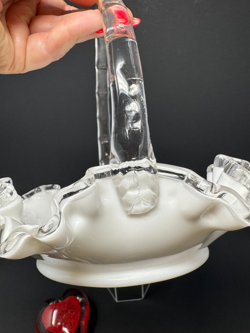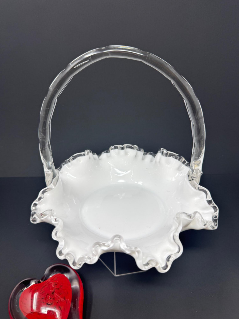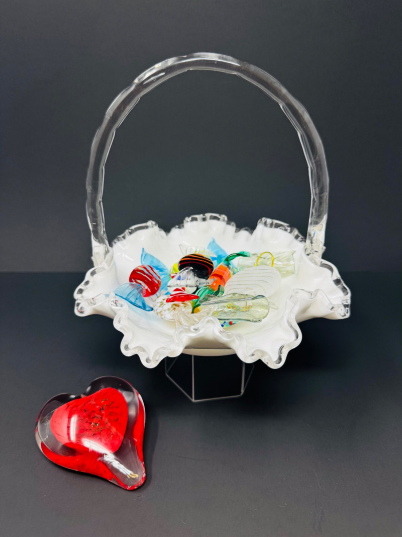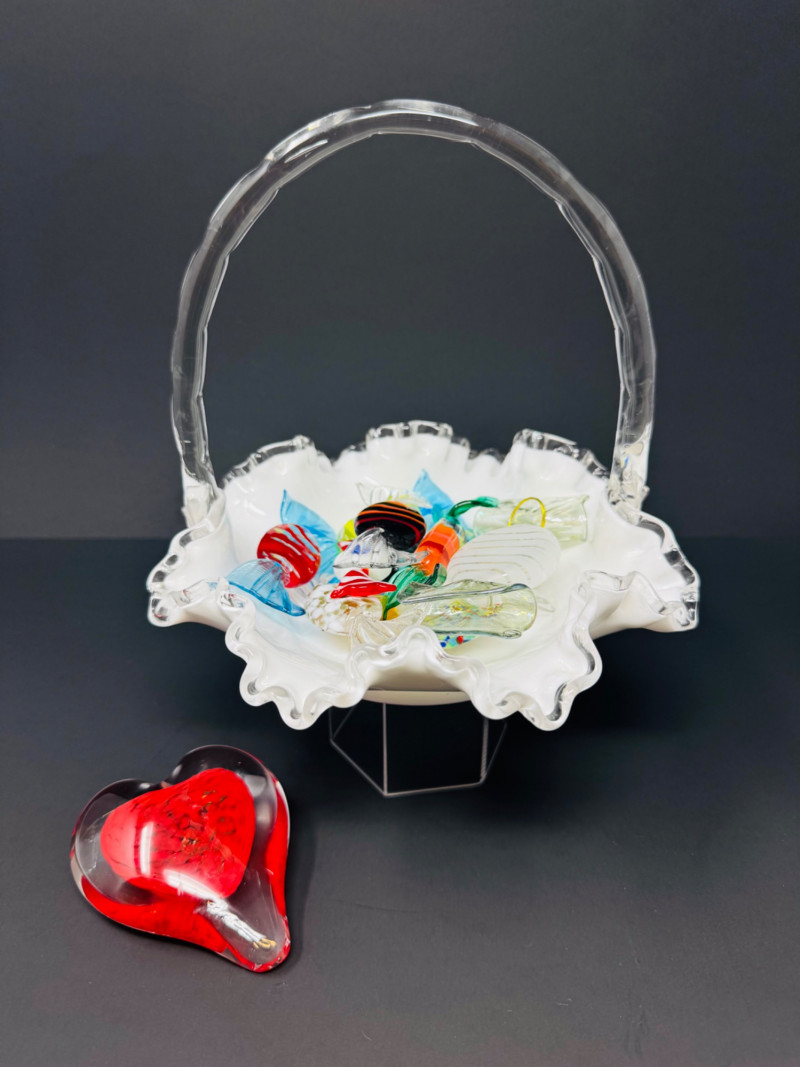 Fenton-Style Silver Crest White Milk Glass Basket + Art Glass Candies. Basket: approx. 7" H x 7" across