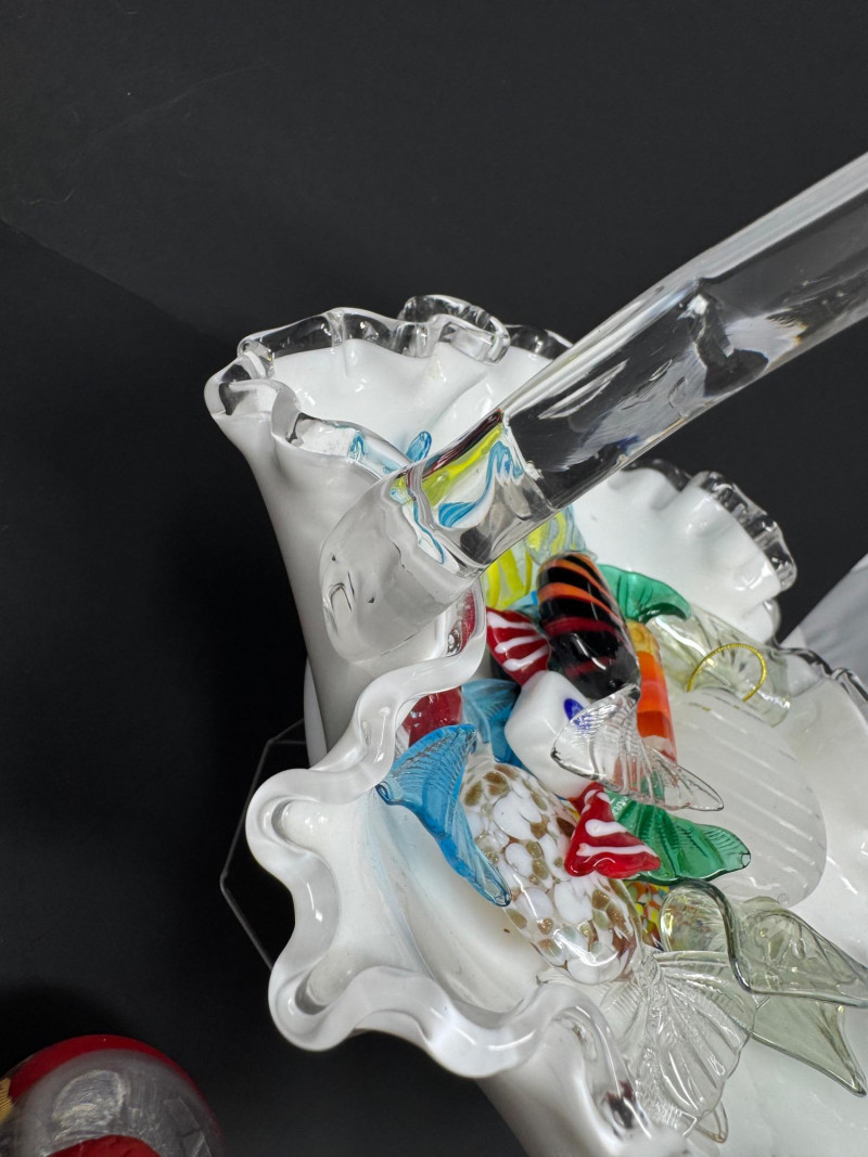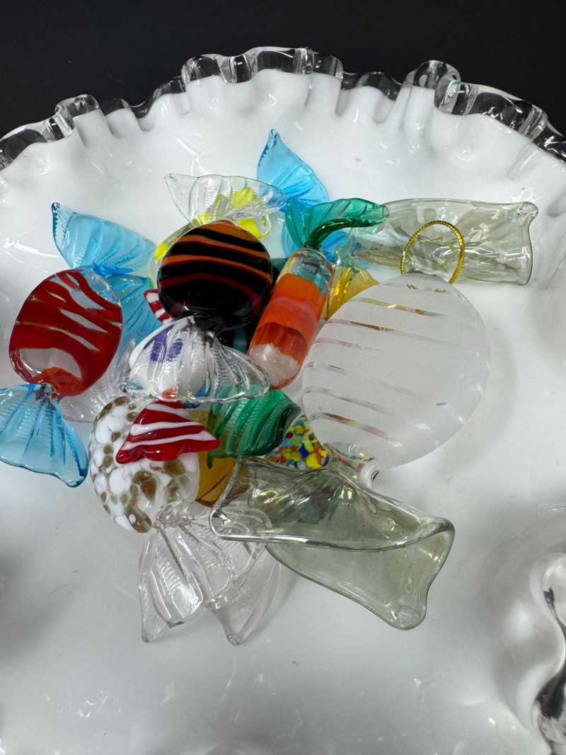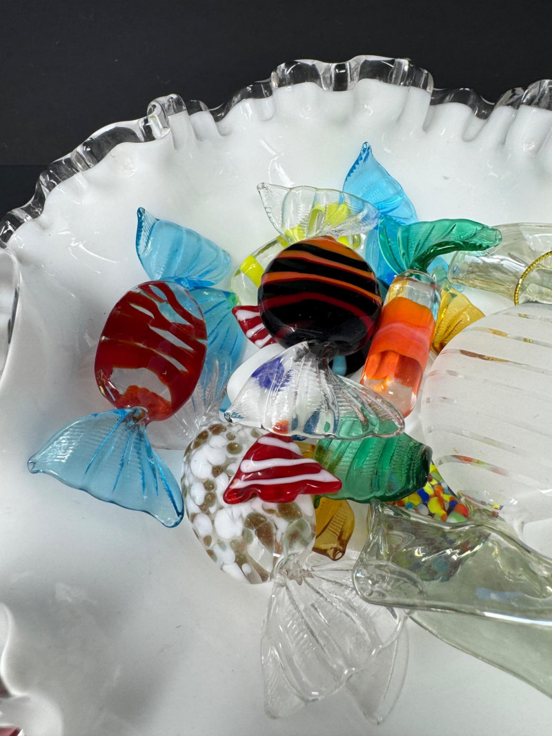 Lot # 42 - Fenton-Style Silver Crest White Milk Glass Basket + Art Glass Candies