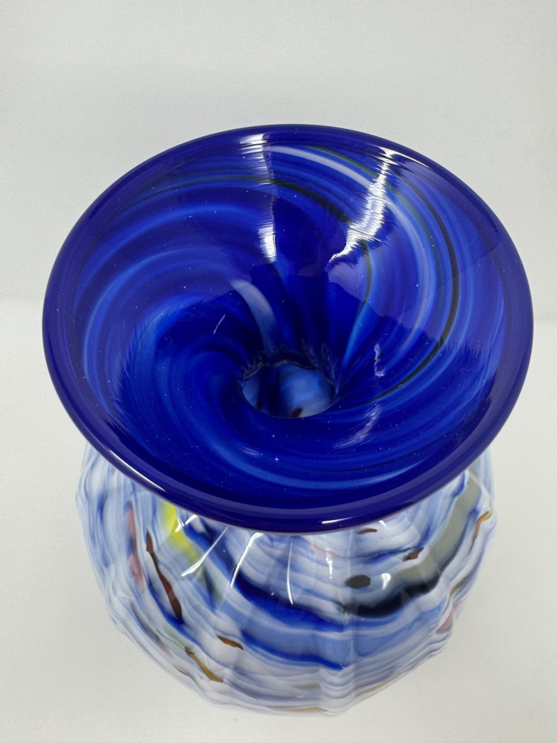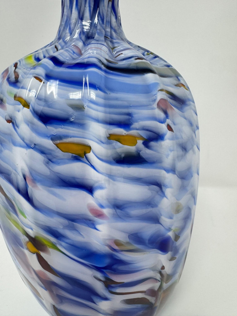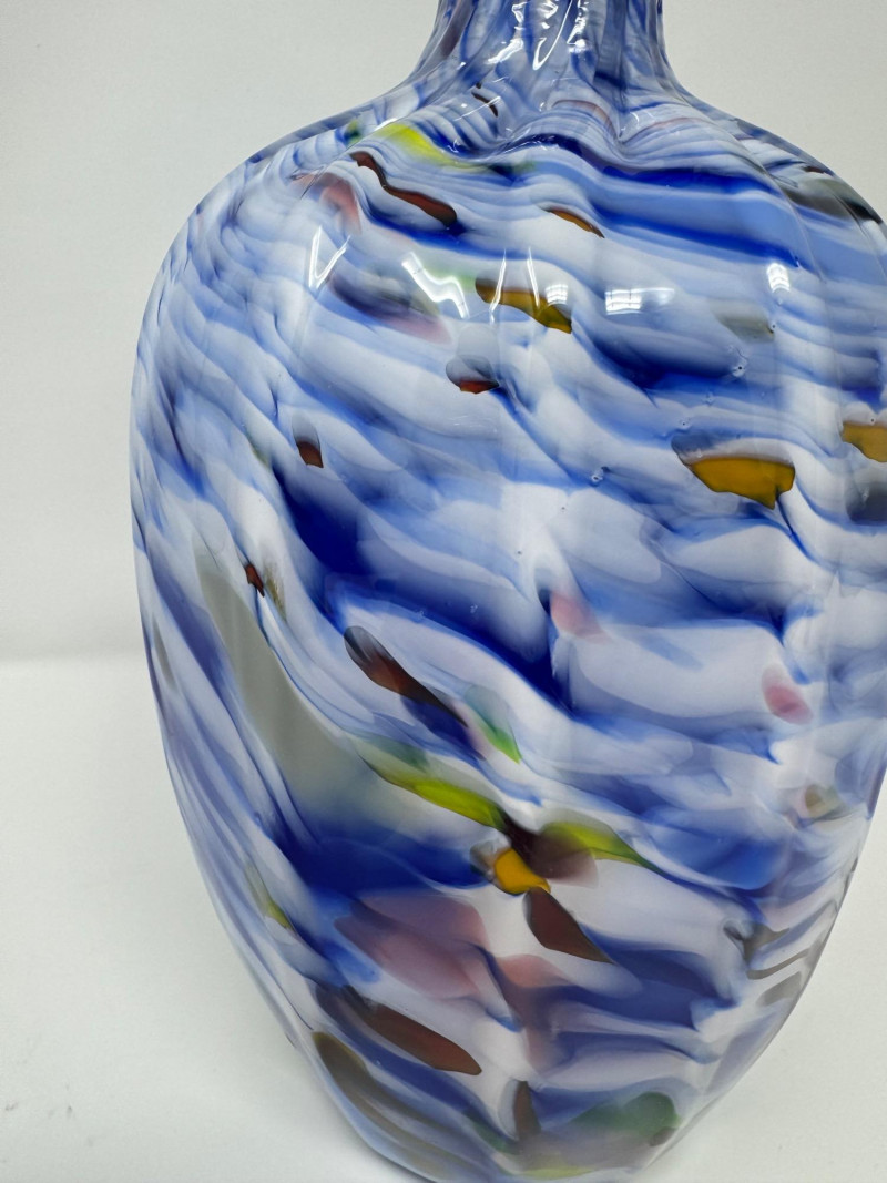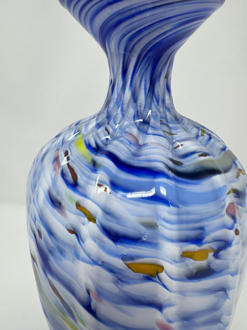 Blue & White Multicolor Swirl Blown Glass Vase. 9.5” Tall