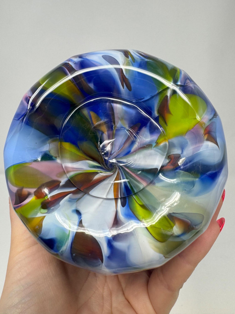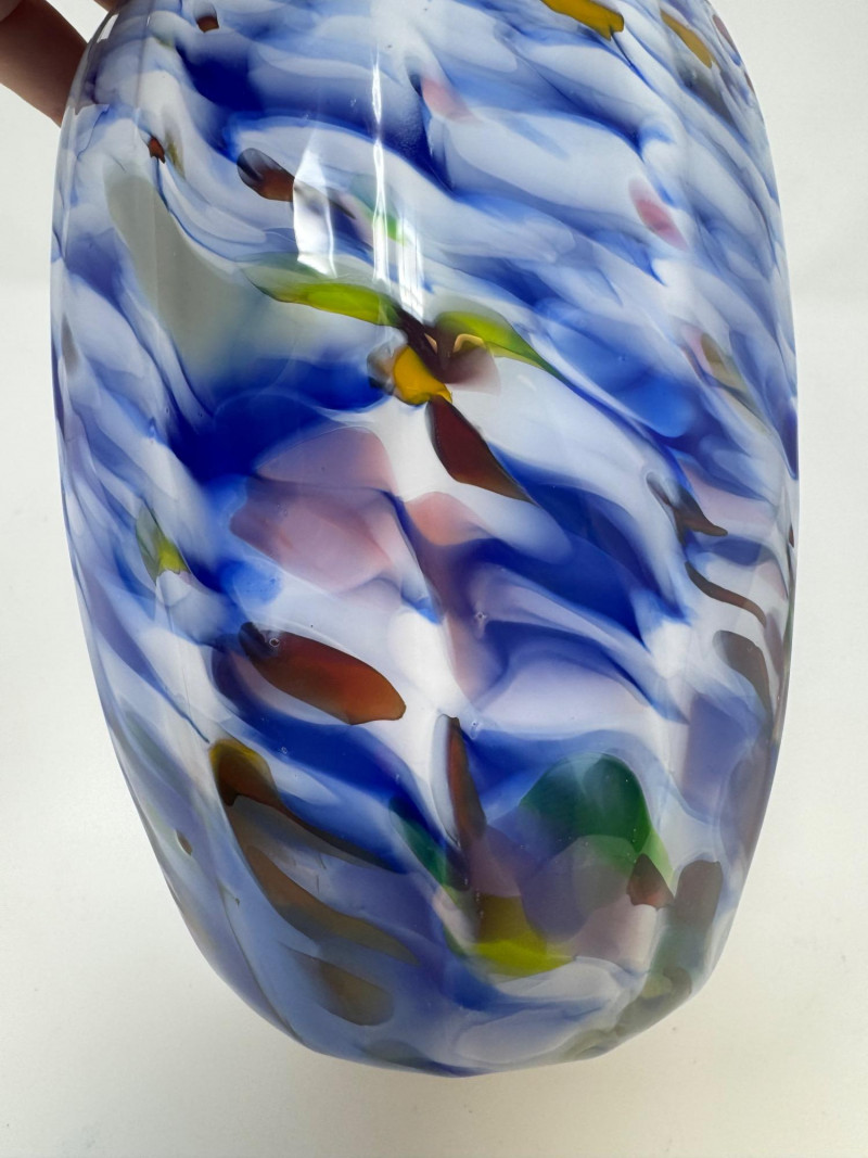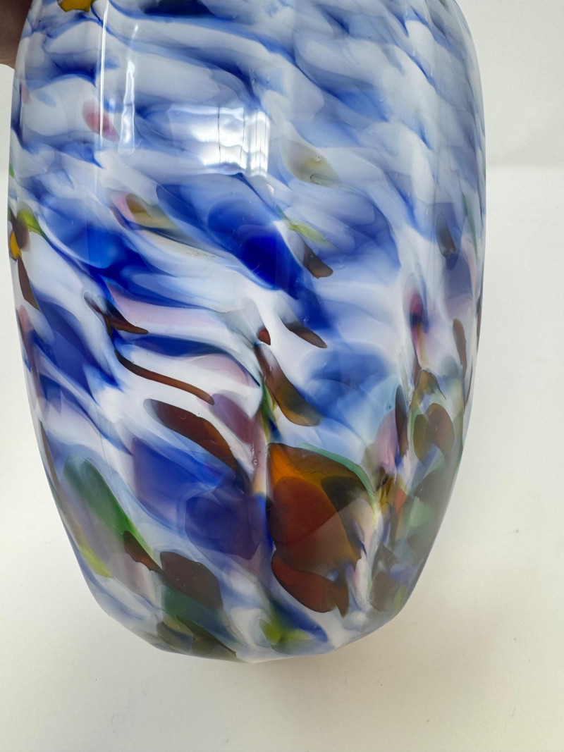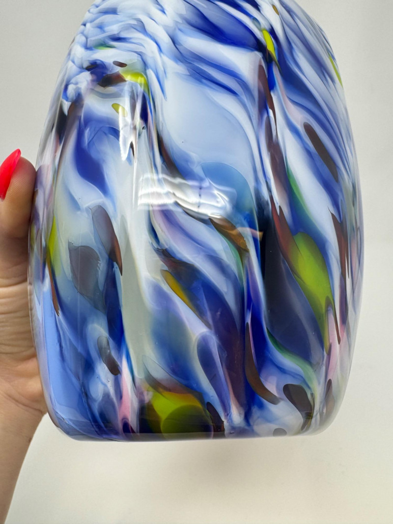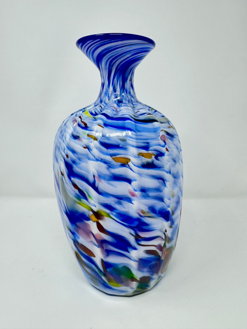 Blue & White Multicolor Swirl Blown Glass Vase. 9.5” Tall