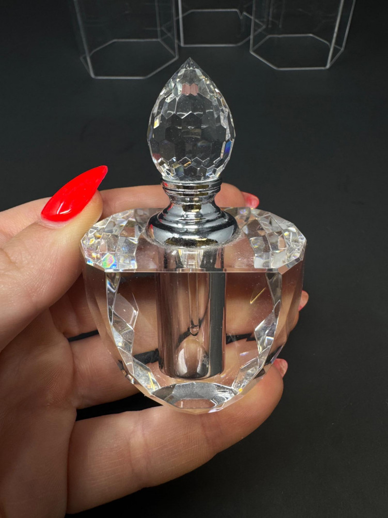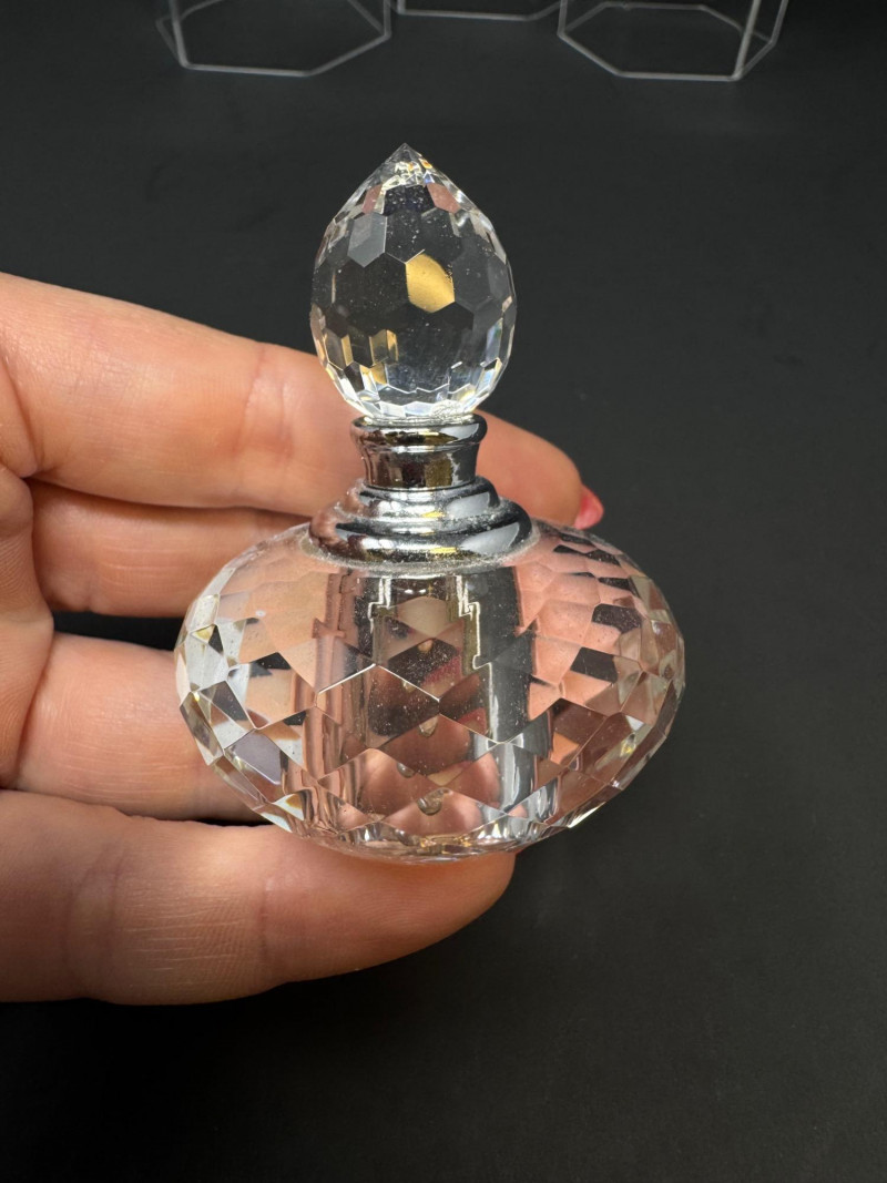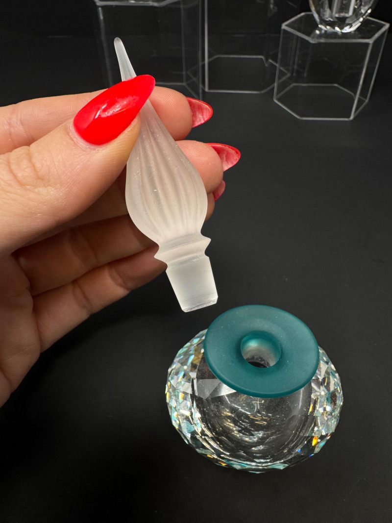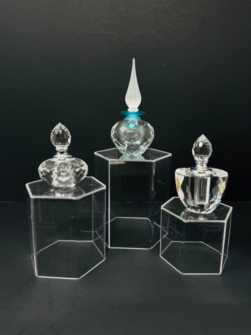 Swarovski Crystal Flacon + 2 Etched Faceted Crystal Perfume Bottles. 2.5-4.5” Tall