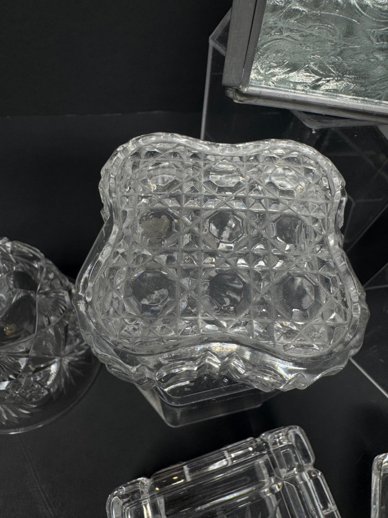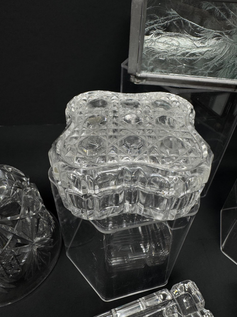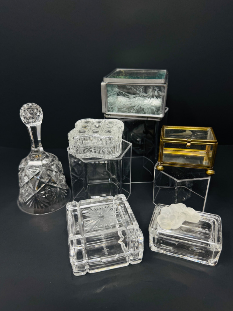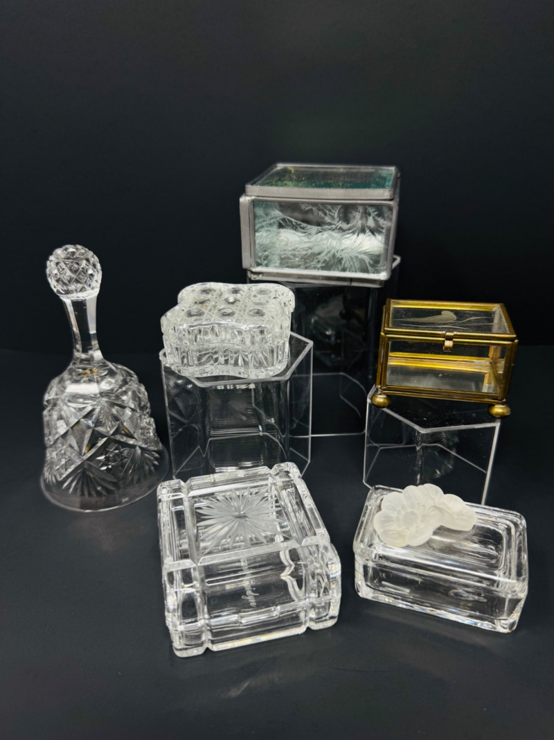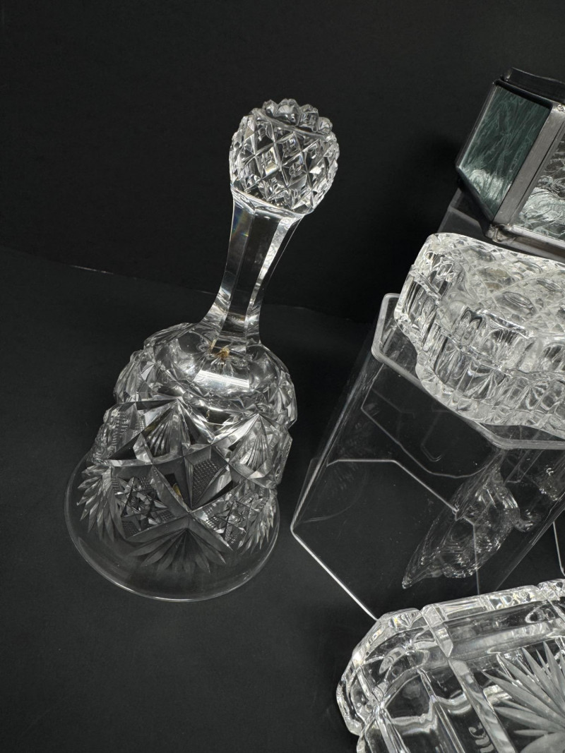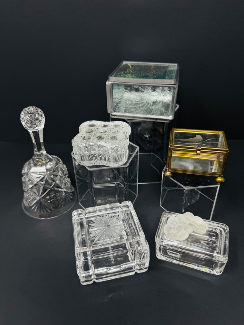 Cut Glass Bell & 5 Glass/Crystal Trinket Boxes – Frosted & Clear. 2.5-3.5”