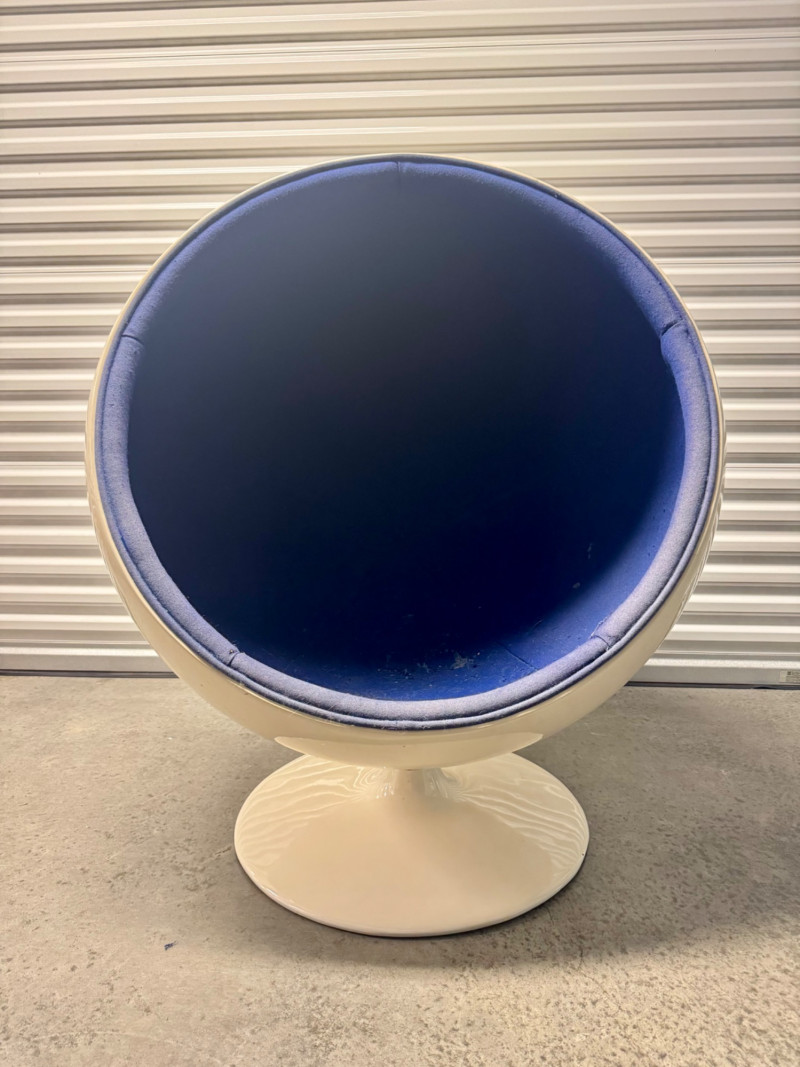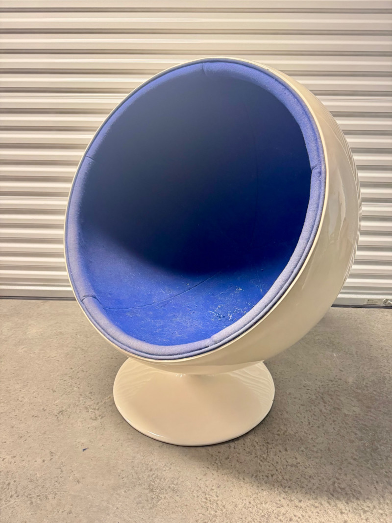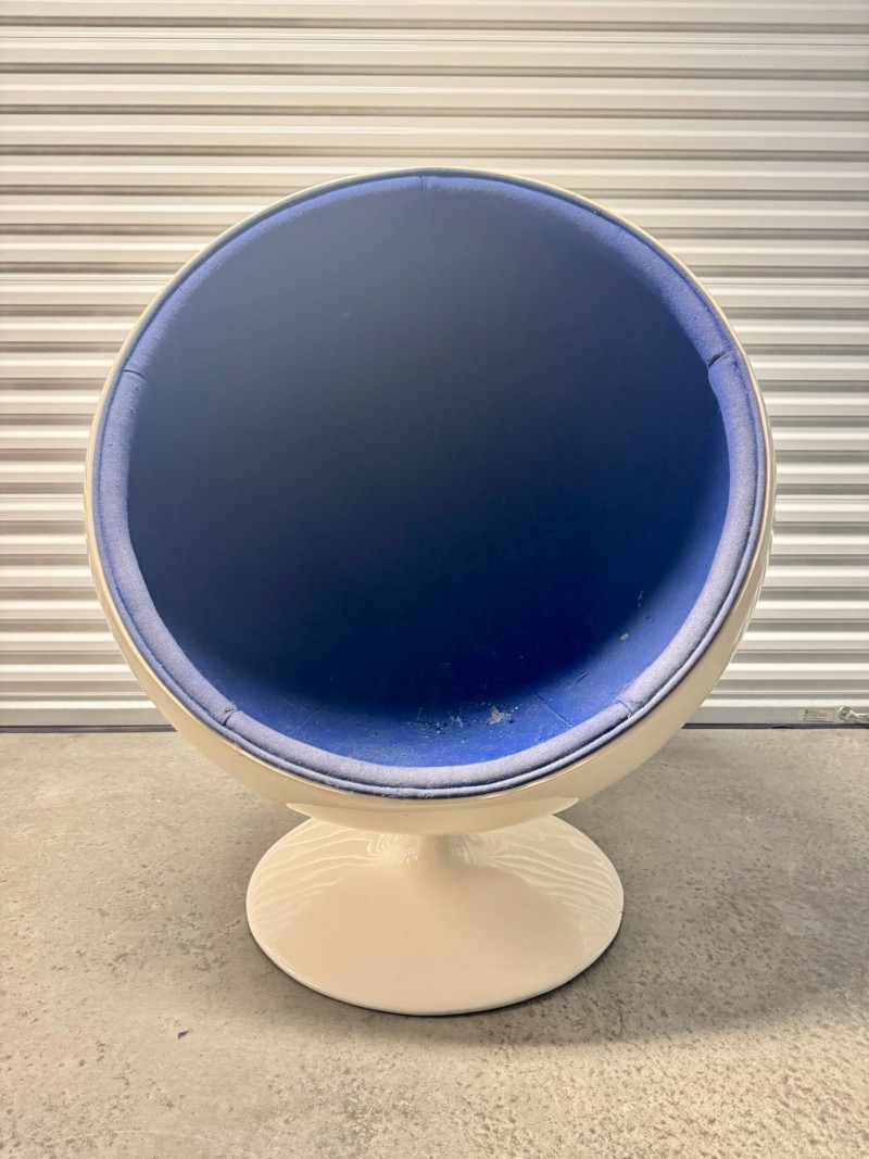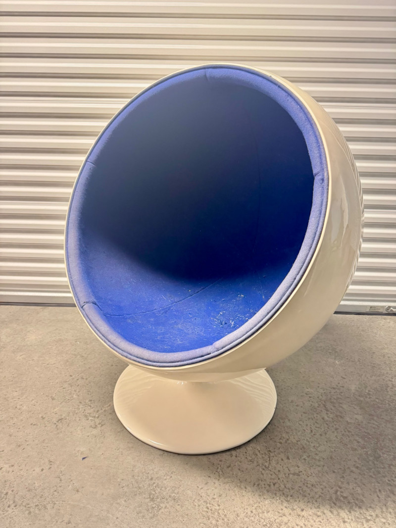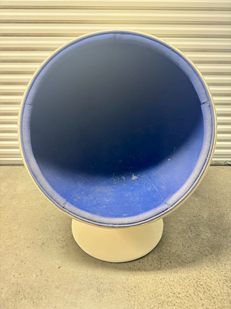 Retro Egg Chair in Style of Eero Aarnio "Ball Chair" – See Notes. Retro modern egg chair inspired by Eero Aarnio’s iconic “Ball Chair.” Dimensions: 46” tall x 38” wide White outer shell in good condition Blue interior fabric is deteriorating and needs reupholstery (disintegrates when cleaned) Note: No maker’s markings found. Sold as-is. See photos for condition details. Bidding on this lot is an agreement that: (1.) You will have at least 2 capable, able bodied persons to lift and load at a minimum. (2.) You will bring a hand truck and/or any other tools needed to remove this item. If these steps are not followed your item will be forfeit and no refund given.