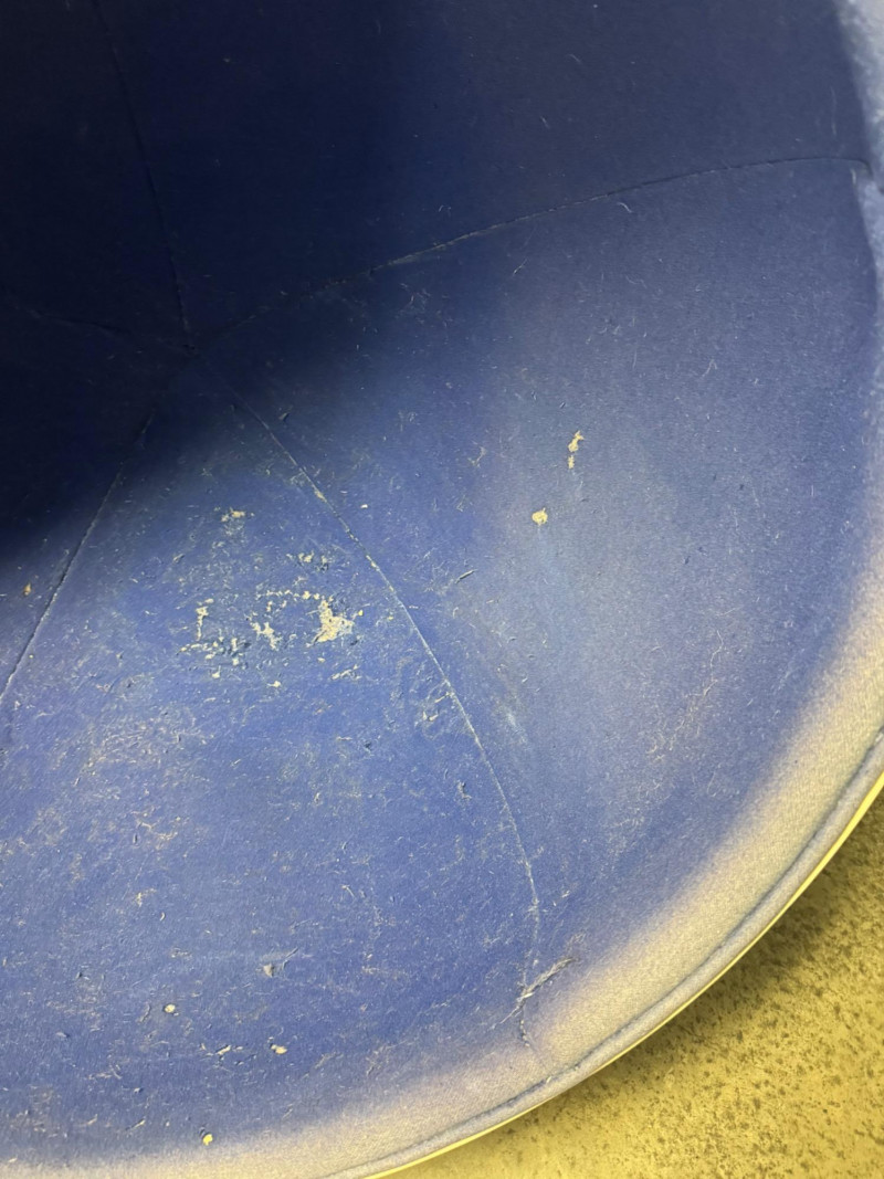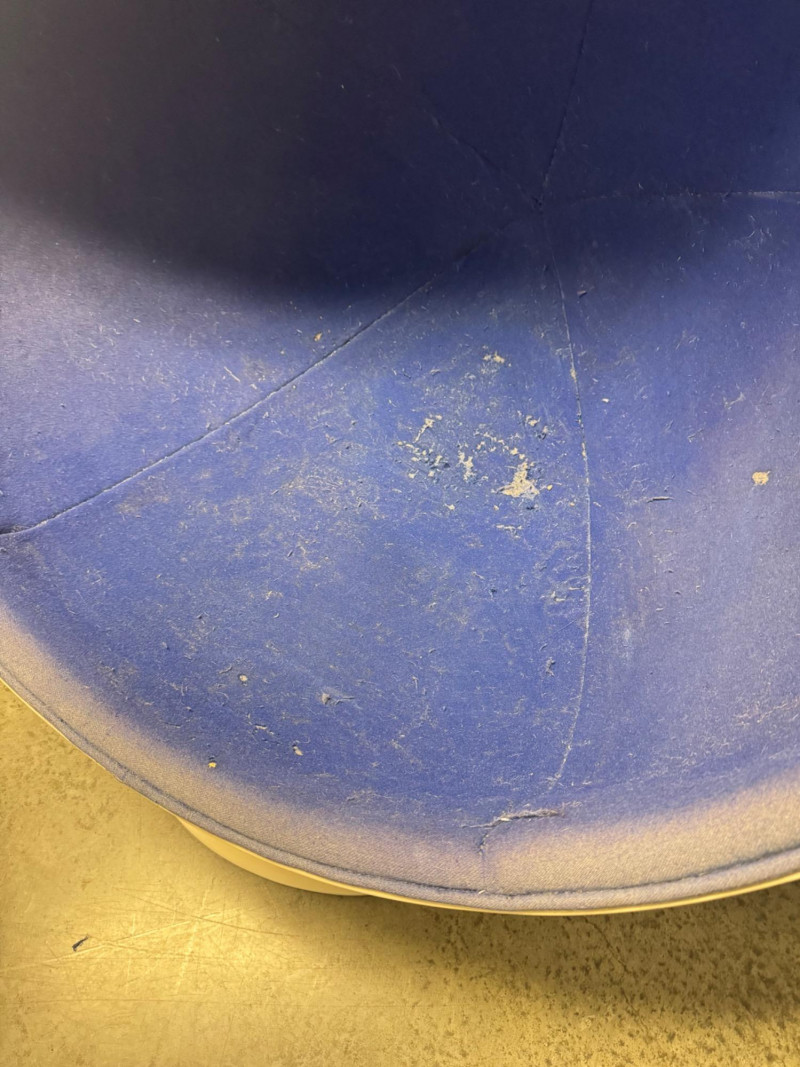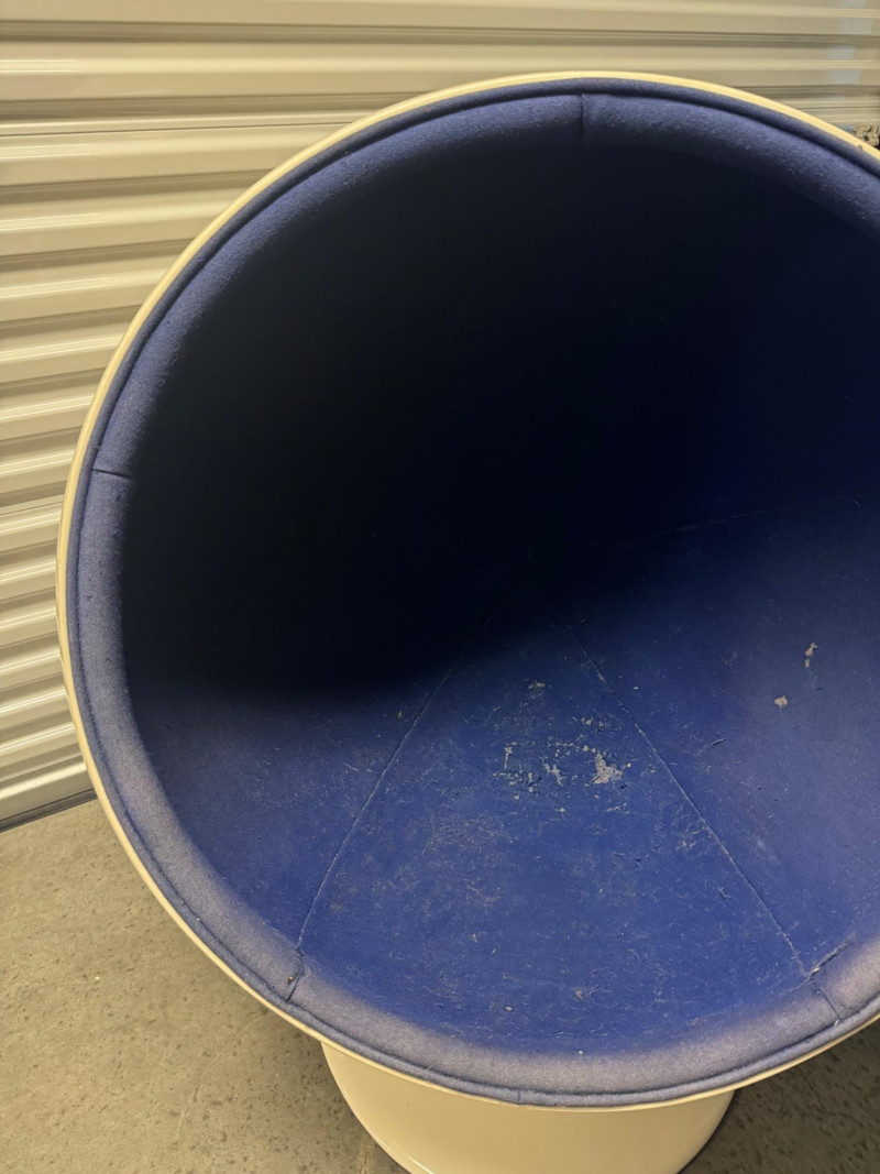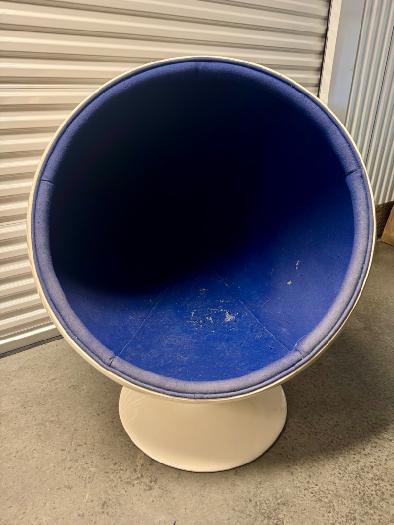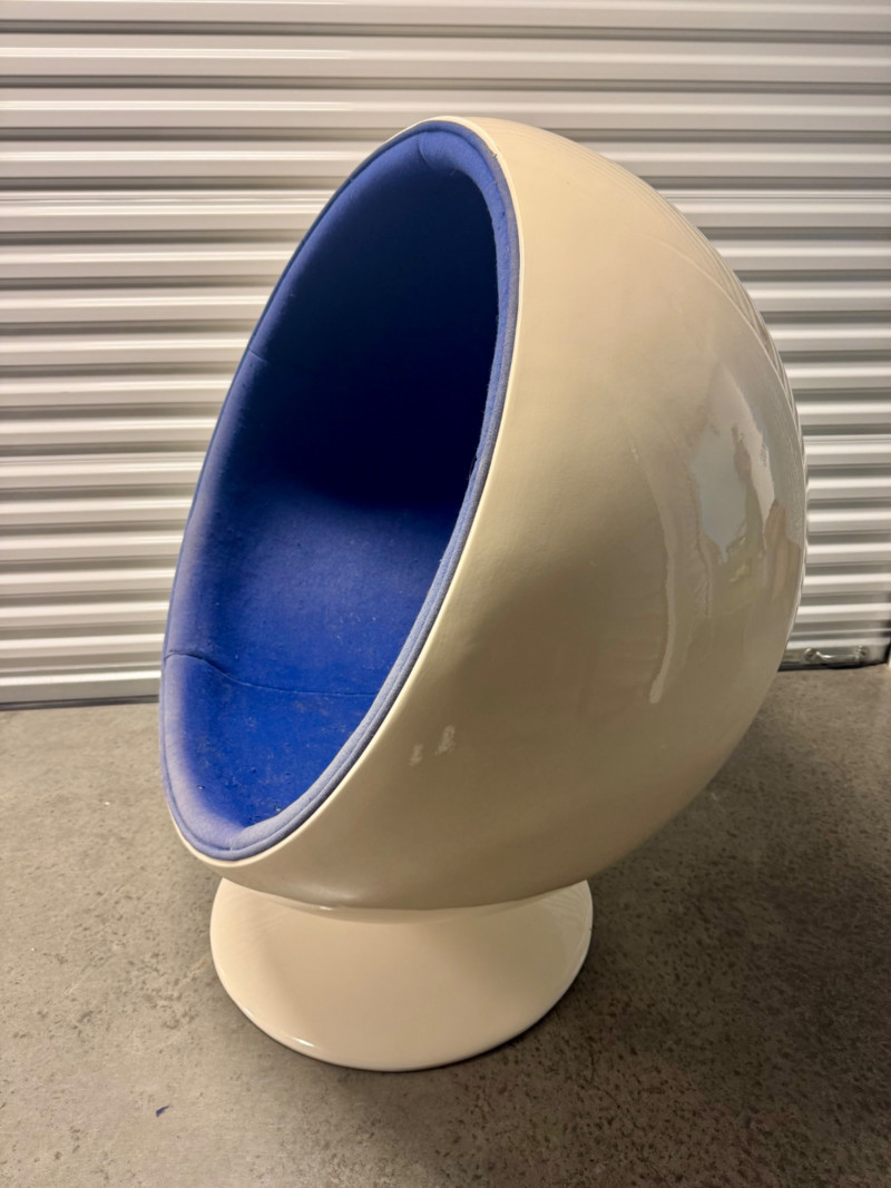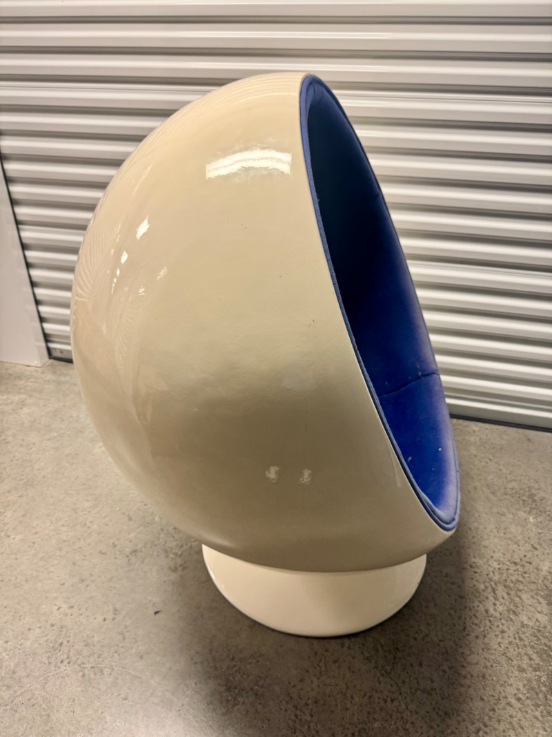 Retro Egg Chair in Style of Eero Aarnio "Ball Chair" – See Notes. Retro modern egg chair inspired by Eero Aarnio’s iconic “Ball Chair.” Dimensions: 46” tall x 38” wide White outer shell in good condition Blue interior fabric is deteriorating and needs reupholstery (disintegrates when cleaned) Note: No maker’s markings found. Sold as-is. See photos for condition details. Bidding on this lot is an agreement that: (1.) You will have at least 2 capable, able bodied persons to lift and load at a minimum. (2.) You will bring a hand truck and/or any other tools needed to remove this item. If these steps are not followed your item will be forfeit and no refund given.