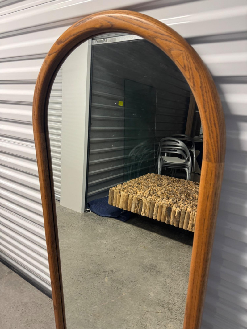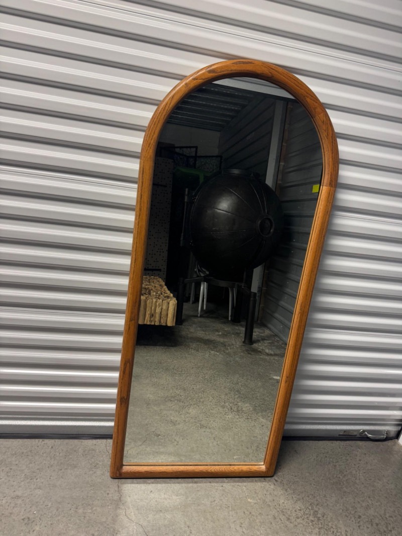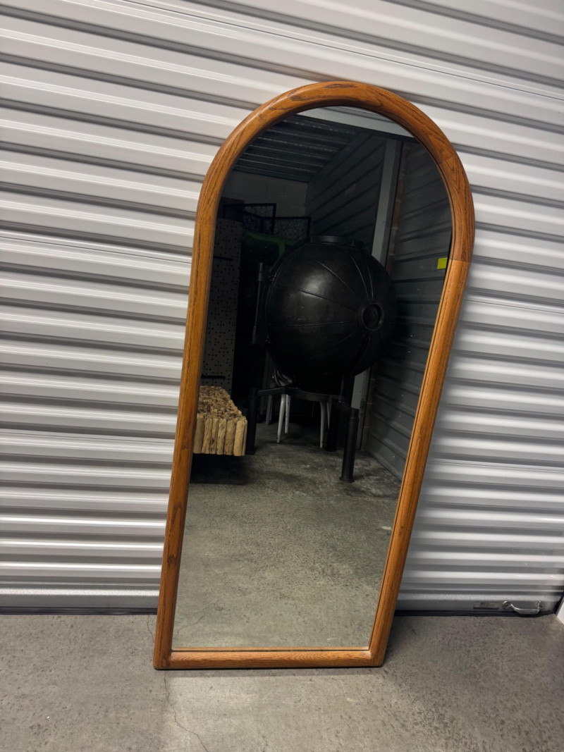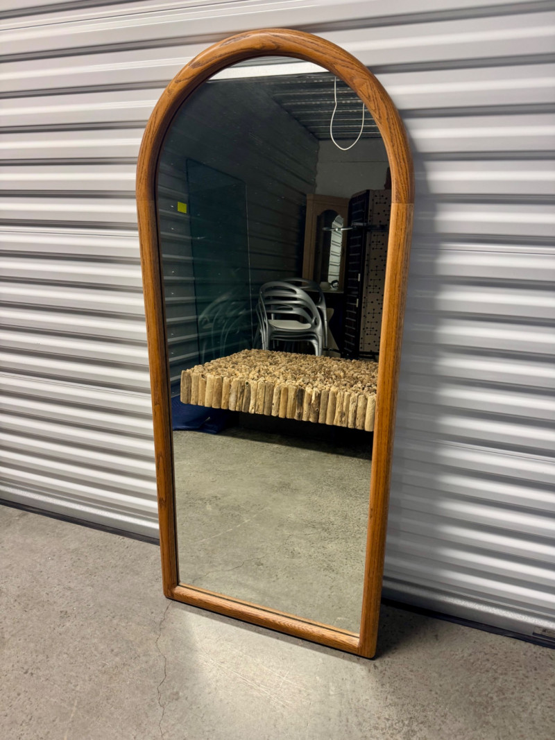 Tall Arched Wall Mirror W/ Solid Oak Frame. Dimensions: 61.5” tall x 27” wide