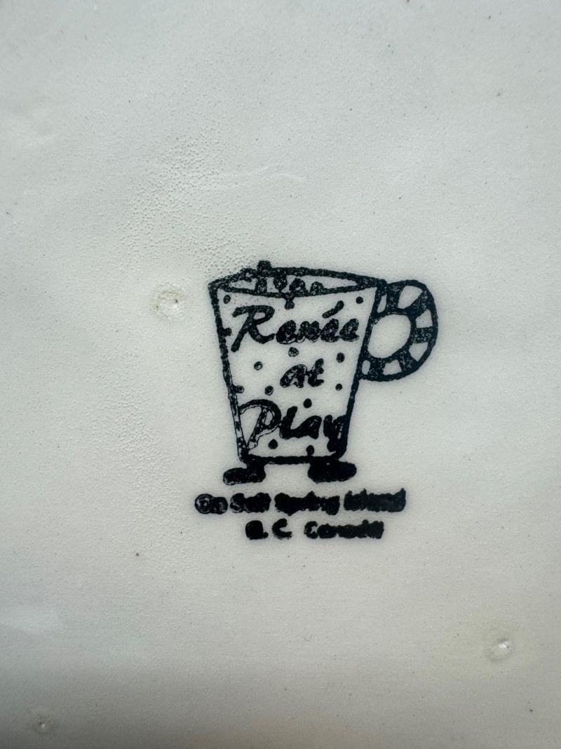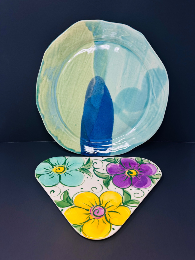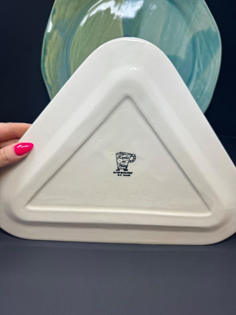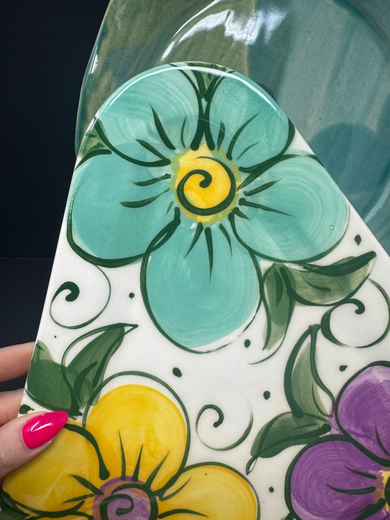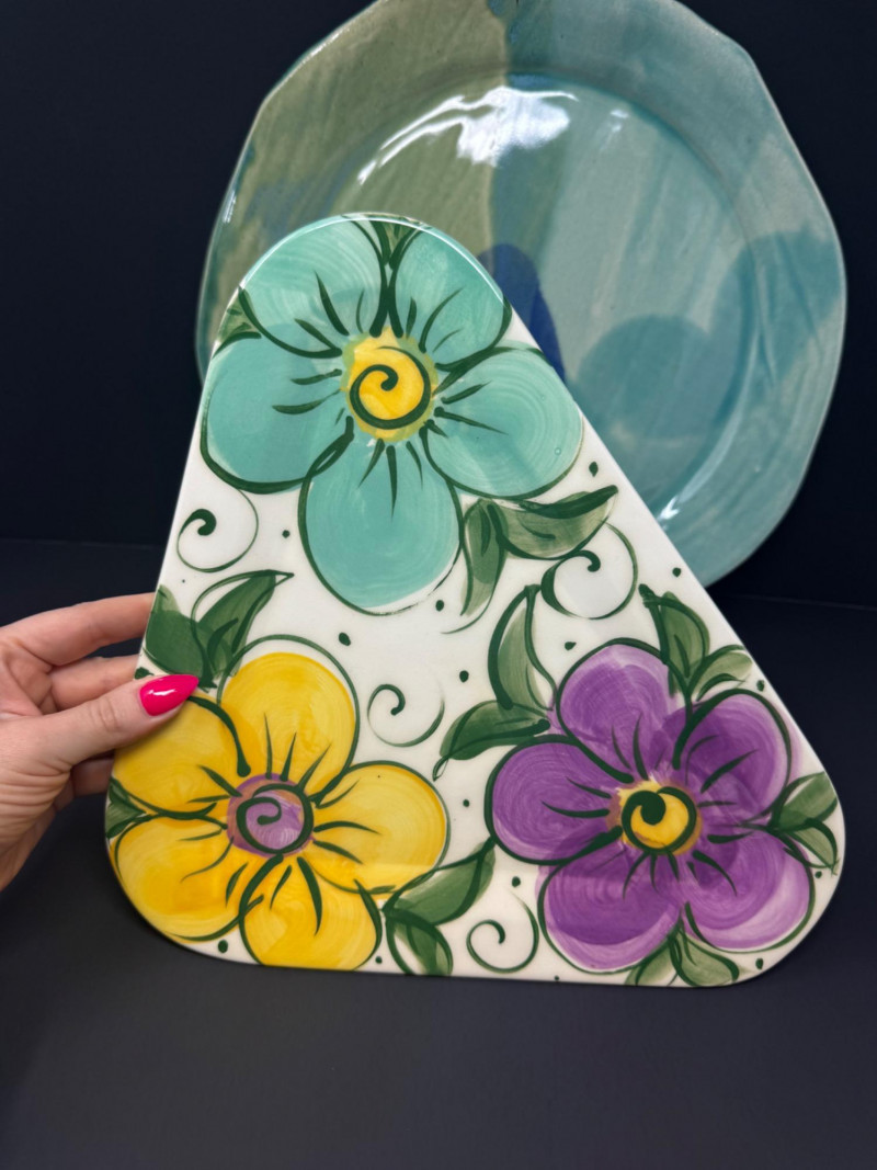 Signed Teal Pottery Plate & Renee at Play Floral Plate Lot. Triangular plate with hand-painted floral design (yellow, teal, purple)