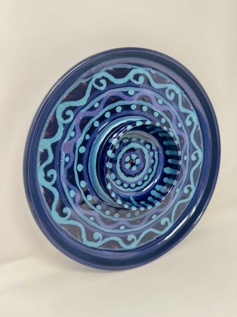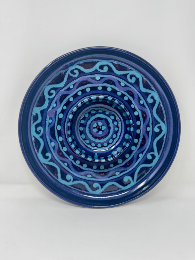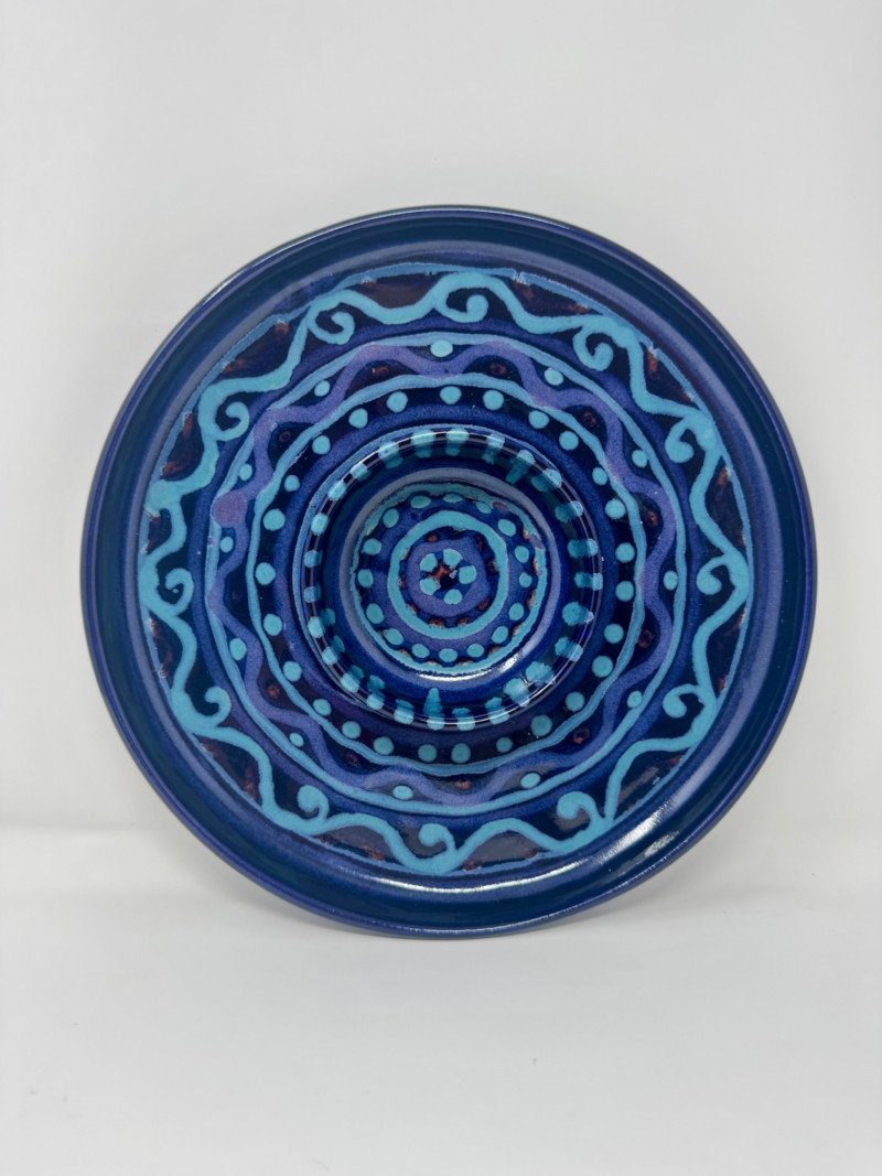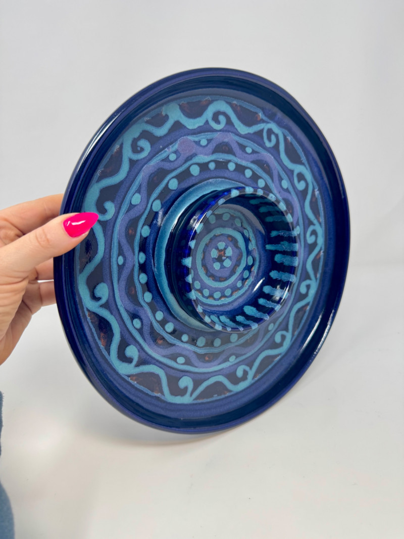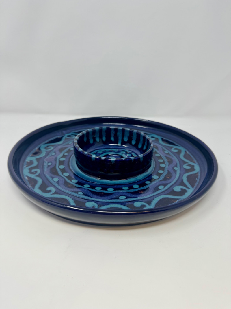 Blue Hand-Painted Chip & Dip Plate w/ Built-In Center Bowl. Approx. 12" diameter.