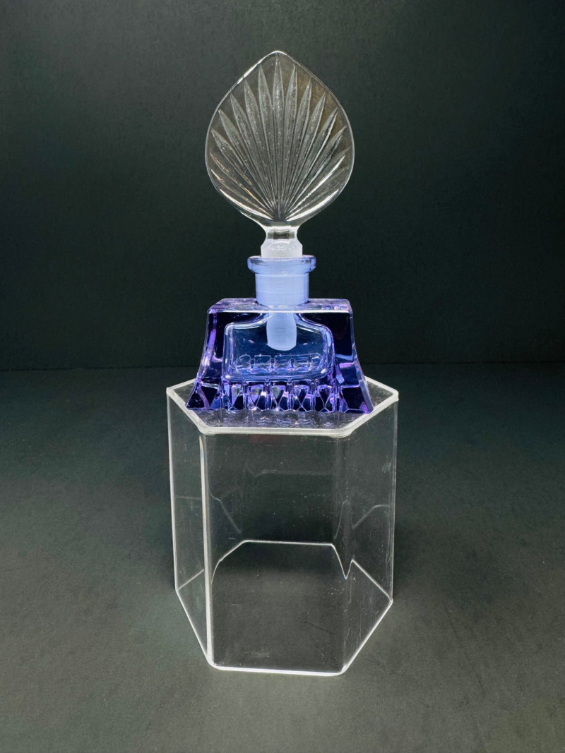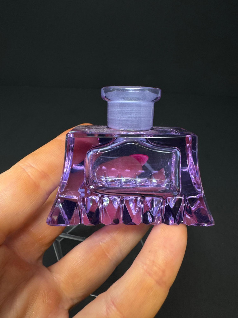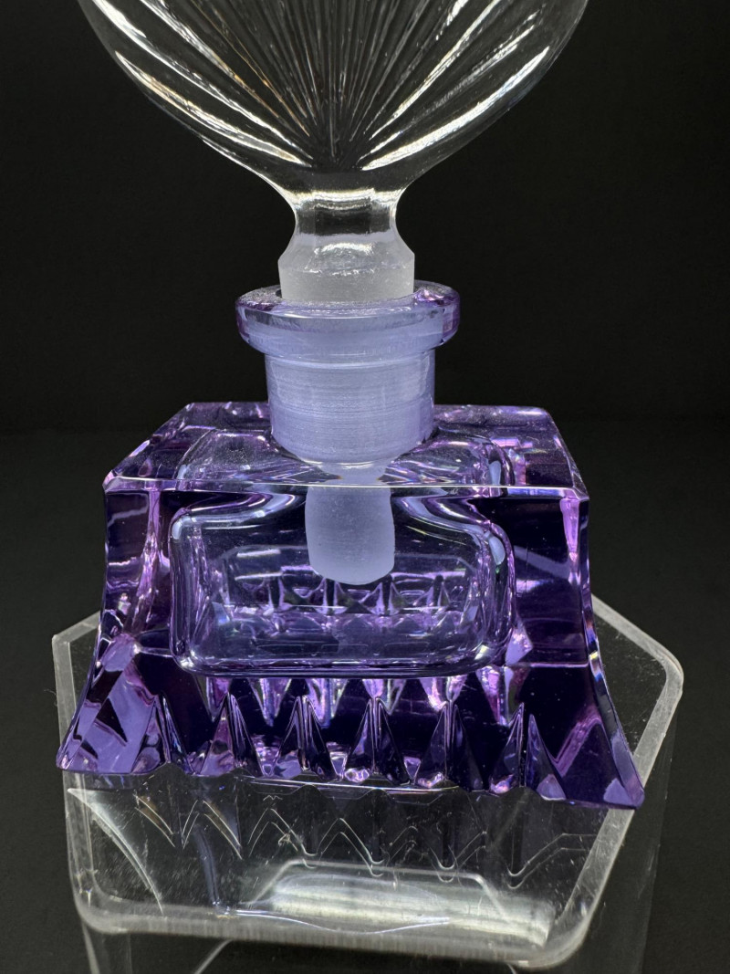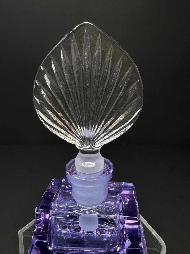 Purple Cut Crystal Perfume Bottle w/ Etched Leaf-Shaped Stopper. 4.5” Tall