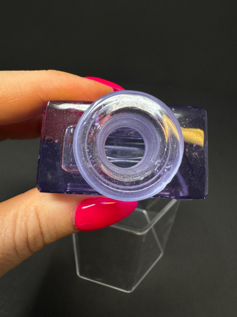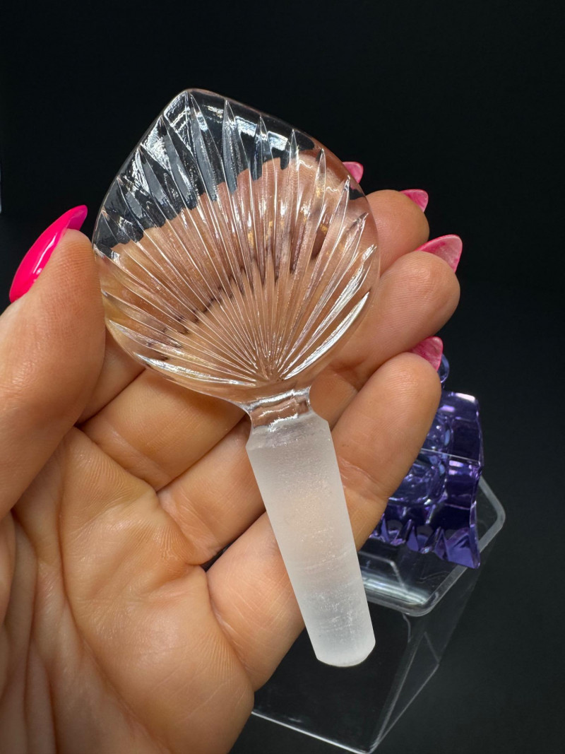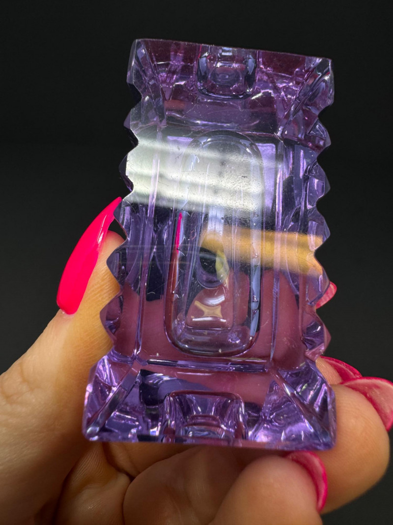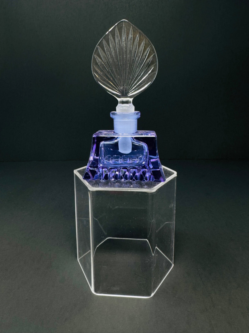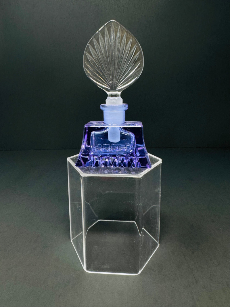 Purple Cut Crystal Perfume Bottle w/ Etched Leaf-Shaped Stopper. 4.5” Tall
