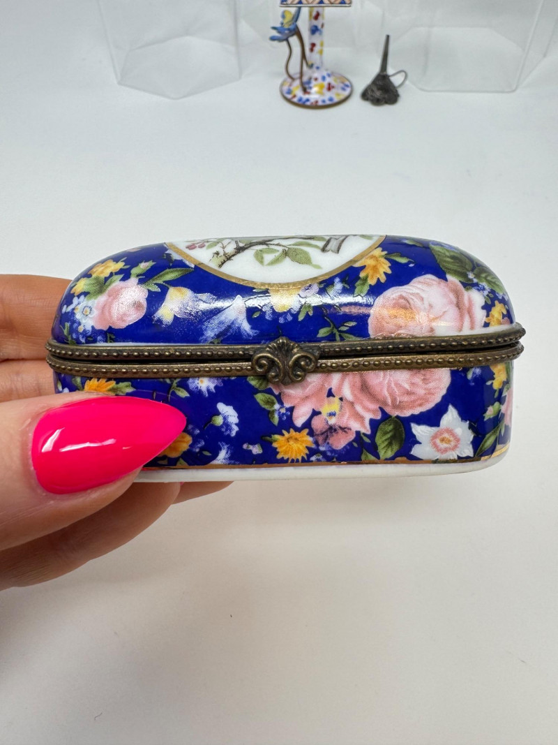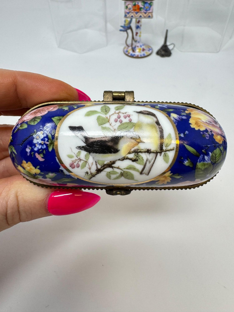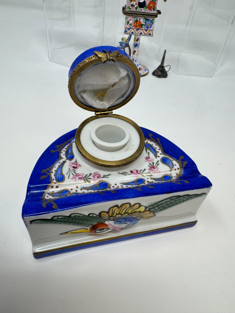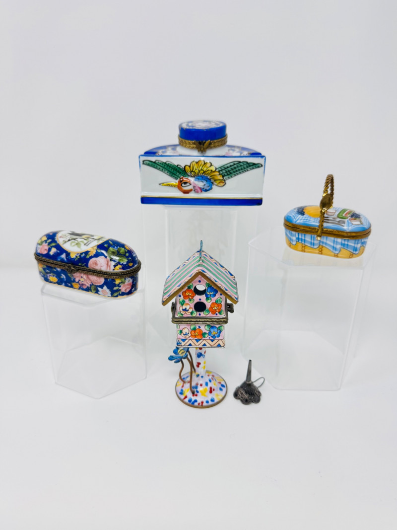 Porcelain Limoges Trinket Boxes, Portugal Trinket Box & Metal Funnel. Largest is 4" Tall