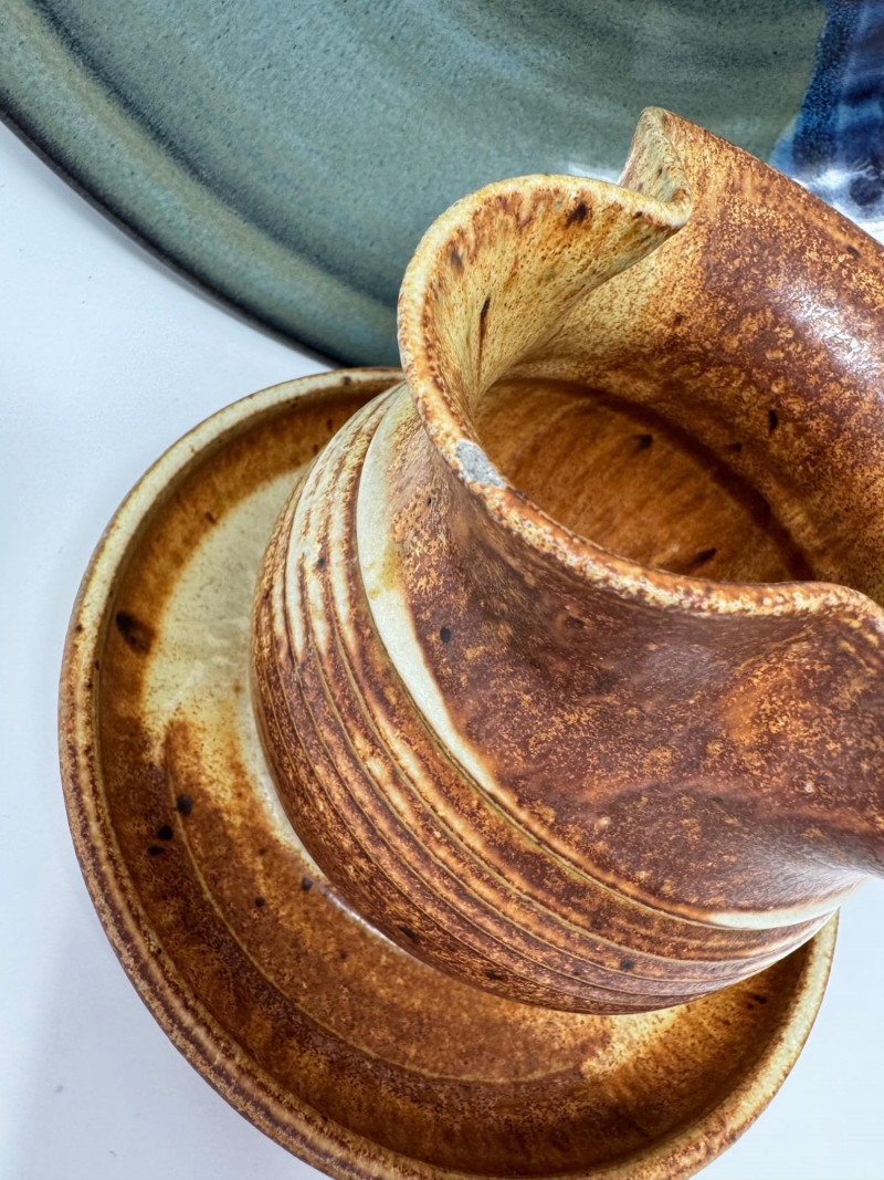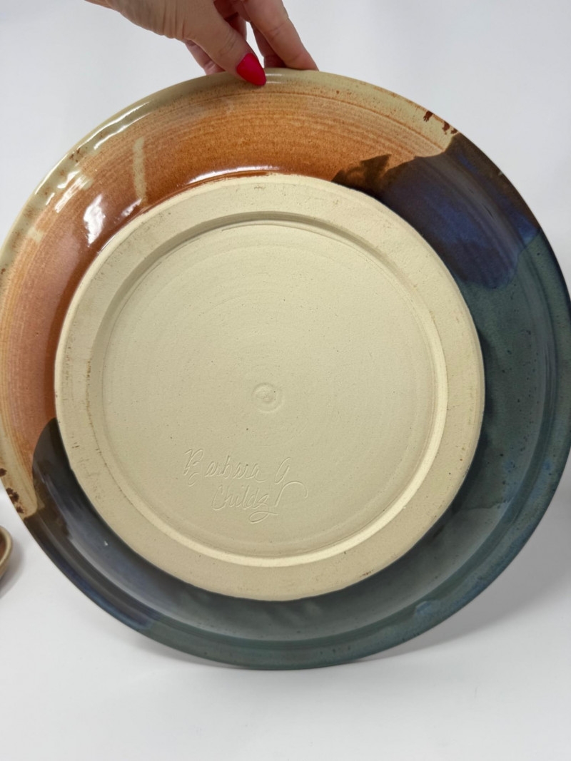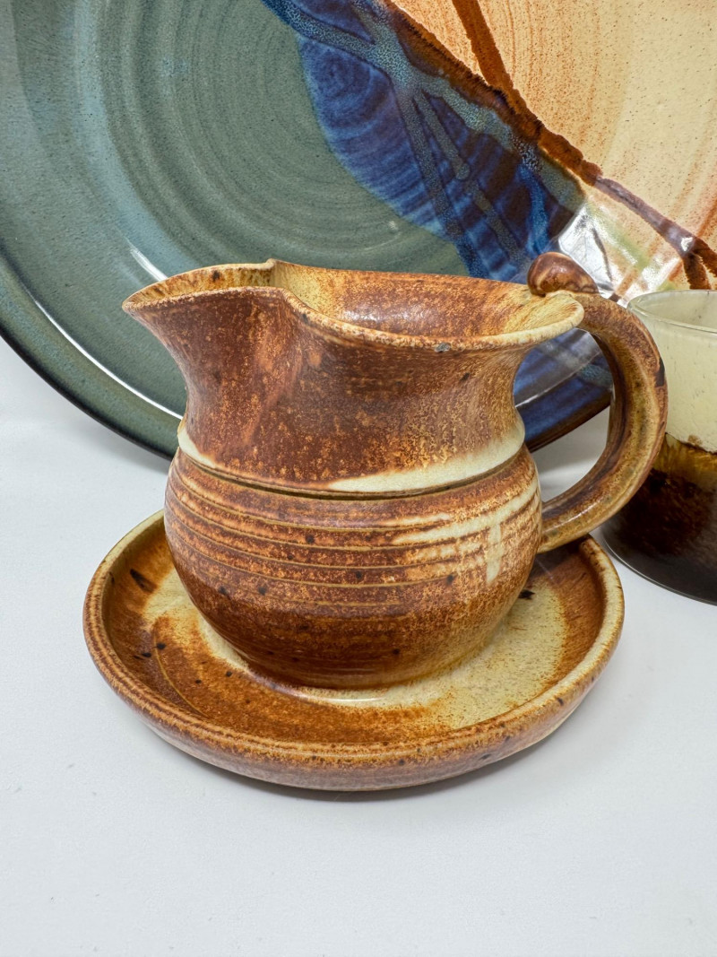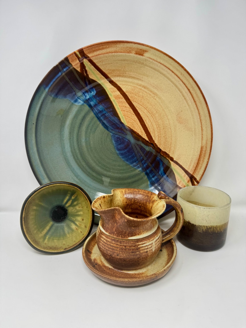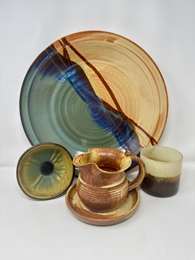Signed Studio Pottery & Glass Pieces– Platter, Pitcher, Bowl, & Votive.