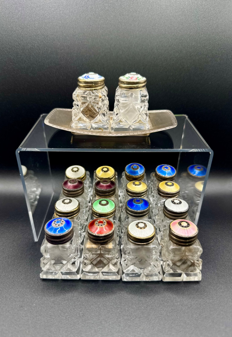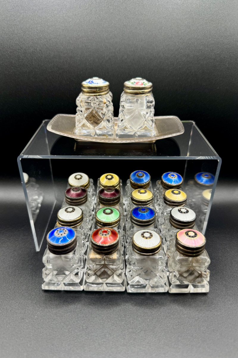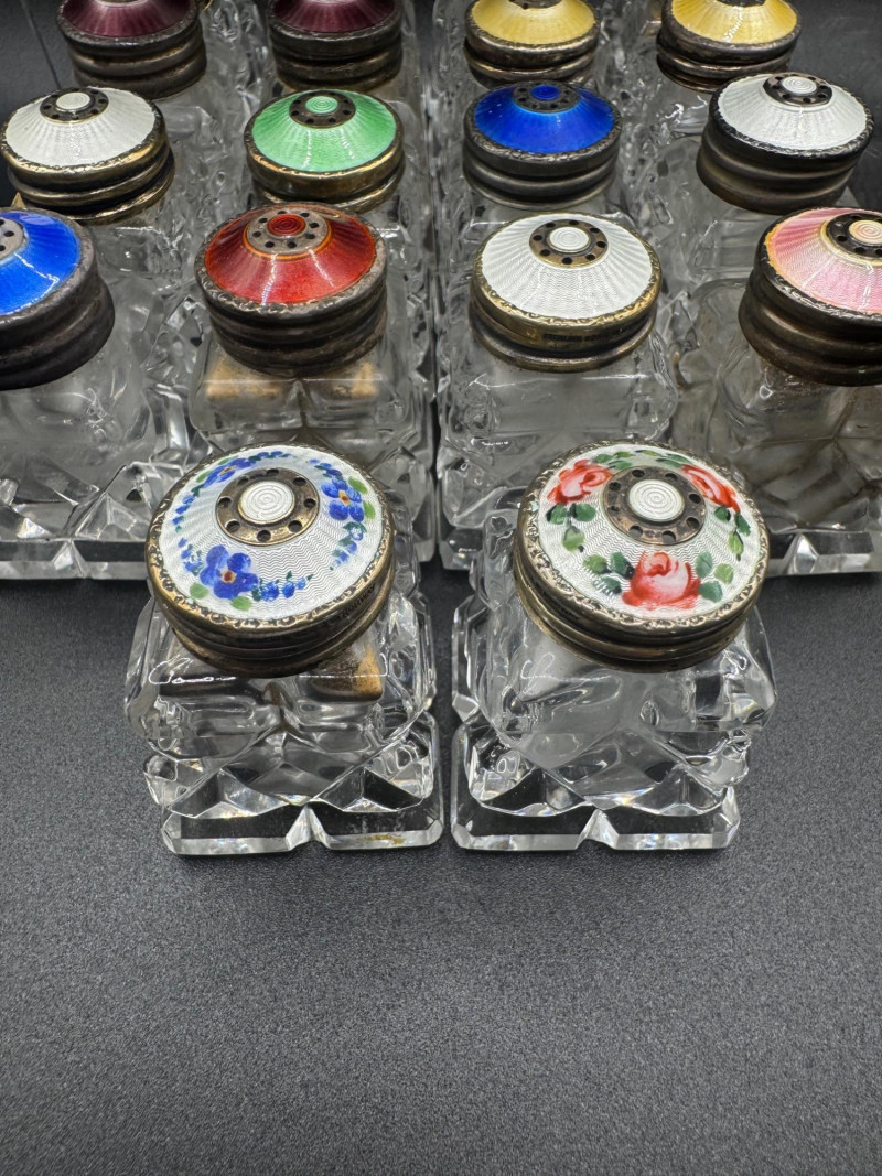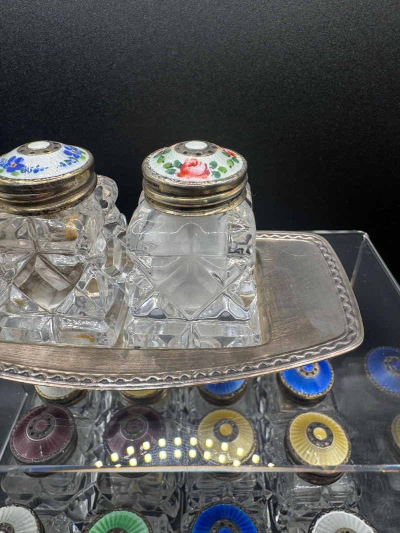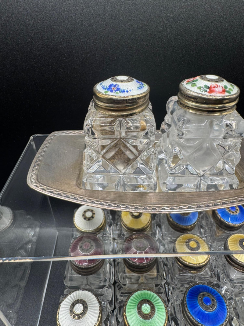Lot # 114 - Norway Crystal Salt & Pepper Shakers – Enamel Sterling Silver Tops