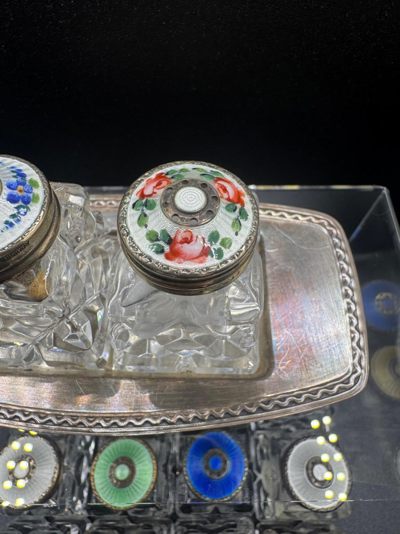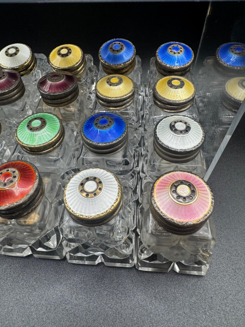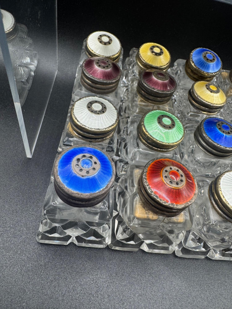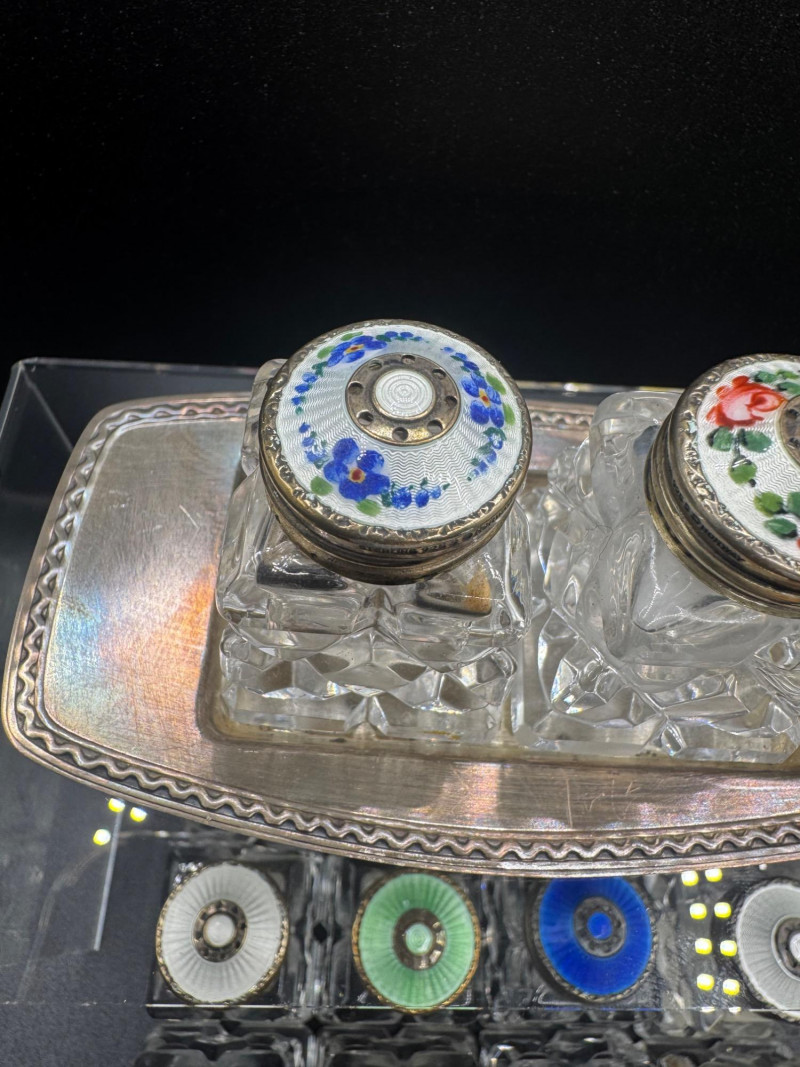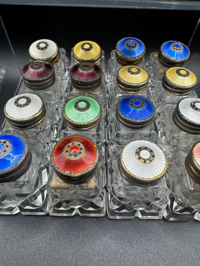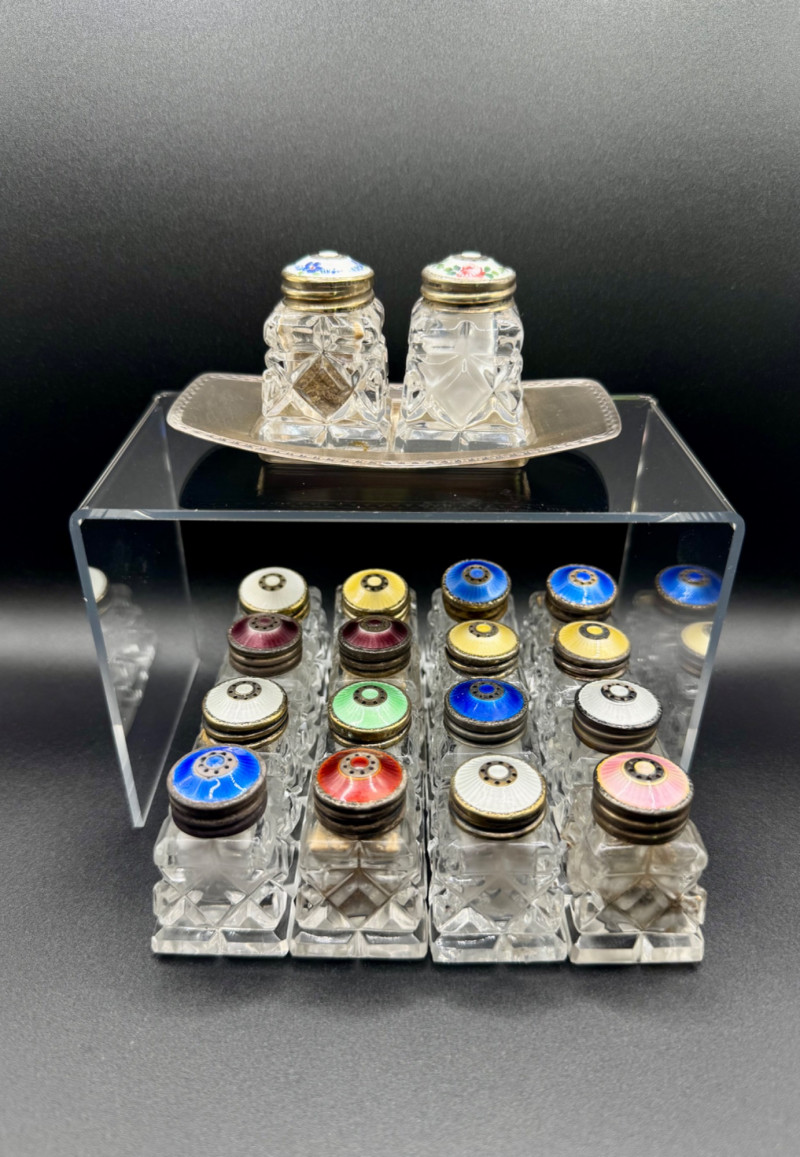 Lot # 114 - Norway Crystal Salt & Pepper Shakers – Enamel Sterling Silver Tops