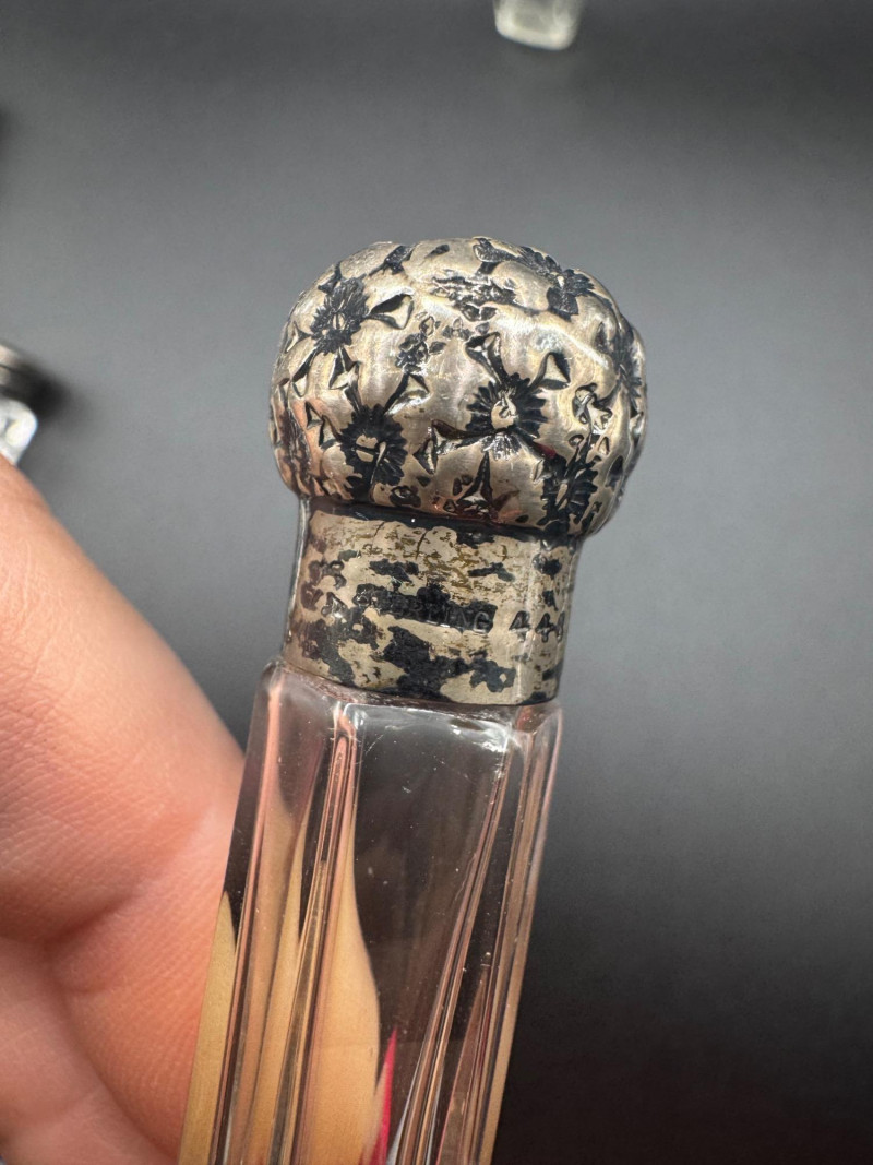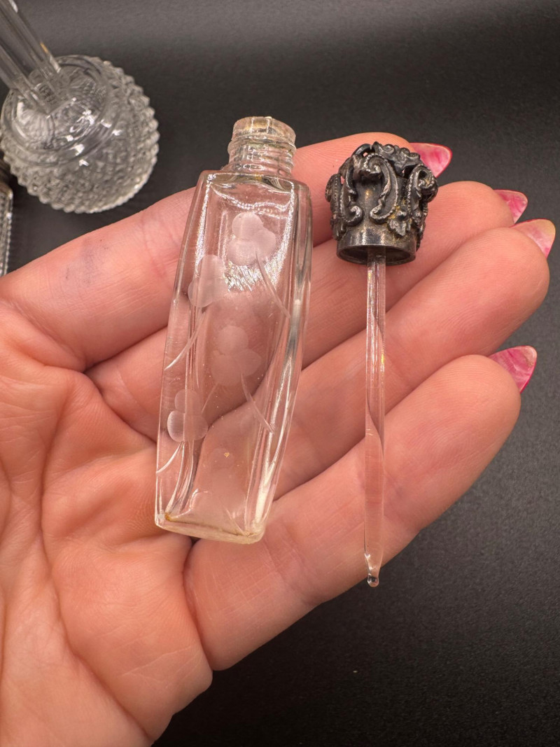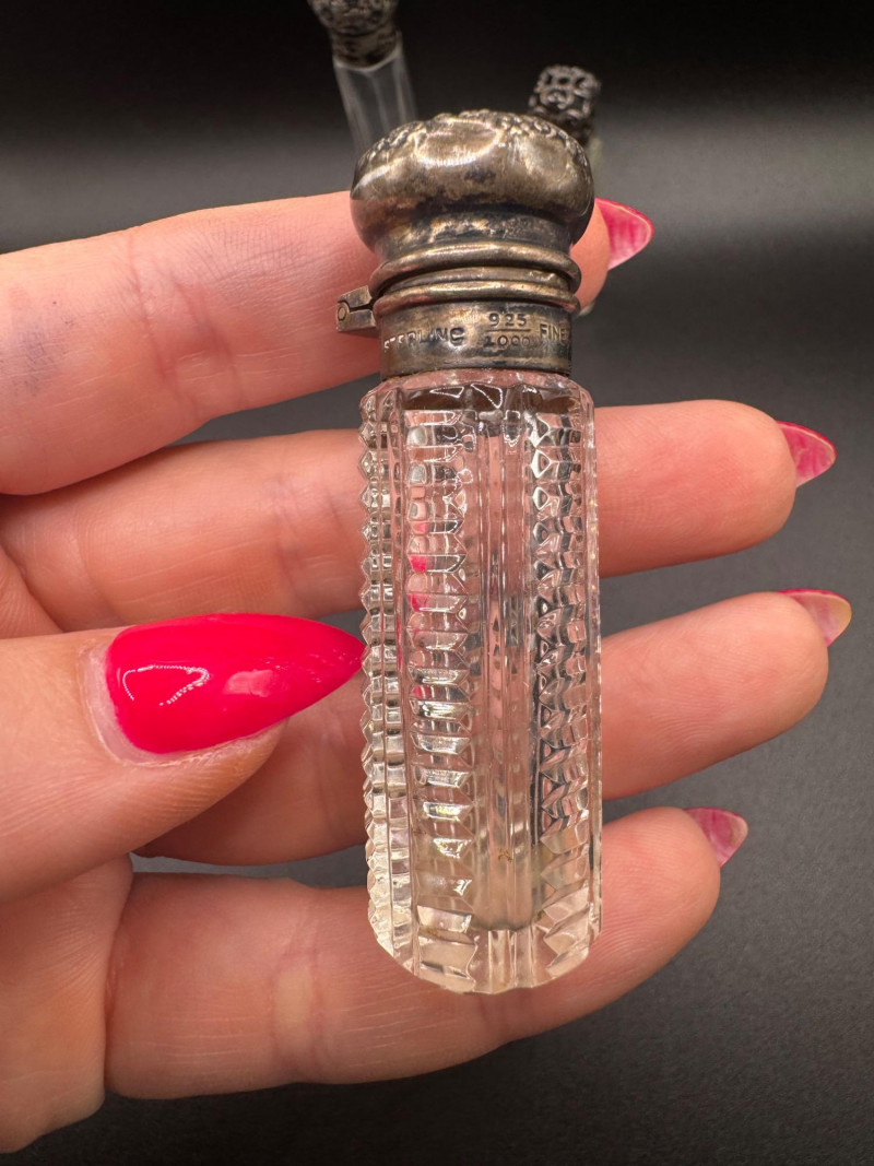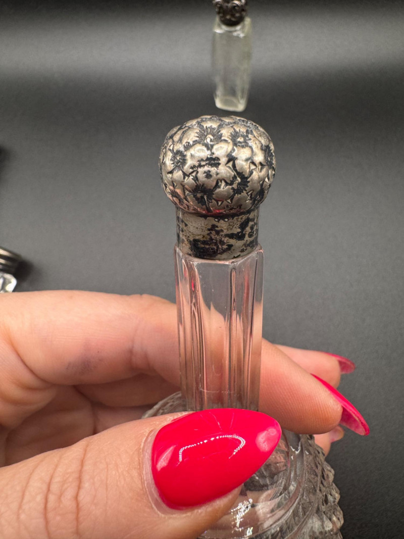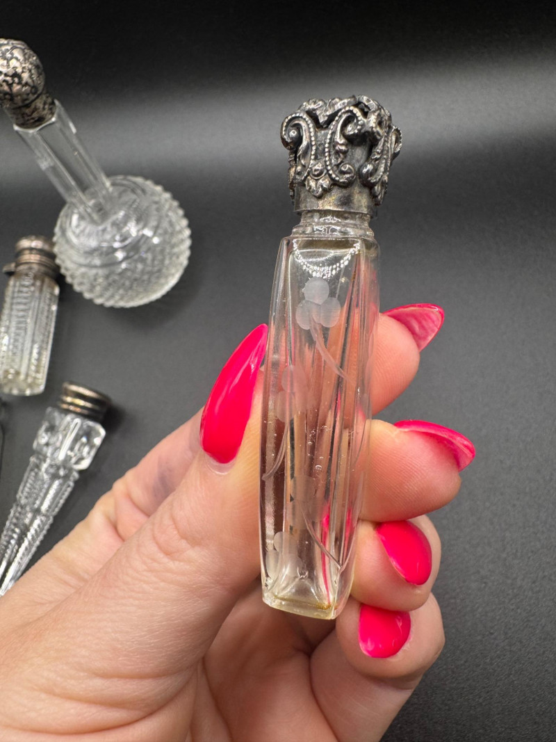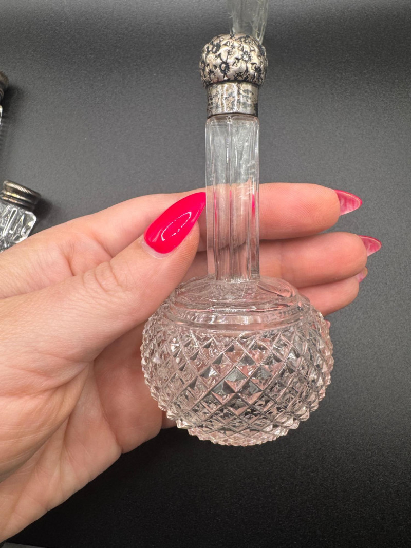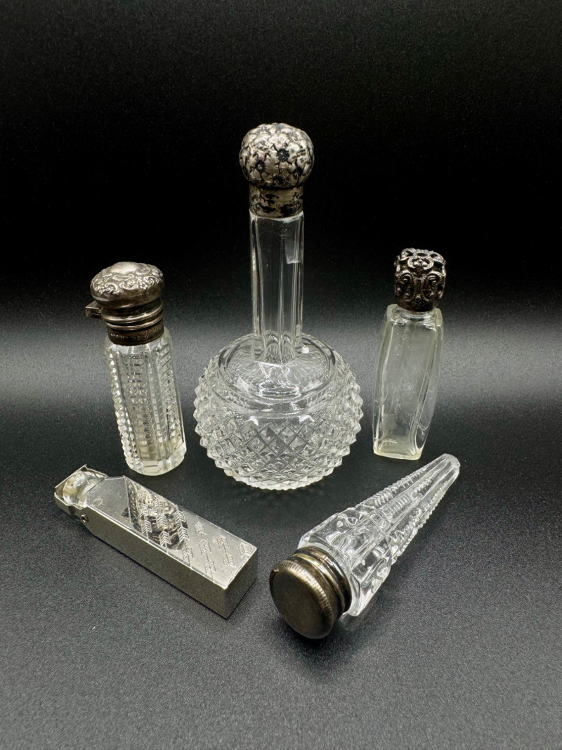 Antique Crystal Perfume Bottle Collection – 5 Pcs, 2 Sterling Tops.