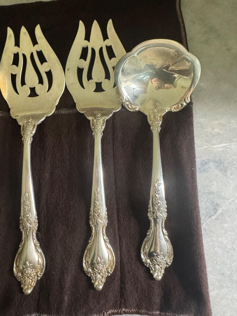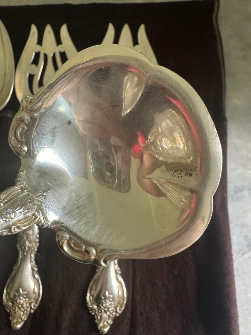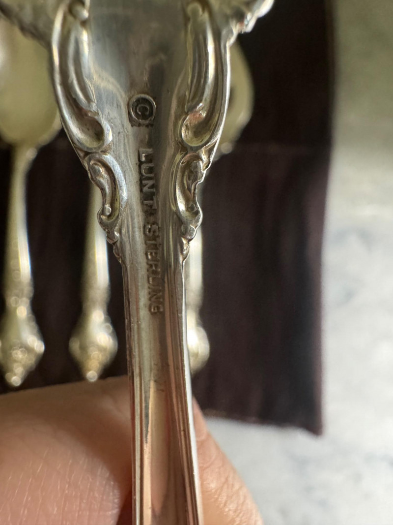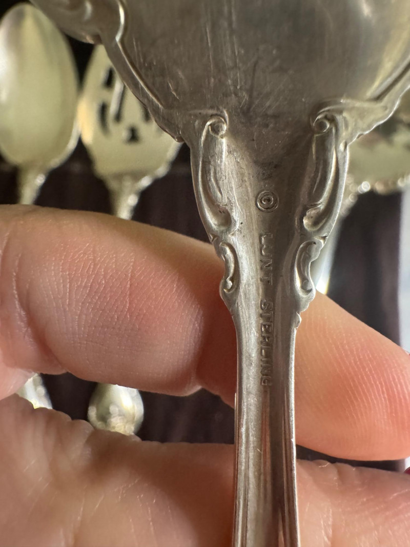 Lunt Sterling Silver Eloquence Pattern Serving Utensils – 6 Pc, 492g. Approx. 492.25 grams. Disclaimer: We do not test the metals of the items listed for auction. By placing a bid, you acknowledge and agree that you are purchasing the item "as is" and without any guarantee of metal quality. We do not offer refunds based on metal content or purity.