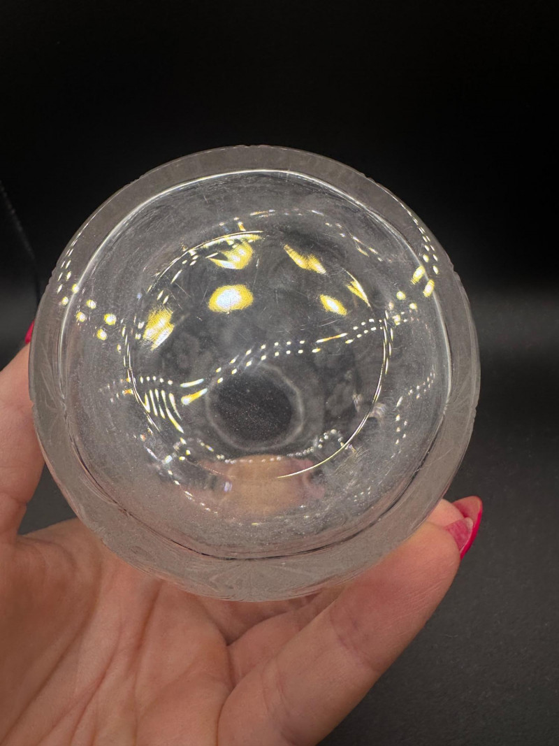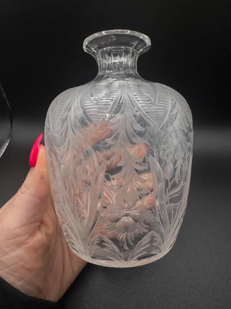 Cut Crystal Decanter w/ Stopper – Floral & Leaf Etched. Measures 7.25" tall.