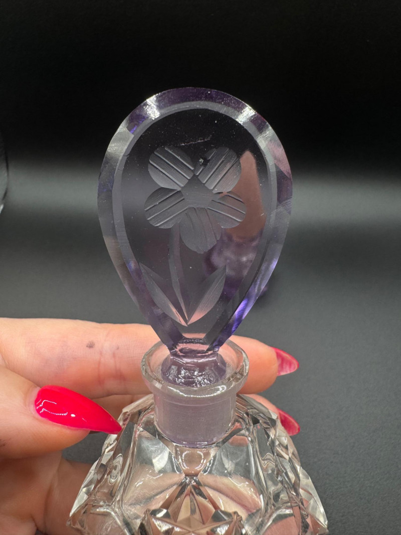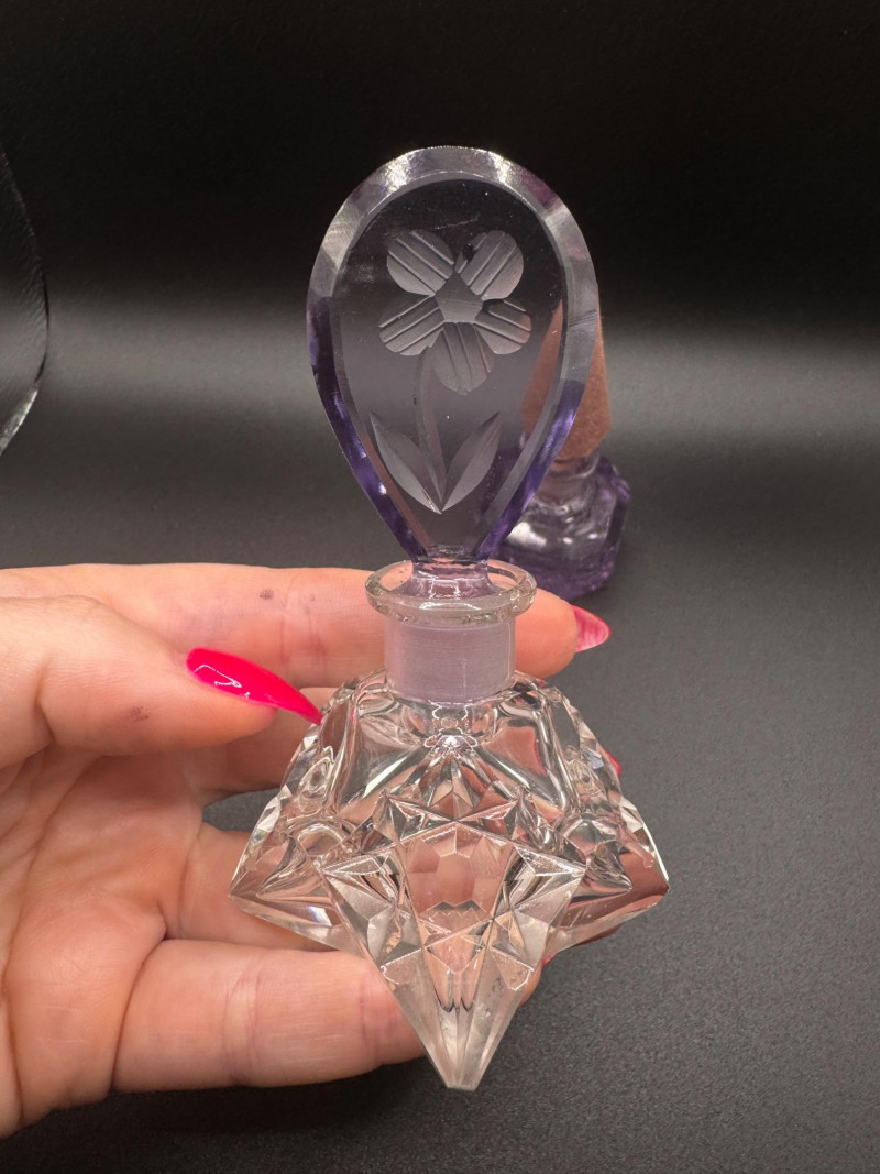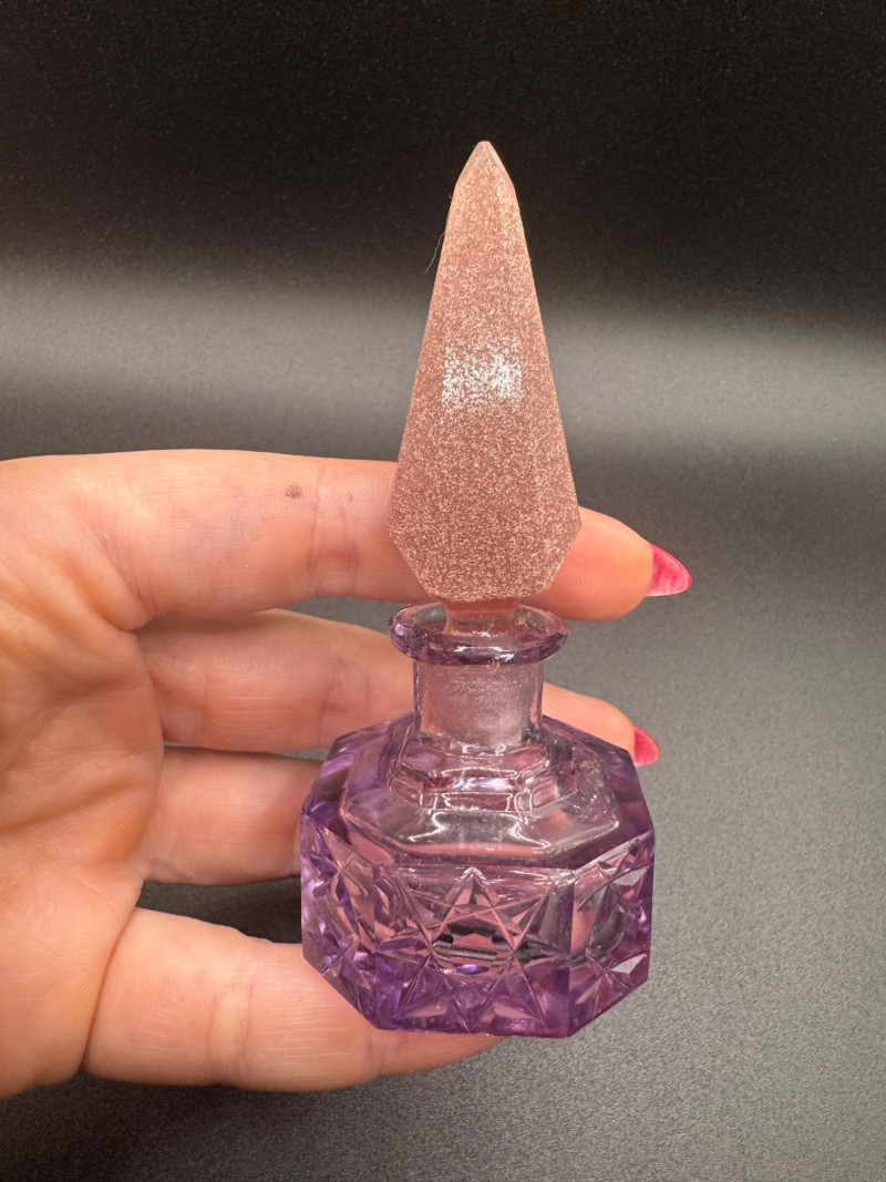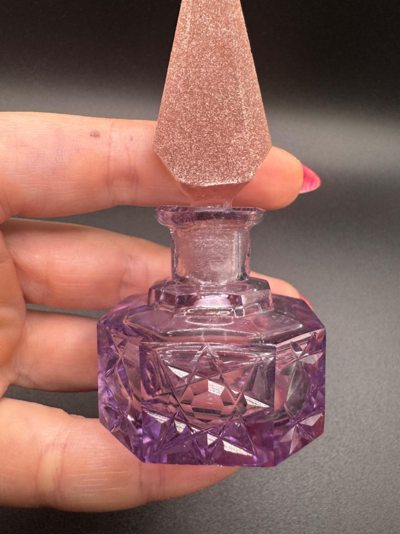 Czech Crystal Perfume Bottles – Frosted Pink & Etched Purple Stoppers.