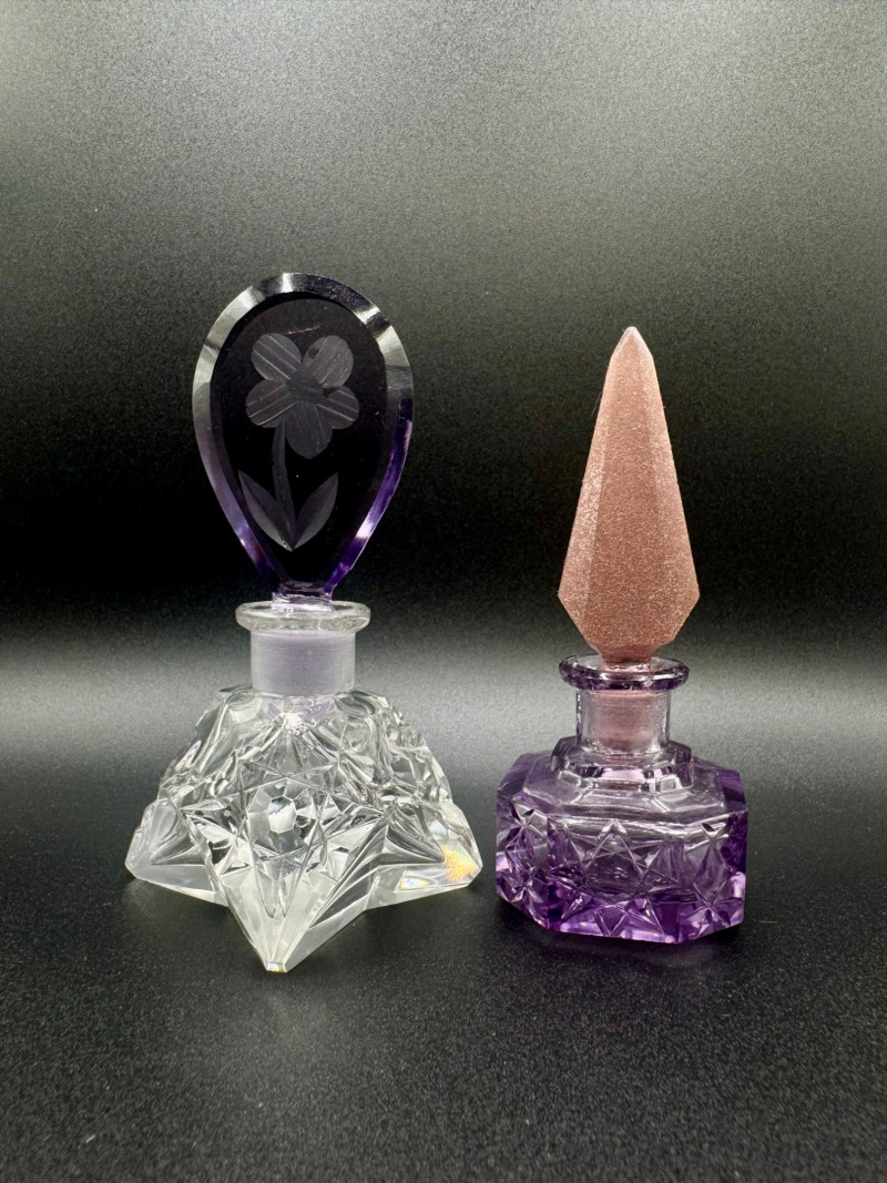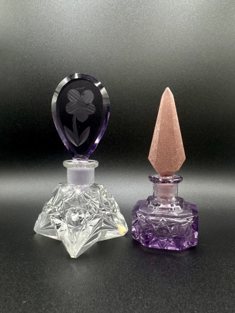 Lot # 121 - Czech Crystal Perfume Bottles – Frosted Pink & Etched Purple Stoppers