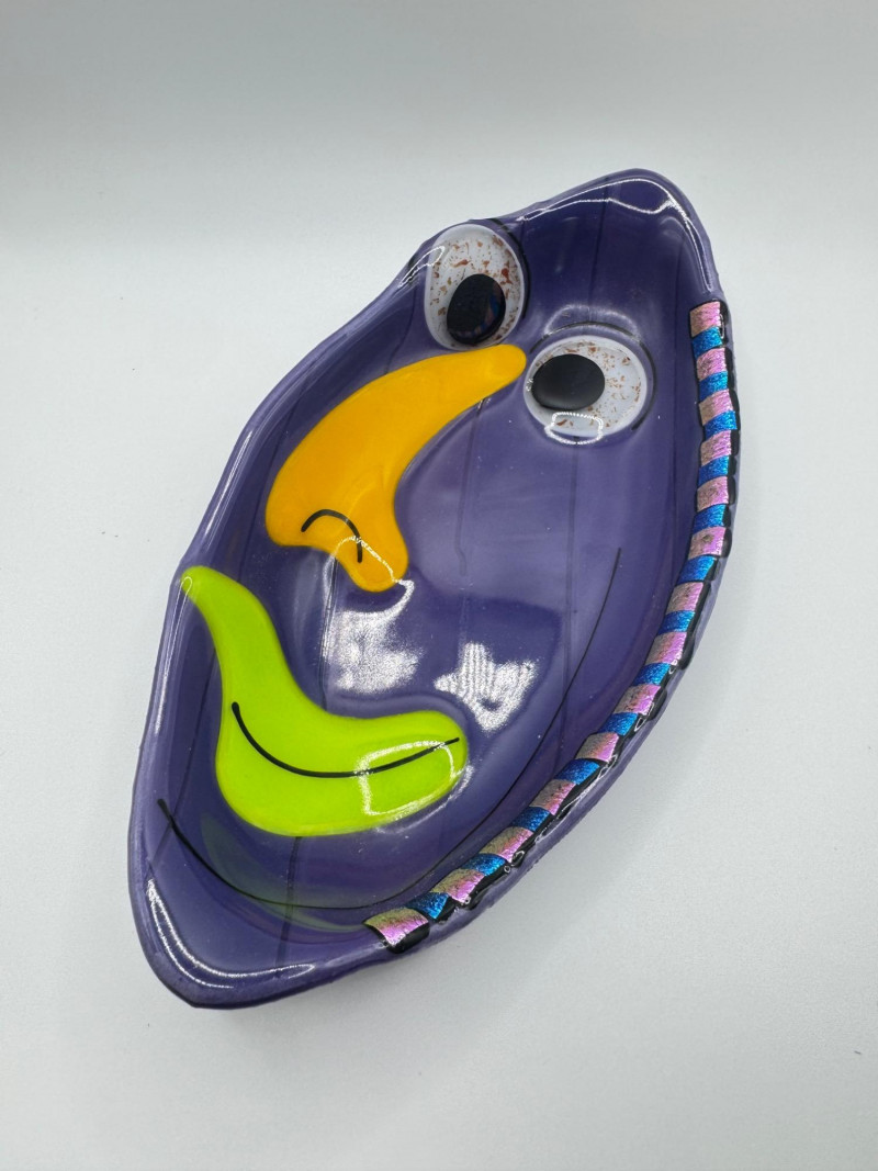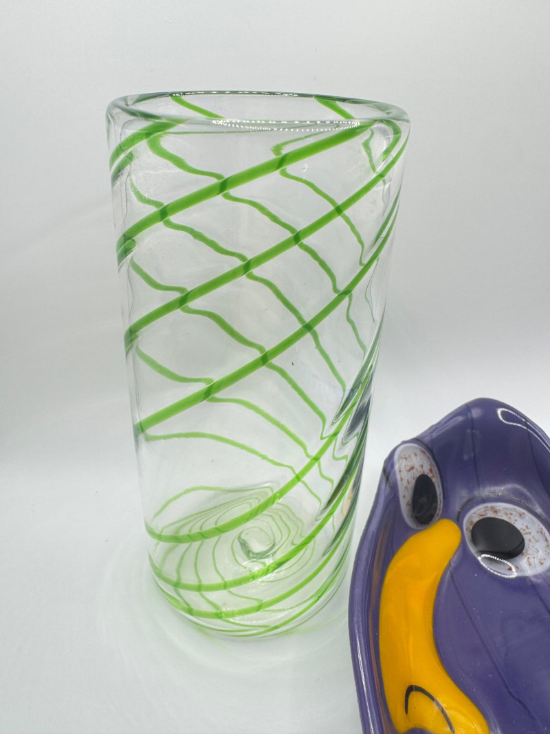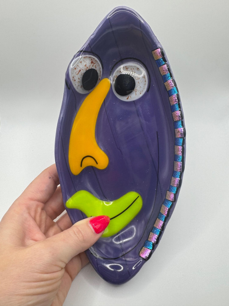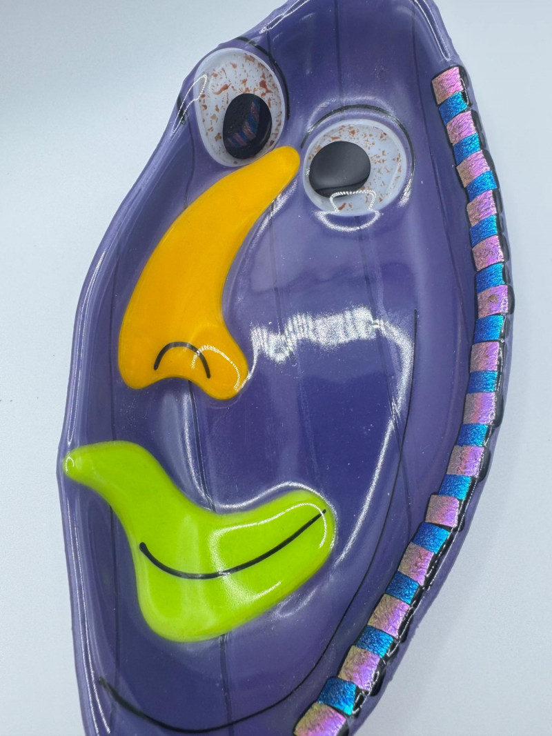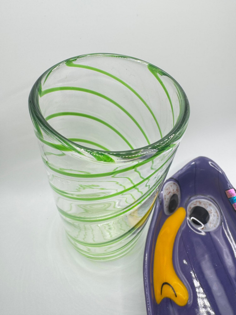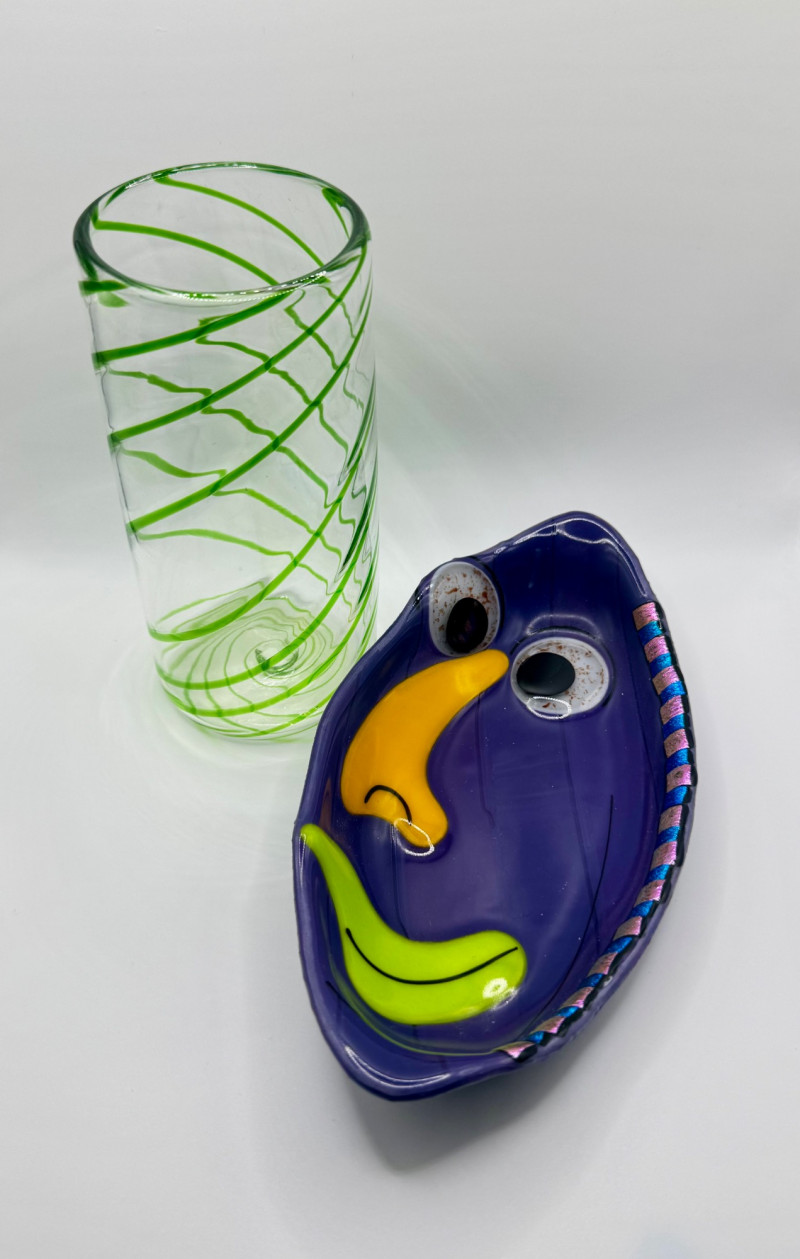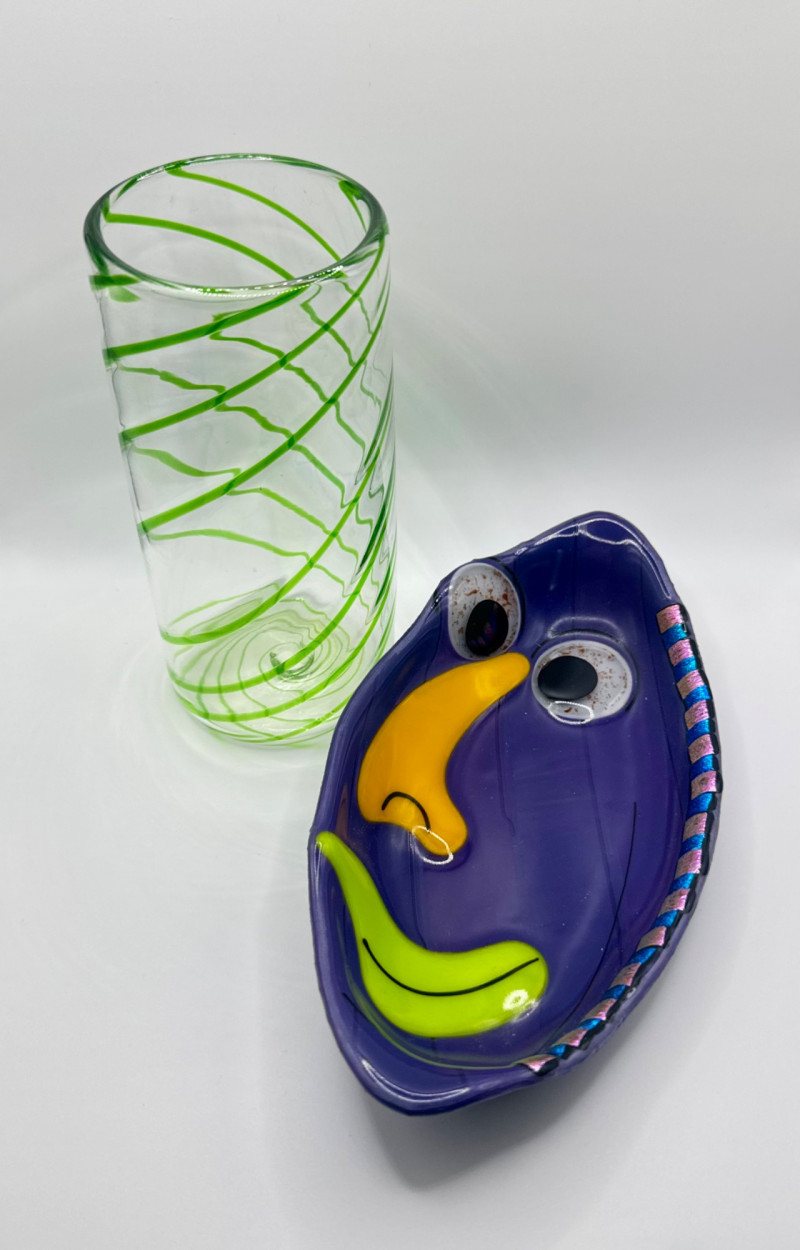 Curtiss Olson Fused Glass Face Dish '03 + Green Swirl Blown Glass Vase.