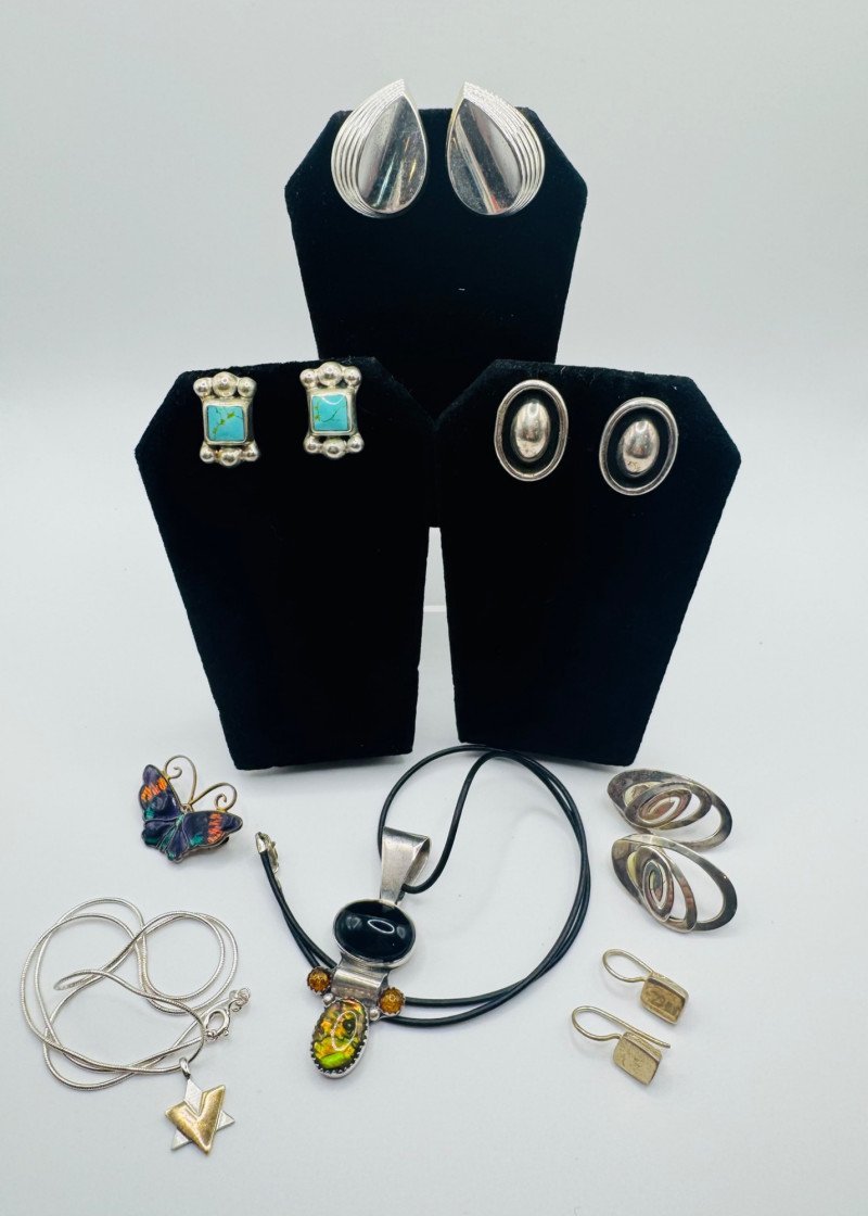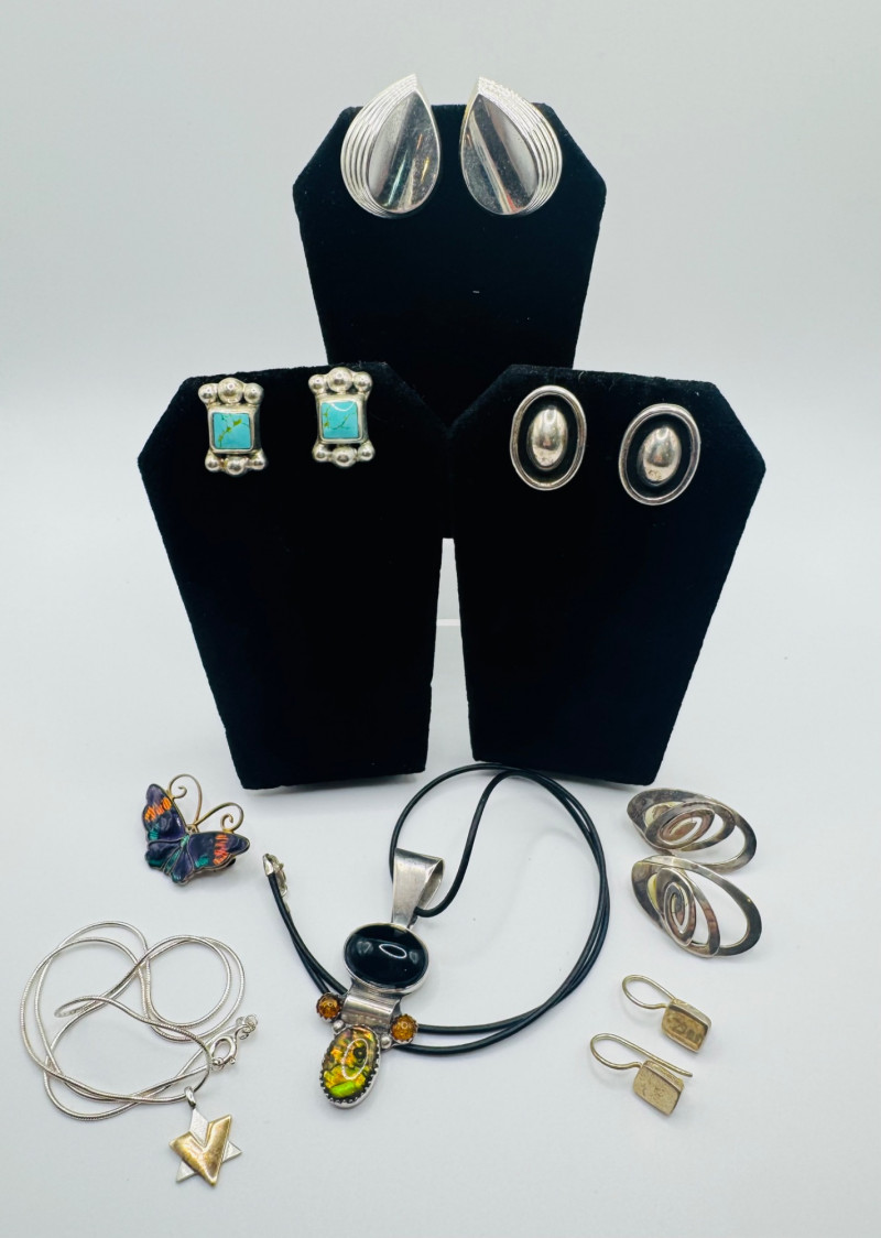Vintage & Modern Sterling Silver Jewelry – Earrings, Necklace, Brooch.