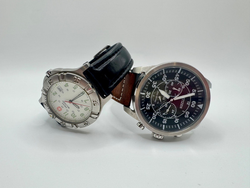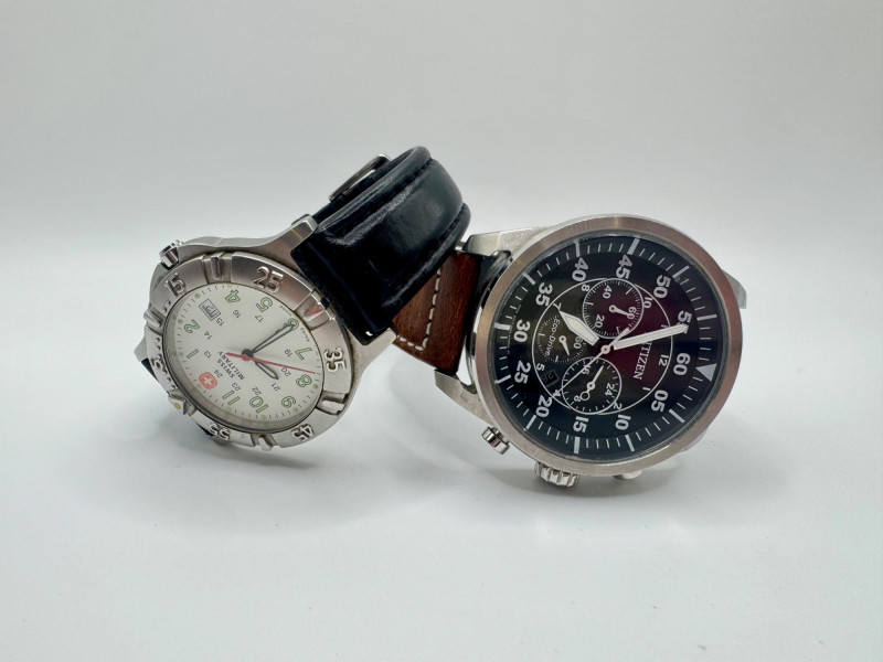 Citizen Eco-Drive Chronograph & Swiss Military Men’s Watches. Both watches show light wear consistent with use. Likely require new batteries. Swiss Military needs a replacement band.
