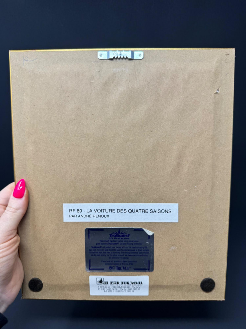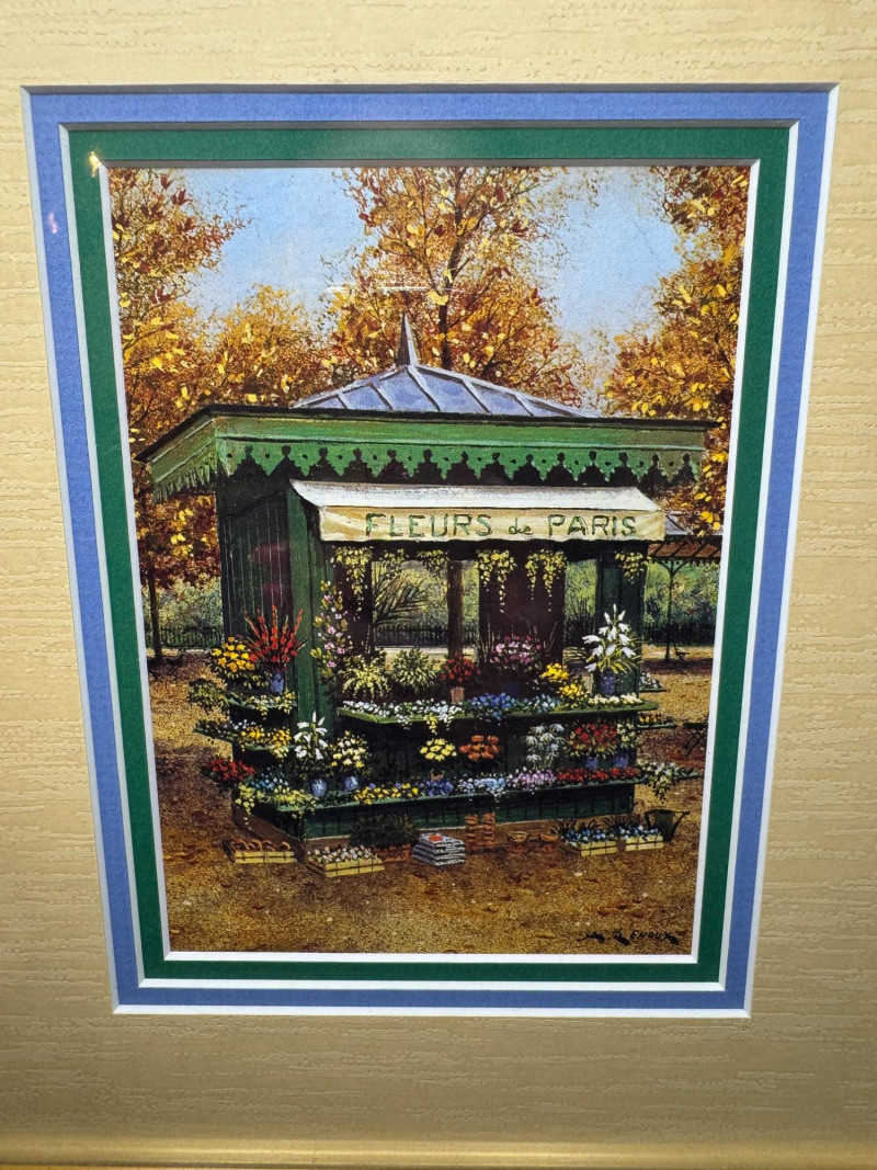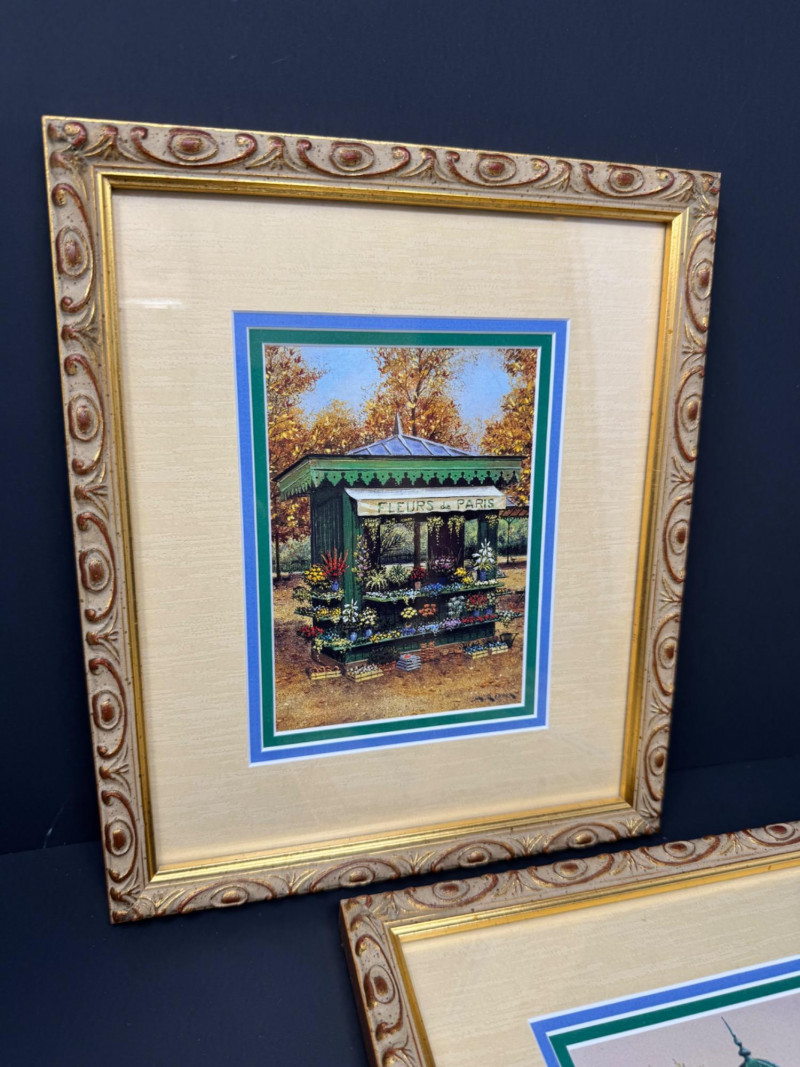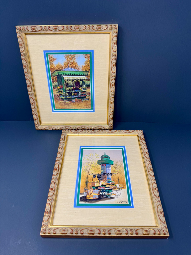 André Renoux Framed Signed Prints – La Voiture & Le Kiosque. Size: 9” x 11” each - Professionally framed. Titles: La Voiture des Quatre Saisons & Le Kiosque aux Fleurs