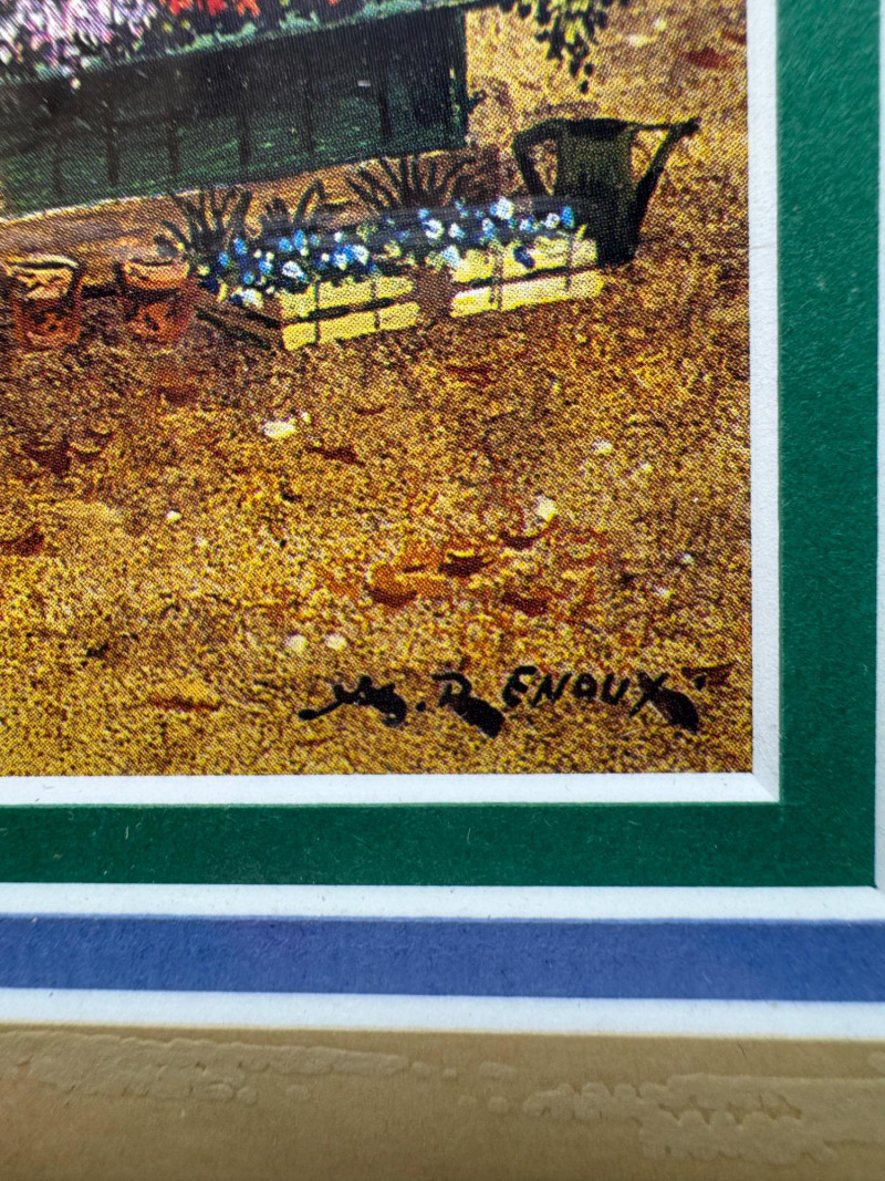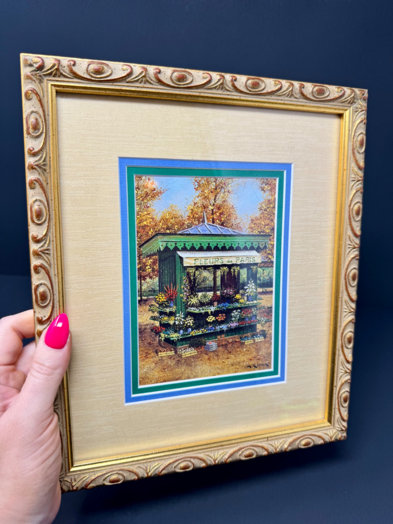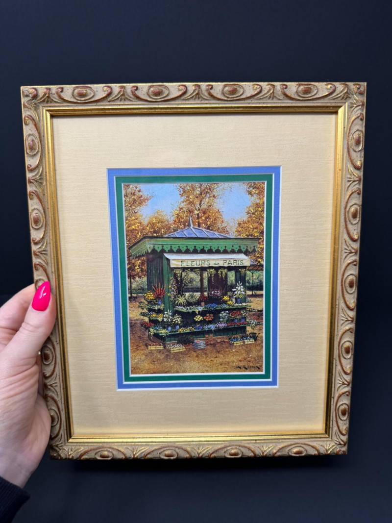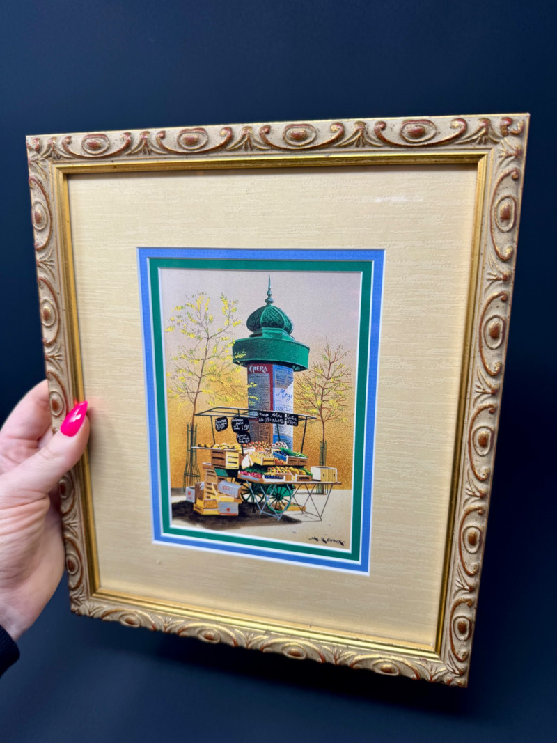 André Renoux Framed Signed Prints – La Voiture & Le Kiosque. Size: 9” x 11” each - Professionally framed. Titles: La Voiture des Quatre Saisons & Le Kiosque aux Fleurs